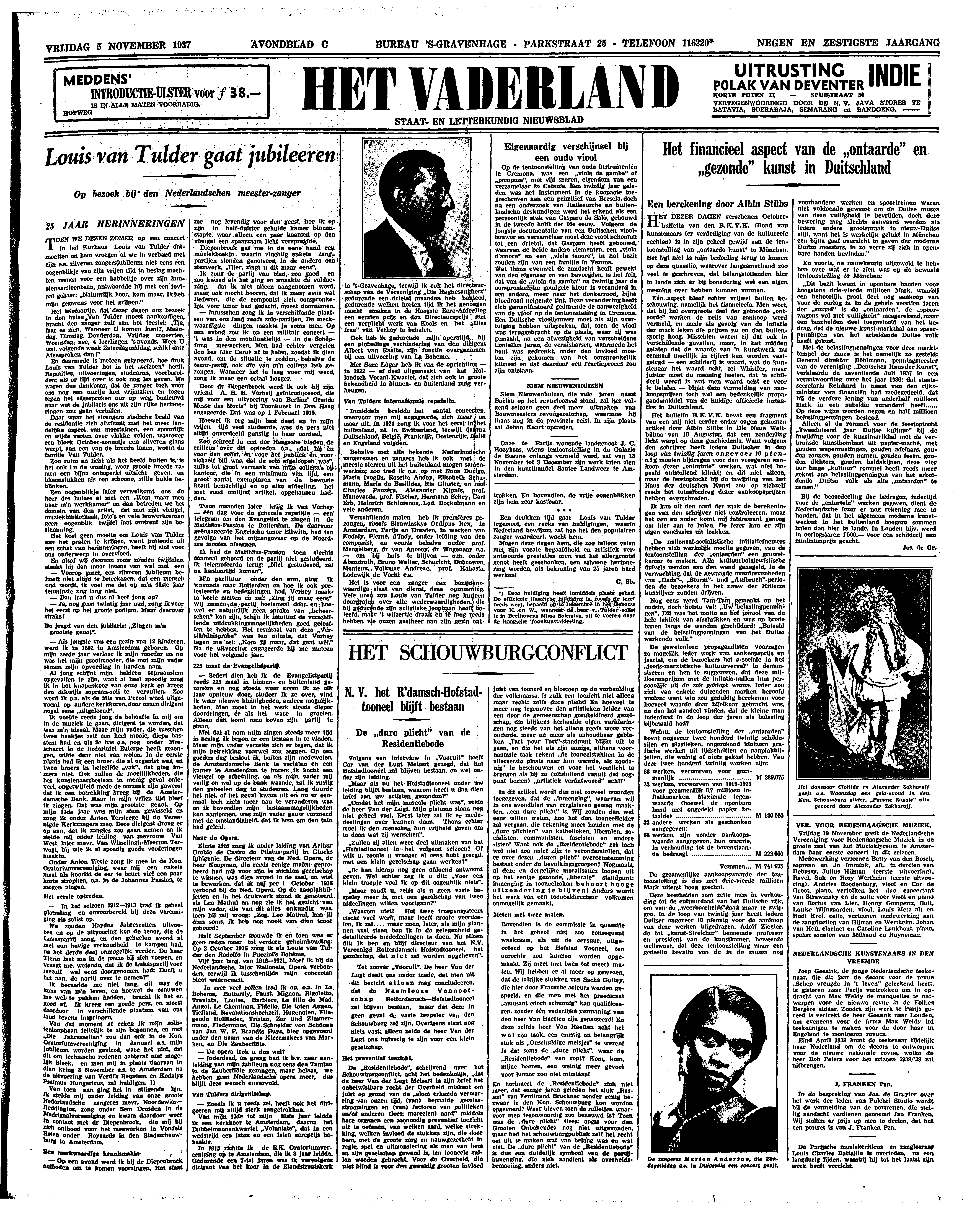 De ‘Residentiebode’, schrijvend over het Schouwburgconflict, acht het bedenkelijk, ‘dat de heer Van der Lugt Melsert in zijn brief het onbetwistbare recht der Overheid miskent om juist op grond van de “alom erkende verwarring van onzen tijd, (van) bepaalde geestesstroomingen en (van) factoren van politieken en/of anderen (lees: moreelen) aard” middels hare organen een zoonoodig preventief toezicht uit te oefenen, van welken aard, welke strekking, welken invloed de stukken zijn, die door hem, met de groote zorg en nauwgezetheid in regie, spel en uitmonstering als men van hem en zijn gezelschap gewend is, ten tooneel zullen worden gebracht. Voor de Overheid, die niet blind is voor den geweldig grooten invloed juist van tooneel en bioscoop op de verbeelding der volksmassa, is zulk een toezicht niet alleen maar recht: zelfs dure plicht! En hoeveel te meer nog tegenover den artistieken leider van een door de gemeenschap gesubsidieerd gezelschap, die blijkens herhaalde eigen verklaringen nog steeds van het allang reeds weer verouderde, meer en meer als onhoudbaar gebleken “l'art pour l'art”-standpunt blijkt uit te gaan, en die het als zijn eenige, althans voornaamste taak rekent “de tooneelstukken in de allereerste plaats naar hun waarde, als zoodanig” te beschouwen en voor het voetlicht te brengen als hij ze (uitsluitend vanuit dat oogpunt bezien) “artistiek verántwoord” acht!’