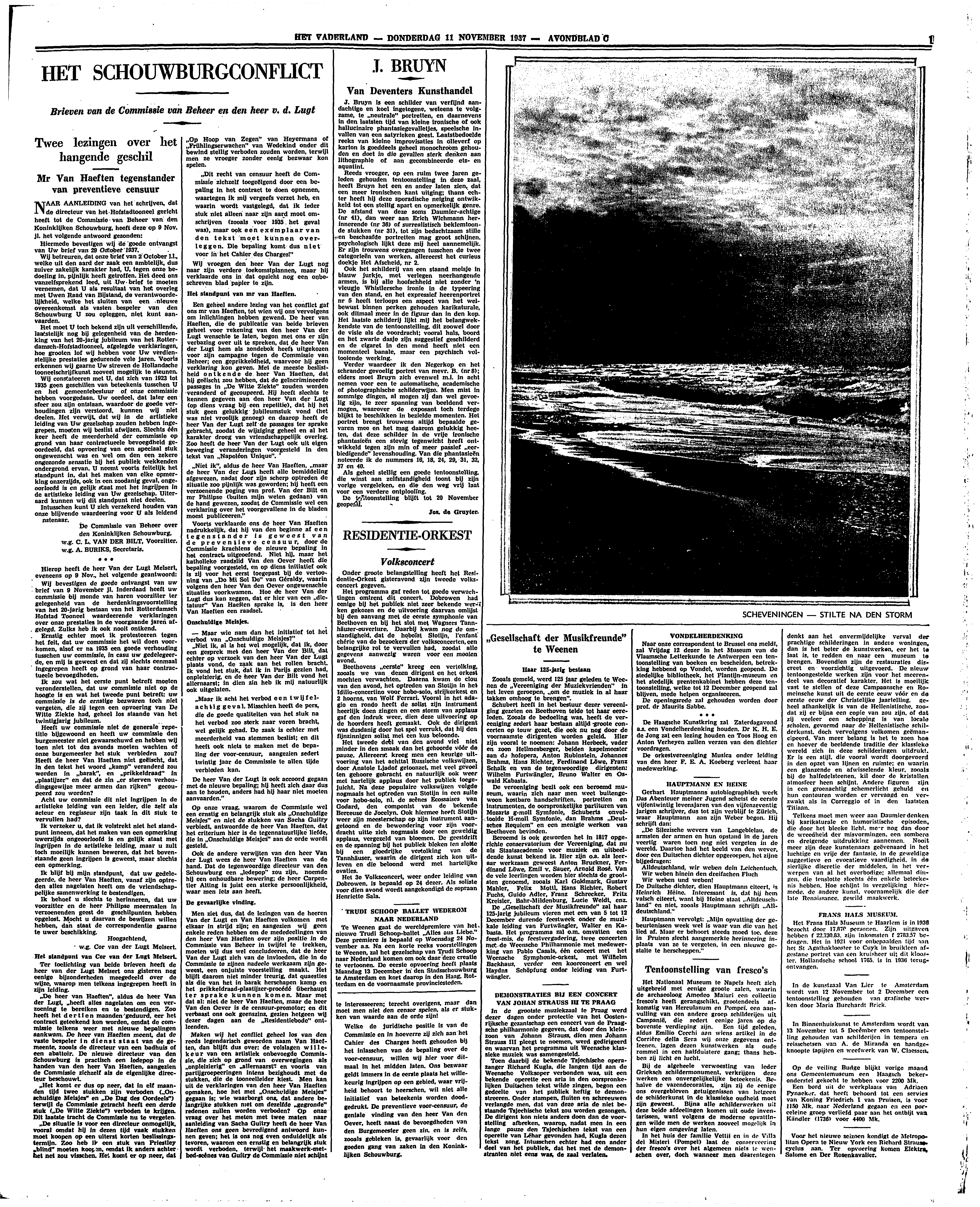 Voorts verklaarde ons de heer Van Haeften nadrukkelijk, dat hij van den beginne af een tegenstander is geweest van de preventieve censuur, door de Commissie krachtens de nieuwe bepaling in het contract uitgeoefend. Niet hij, maar het katholieke raadslid Van den Oever heeft die bepaling voorgesteld, en op diens initiatief ook is zij voor het eerst toegepast bij de vertooning van ‘Do Mi Sol Do’ van Géraldy, waarin volgens den heer Van den Oever ongewenschte situaties voorkwamen. Hoe de heer Van der Lugt dus kan zeggen, dat er hier van een ‘dictatuur’ Van Haeften sprake is, is den heer Van Haeften een raadsel.
