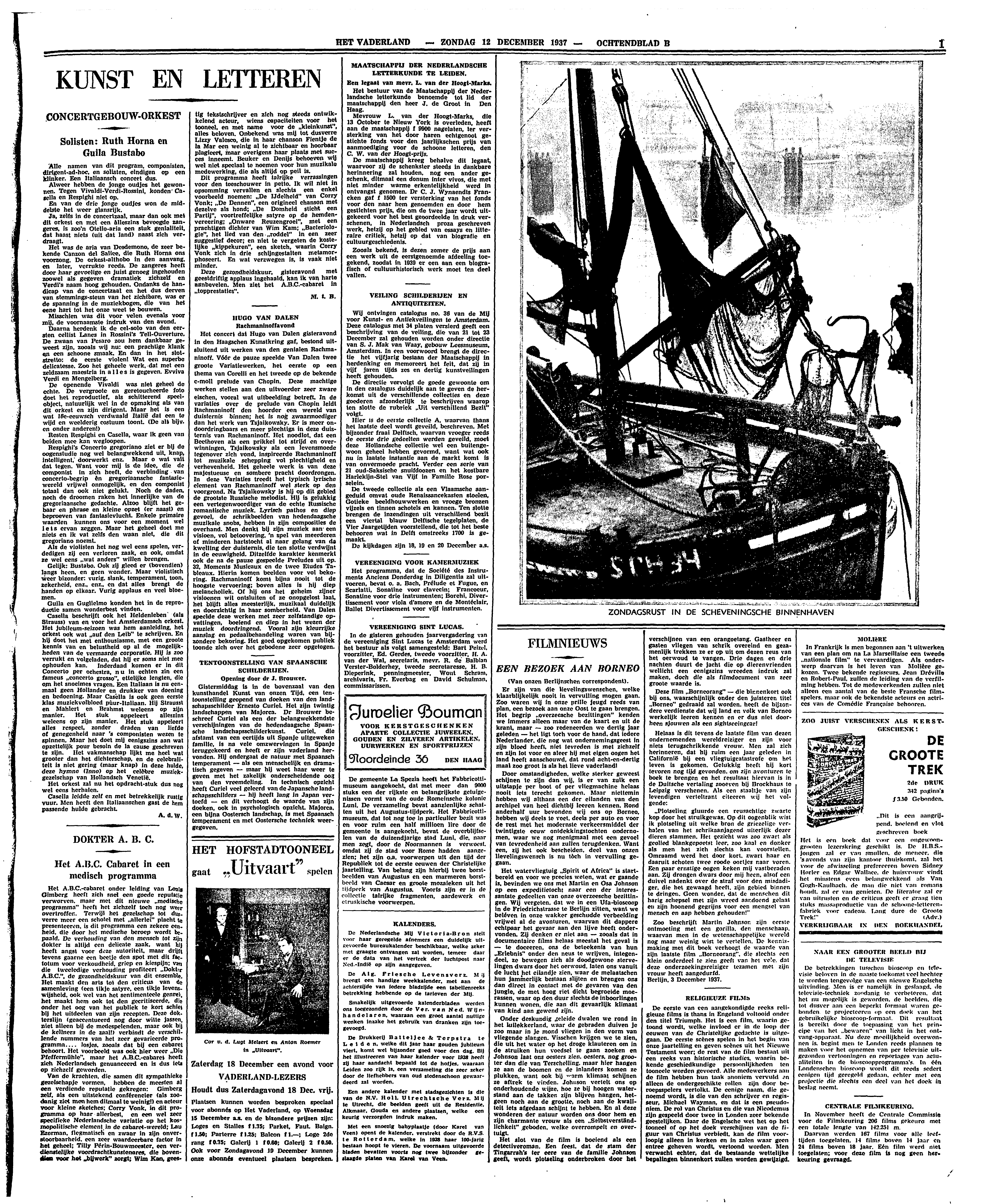 Van de krachten, die samen dit sympathieke gezelschapje vormen, hebben de meesten al een verdiende reputatie gekregen: Gimberg zelf, als een uitstekend conférencier (als zoodanig ziet men hem ditmaal te weinig!) en acteur voor kleine sketches; Corry Vonk, in dit programma op haar allerbest, en een wel zeer specifieke Nederlandsche variatie op het kosmopolitische element in de cabaret-wereld; Lau Ezerman, flegmatisch en zwaar in zijn onverstoorbaarheid, een zeer waardeerbare factor in het geheel; Tilly Périn-Bouwmeester, een verdienstelijke voordrachtkunstenares, die bovendien voor het ‘bijwerk’ zorgt; Wim Kan, geestig tekstschrijver en zich nog steeds ontwikkelend acteur, wiens capaciteiten voor het tooneel, en met name voor de ‘kleinkunst’, alles beloven. Onbekend was mij tot dusverre Lizzy Valesco, die in haar chanson Fientje de la Mar een weinig al te zichtbaar en hoorbaar plagieert, maar overigens haar plaats met succes inneemt. Beuker en Denijs behoeven wij wel niet speciaal te noemen voor hun muzikale medewerking, die als altijd op peil is.
