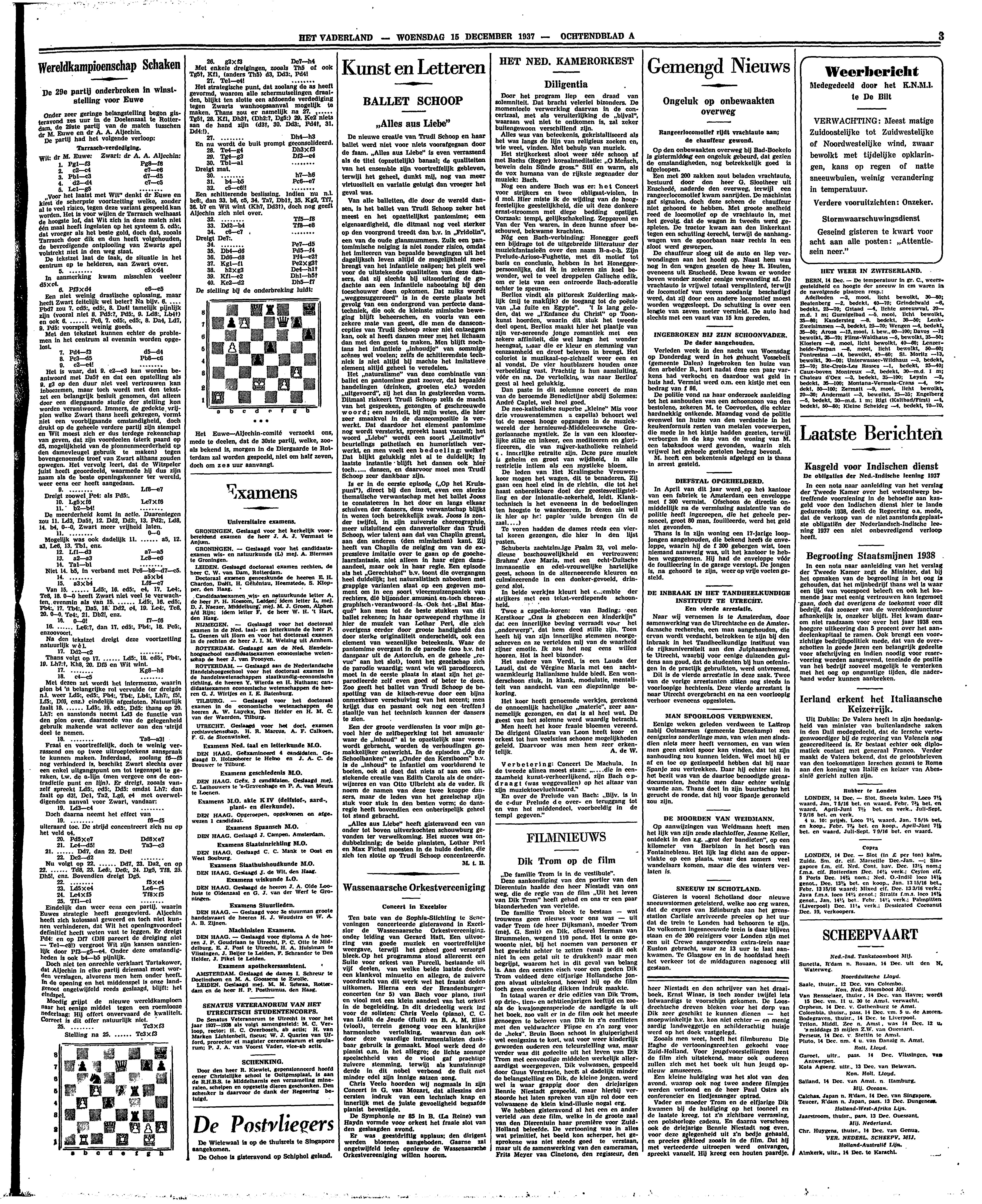 Is er in de eerste episode (‘Op het Kruispunt’), direct bij den inzet, even een sterke thematische verwantschap met het ballet Jooss te constateeren in het door en langs elkaar schuiven der dansers, deze verwantschap blijkt in wezen toch betrekkelijk zwak. Jooss is zonder twijfel, in zijn zuiverste choreographie, meer uitsluitend een dansvertolker dan Trudi Schoop, wier talent aan dat van Chaplin grenst, aan den anderen (den mimischen) kant. Zij heeft van Chaplin de neiging om van de expressieve imitatie over te gaan op de goochelaarsfantasie, niet alleen in haar eigen dansaandeel, maar ook in haar regie. Een episode als het ‘Gerechtshof’ b.v. toont die overgangen heel duidelijk; het naturalistisch nabootsen met grappige varianten slaat op een gegeven moment om in een soort vleermuizenpaniek van rechters, die bijzonder amusant en toch choreographisch verantwoord is. Ook het ‘Bal Masqué’ kan men tot de beste stukken van dit ballet rekenen; in haar opzweepend rhythme is hier de muziek van Lothar Perl, die zich overigens eerder door groote handigheid dan door sterke originaliteit onderscheidt, ook een element van wezenlijke beteekenis. Waar de pantomime overgaat in de parodie (zoo b.v. het danspaar uit de Astorclub, en de geheele ‘revue’ aan het slot), toont het gezelschap zich de parodie waardig; want wie wil parodieeren, moet in de eerste plaats in staat zijn het geparodieerde zelf even goed of beter te doen. Zoo geeft het ballet van Trudi Schoop de bespotting van de kitsch-revue door een bijna onmerkbare verschuiving van het accent; men krijgt dus en passant ook nog een treffend staaltje van het technisch kunnen der dansers te zien.