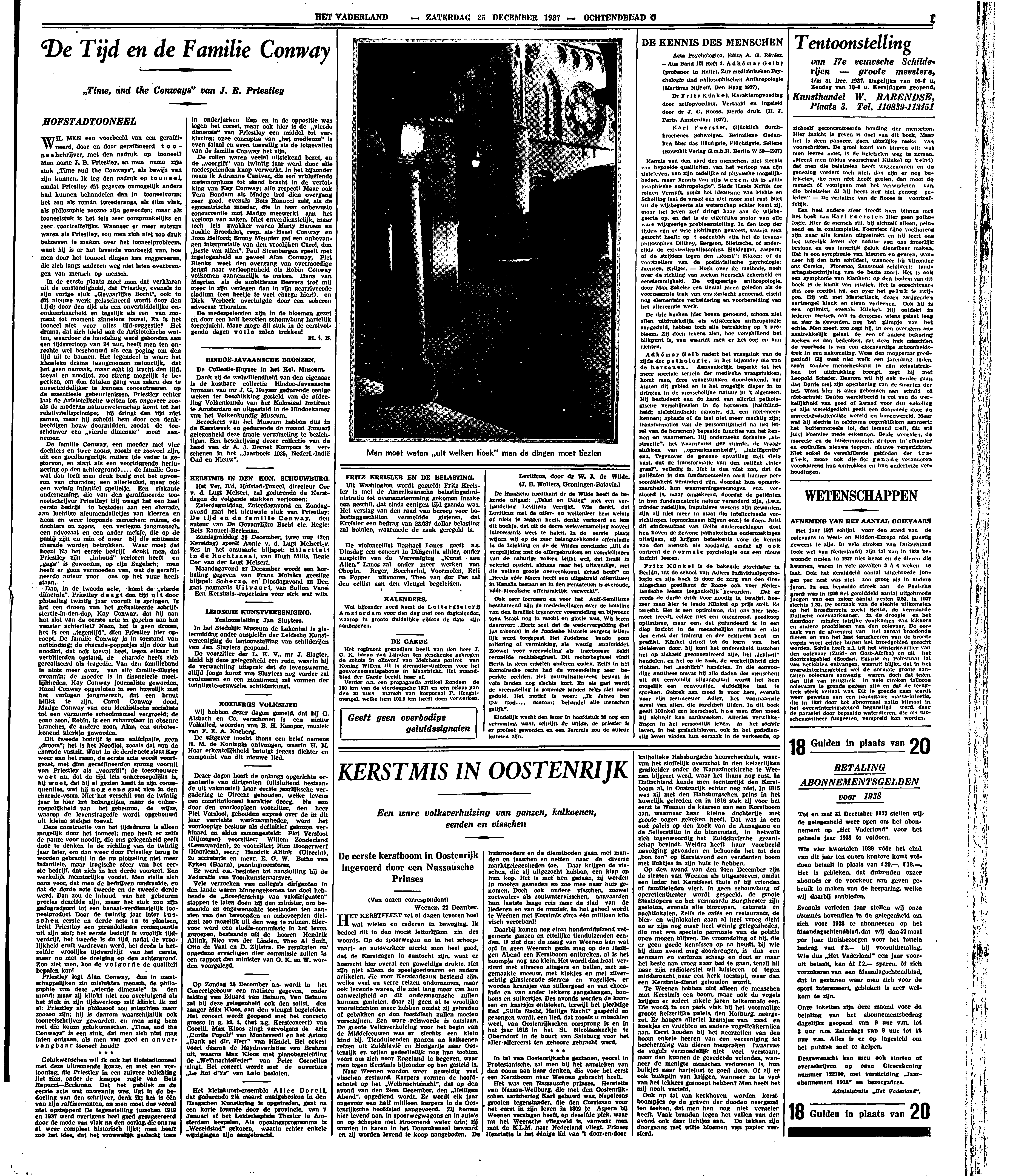 Gelukwenschen wil ik ook het Hofstadtooneel met deze uitnemende keuze, en met een vertooning, die Priestley in een zuivere belichting liet zien, onder de knappe regie van Bets Ranucci - Beckman. Dat het publiek na de eerste acte wat onwennig was, ligt in de bedoeling van den schrijver, denk ik; het is één van zijn raffinementen, en men moet dus vooral niet opstappen! De tegenstelling tusschen 1919 en 1937 werd overigens heel goed gesuggereerd door de mode van vlak na den oorlog, die ons nu al weer compleet historisch lijkt; men heeft zoo het idee, dat het vrouwelijk geslacht toen in onderjurken liep en in de oppositie was tegen het corset, maar ook hier is de ‘vierde dimensie’ van Priestley een middel tot verklaring: onze conceptie van ‘het modieuze’ is even fataal en even toevallig als de lotgevallen van de familie Conway het zijn.