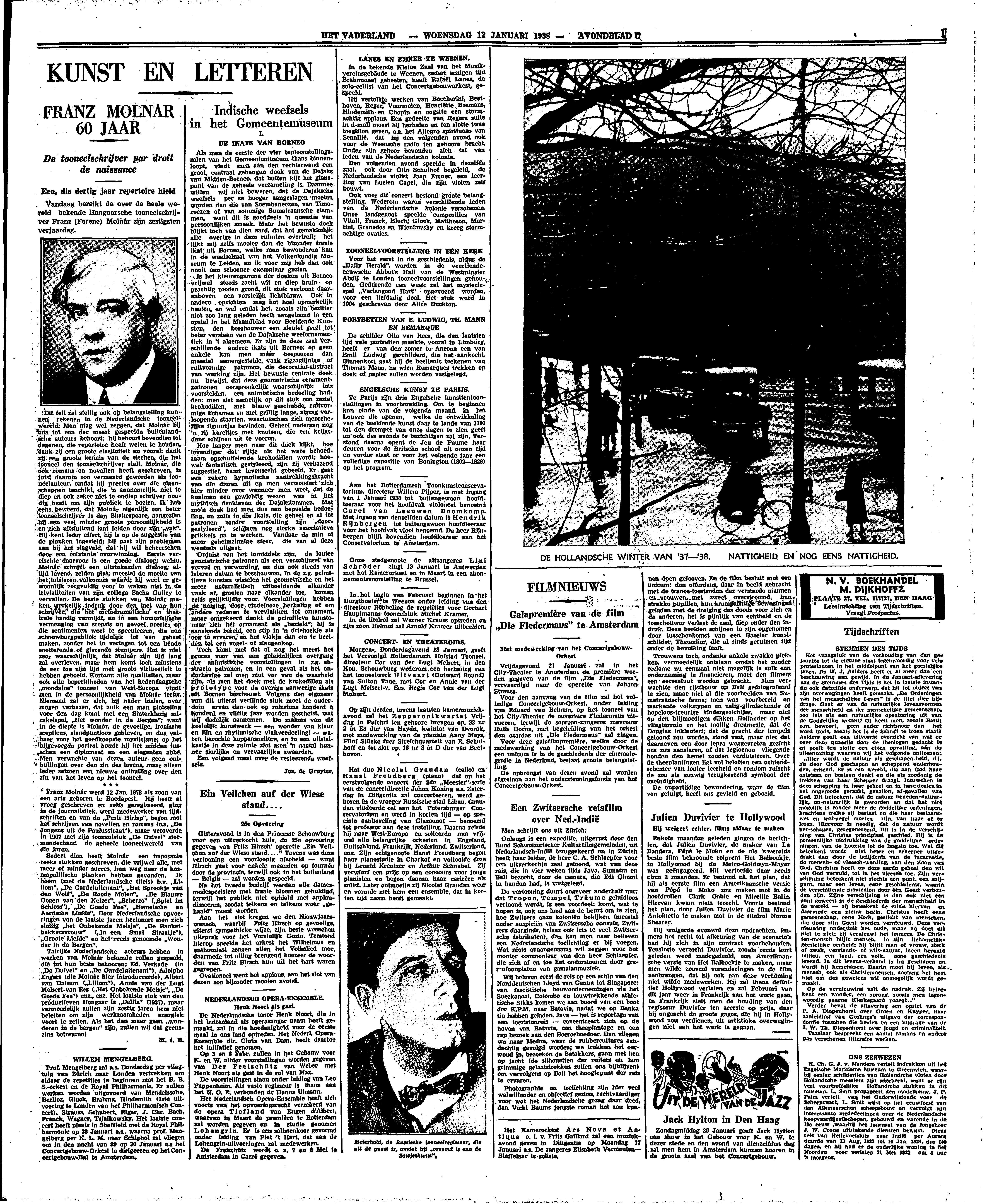 Talrijke Nederlandsche acteurs hebben in werken van Molnár bekende rollen gespeeld, die tot hun beste behooren: Ed. Verkade (in ‘De Duivel’ en ‘De Gardeluitenant’), Adolphe Engers (die Molnàr hier introduceerde), Albert van Dalsum (‘Liliom’), Annie van der Lugt Melsert-van Ees (‘Het Onbekende Meisje’, ‘De Goede Fee’) enz., enz. Het laatste stuk van den productieven Hongaar is ‘Delila’ (1937), maar vermoedelijk zullen zijn zestig jaren hem niet beletten om zijn werkzaamheden energiek voort te zetten. Als het dan maar geen ‘wonderen in de bergen’ zijn, zullen wij dat geenszins betreuren!