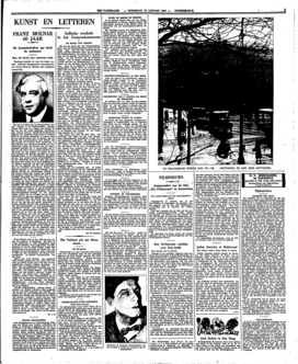 Dit feit zal stellig ook op belangstelling kunnen rekenen in de Nederlandsche tooneelwereld. Men mag wel zeggen, dat Molnár bij ons tot een der meest gespeelde buitenlandsche auteurs behoort; hij behoort bovendien tot degenen, die repertoire heeft weten te houden, dank zij een groote elasticiteit en vooral: dank zij een groote kennis van de eischen, die het tooneel den tooneelschrijver stelt. Molnár, die ook romans en novellen heeft geschreven, is juist daarom zoo vermaard geworden als tooneelauteur, omdat hij precies over die eigenschappen beschikt, die 'n aannemelijk, niet te diep en ook zeker niet te ondiep schrijver noodig heeft om zijn publiek te boeien. Ik heb eens beweerd, dat Molnár eigenlijk een beter tooneelschrijver is dan Shakespeare, aangezien hij een veel minder groote persoonlijkheid is en zich uitsluitend laat leiden door zijn ‘vak’. Hij kent ieder effect, hij is op de suggestie van de planken ingesteld; hij past zijn problemen aan bij het slagveld, dat hij wil beheerschen door een eclatante overwinning. Eerste vereischte daarvoor is een goede dialoog; welnu, Molnár schrijft een uitstekenden dialoog; altijd levend, zelden plat, meestal de moeite van het luisteren volkomen waard; hij weet er gewoonlijk zorgvuldig voor te waken niet in de trivialiteiten van zijn collega Sacha Guitry te vervallen. De beste stukken van Molnár maken werkelijk indruk door den tact van hun schrijver, die het melodramatische en theatrale handig vermijdt, en in een humoristische vermenging van scepsis en gevoel precies op die sentimenten weet te speculeeren, die een schouwburgpubliek tijdelijk tot een geheel maken, zonder het te verlagen tot een bende snotterende of gierende stumpers. Het is niet zeer waarschijnlijk, dat Molnár zijn tijd lang zal overleven, maar hem komt toch minstens de eer toe zijn tijd met groote virtuositeit te hebben geboeid. Kortom: alle qualiteiten, maar ook alle beperktheden van het hedendaagsche ‘mondaine’ tooneel van West-Europa vindt men in de persoonlijkheid van Molnár terug. Niemand zal er zich, bij nader inzien, over mogen verbazen, dat zulk een man plotseling voor den dag komt met een Sinterklazig mirakelspel, ‘Het wonder in de Bergen’; want in de diepte is Molnár, de gevoelige, ironische scepticus, standpuntloos gebleven, en dus vatbaar voor het goedkoopste mysticisme; op het bijgevoegde portret houdt hij het midden tusschen een diplomaat en een eleganten abbé. Men verwachte van dezen auteur geen onthullingen over den zin des levens, maar alleen ieder seizoen een nieuwe onthulling over den zin van het leven op het tooneel.