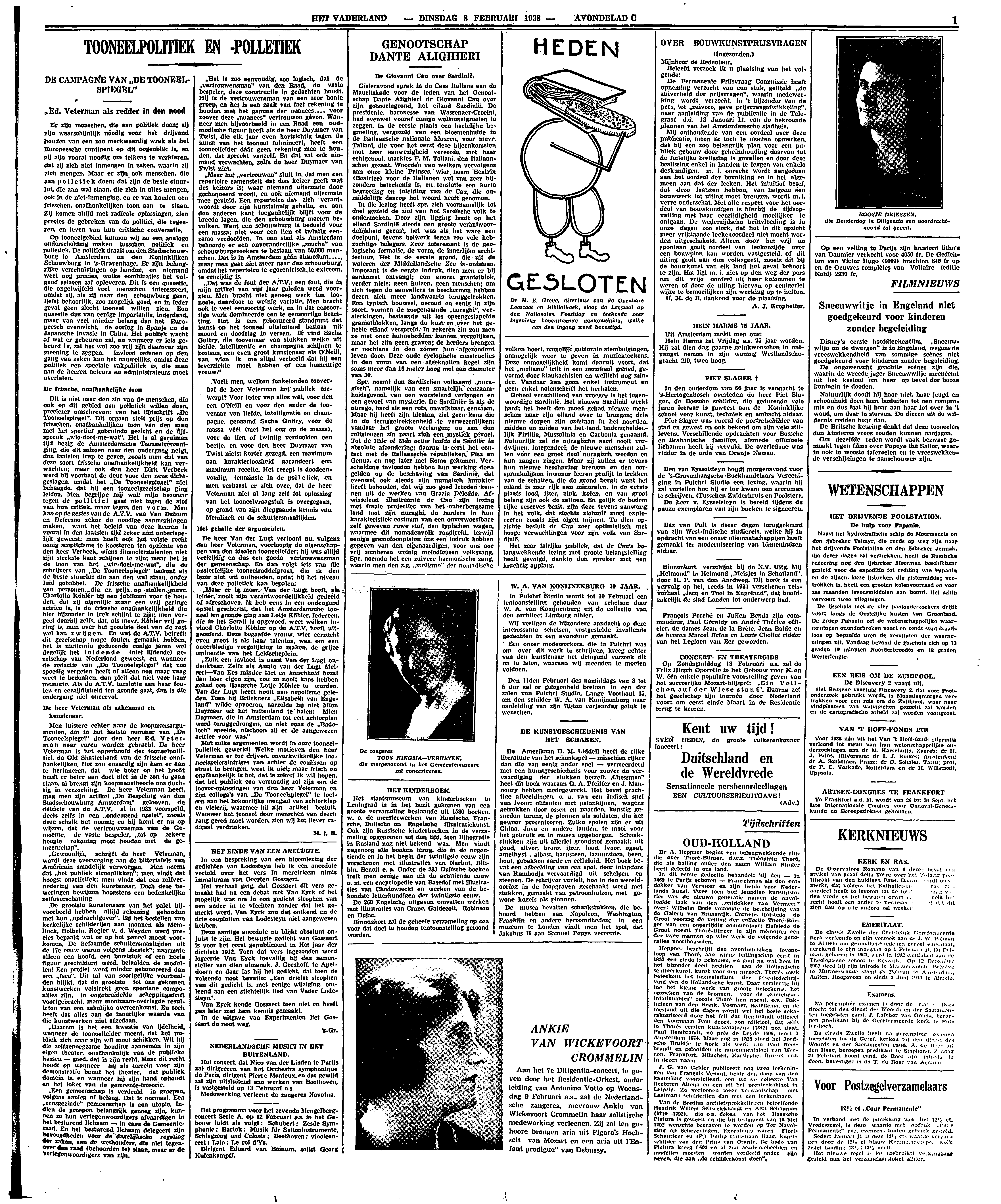 Op tooneelgebied kunnen wij nu een analoge onderscheiding maken tusschen politiek en polletiek. De politiek draait om den Stadsschouwburg te Amsterdam en den Koninklijken Schouwburg te 's-Gravenhage. Er zijn belangrijke verschuivingen op handen, en niemand weet nog precies, welke combinaties het volgend seizoen zal opleveren. Dit is een quaestie, die ongetwijfeld veel menschen interesseert, omdat zij, als zij naar den schouwburg gaan, liefst behoorlijk, zoo mogelijk goed, en in ieder geval geen slecht tooneel willen zien. Een quaestie dus van eenige importantie, inderdaad, maar van veel minder belang dan het Europeesch evenwicht, de oorlog in Spanje en de Japansche invasie in China. Het publiek wacht af wat er gebeuren zal, en wanneer er iets gebeurd is, zal het wel zoo vrij zijn daarover zijn meening te zeggen. Invloed oefenen op den gang van zaken kan het nauwelijks, omdat deze politiek een speciale vakpolitiek is, die men aan de heeren acteurs en administrateurs moet overlaten.