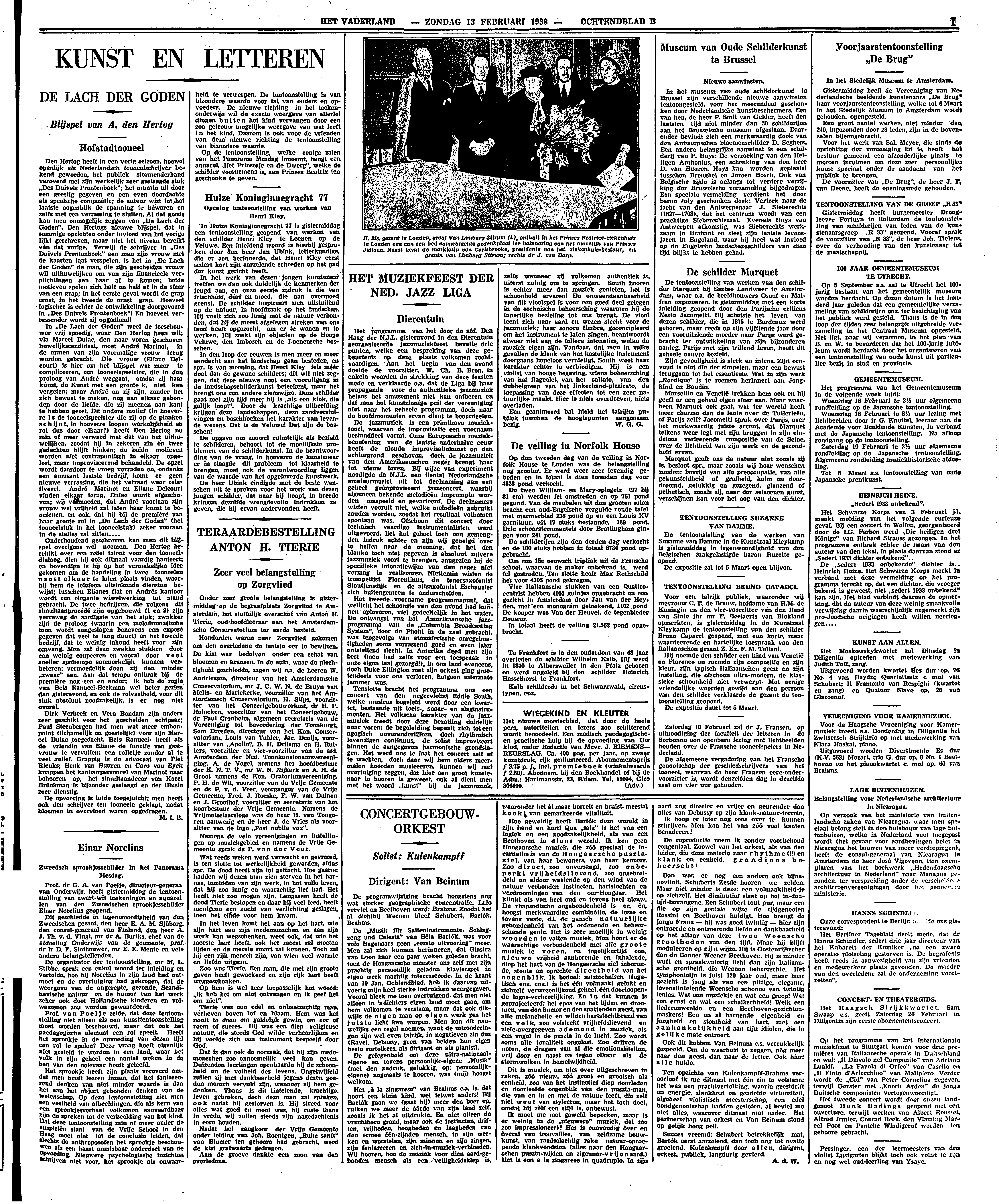 Den Hertog heeft in een vorig seizoen, hoewel openlijk als Nederlandsch tooneelschrijver bekend geworden, het publiek stormenderhand veroverd met zijn werkelijk zeer geslaagde stuk ‘Des Duivels Prentenboek’; het muntte uit door een geestig gegeven en een even doordachte als speelsche compositie; de auteur wist tot het laatste oogenblik de spanning te bewaren en zelfs met een verrassing te sluiten. Al dat goeds kan men onmogelijk zeggen van ‘De Lach der Goden’, Den Hertogs nieuwe blijspel, dat in sommige opzichten onder invloed van het vorige lijkt geschreven, maar niet het niveau bereikt van dat vorige. Terwijl de schrijver in ‘Des Duivels Prentenboek’ een man zijn vrouw met de kaarten laat verspelen, is het in ‘De Lach der Goden’ de man, die zijn gescheiden vrouw wil uithuwelijken om van zijn financieele verplichtingen aan haar af te komen; beide motieven spelen zich half en half af in de sfeer van een grap; in het eerste geval wordt de grap ernst, in het tweede de ernst grap. Hoeveel logischer is echter de ontwikkeling doorgevoerd in ‘Des Duivels Prentenboek’! En hoeveel verrassender wordt zij opgediend!