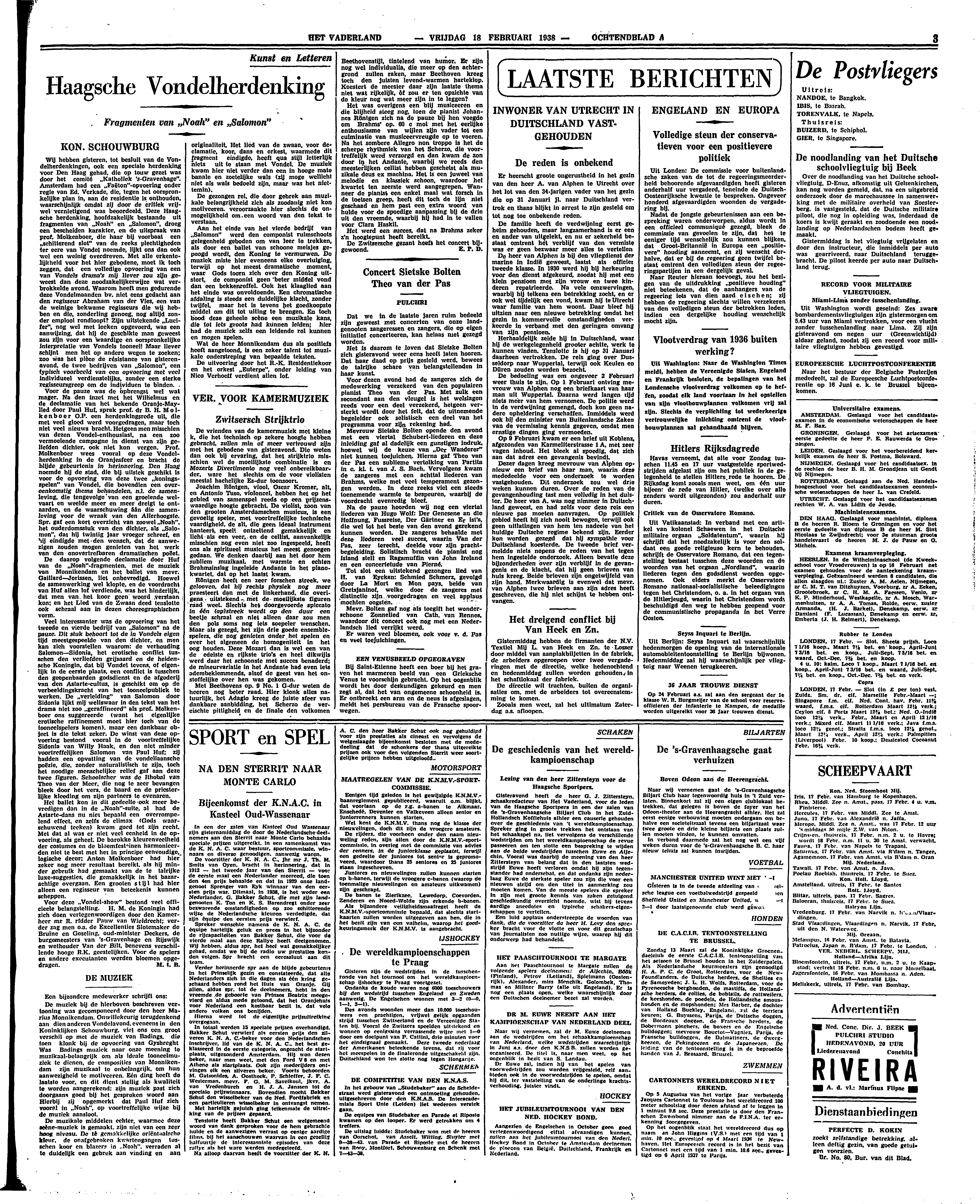 Wij hebben gisteren, tot besluit van de Vondelherdenkingen, ook een speciale herdenking voor Den Haag gehad, die op touw gezet was door het comité ‘Katholiek 's-Gravenhage’. Amsterdam had een ‘Faëton’-opvoering onder regie van Ed. Verkade, die, tegen het oorspronkelijke plan in, aan de residentie is onthouden, waarschijnlijk omdat zij door de critiek vrijwel vernietigend was beoordeeld. Deze Haagsche herdenking, hoofdzakelijk bestaande uit fragmenten van ‘Noah’ en ‘Salomon’, droeg een bescheiden karakter, en de uitspraak van prof. Molkenboer, die haar bij voorbaat een ‘schitterend slot’ van de reeks plechtigheden ter eere van Vondel noemde, lijkt ons dan ook wel een weinig overdreven. Met alle erkentelijkheid voor het hier gebodene, moet ik toch zeggen, dat een volledige opvoering van een van Vondels drama's mij liever zou zijn geweest dan deze noodzakelijkerwijze wat verbrokkelde avond. Waarom heeft men gedurende deze Vondelmaanden bv. niet eens gedacht aan den regisseur Abraham van der Vies, een van de weinige bekwame regisseurs die wij hebben en die, zonderling genoeg, nog altijd zonder emplooi rondloopt? Zijn uitstekende ‘Lucifer’, nog wel met leeken opgevoerd, was een aanwijzing, dat hij de geschikte man geweest zou zijn voor een waardige en oorspronkelijke interpretatie van Vondels tooneel! Maar liever schijnt men het op andere wegen te zoeken; zoo was het pièce de résistance van gisterenavond, de twee bedrijven van ‘Salomon’, een typisch voorbeeld van een opvoering met veel individueel verdienstelijks, zonder een sterke regisseursgreep om de individuen te binden.
