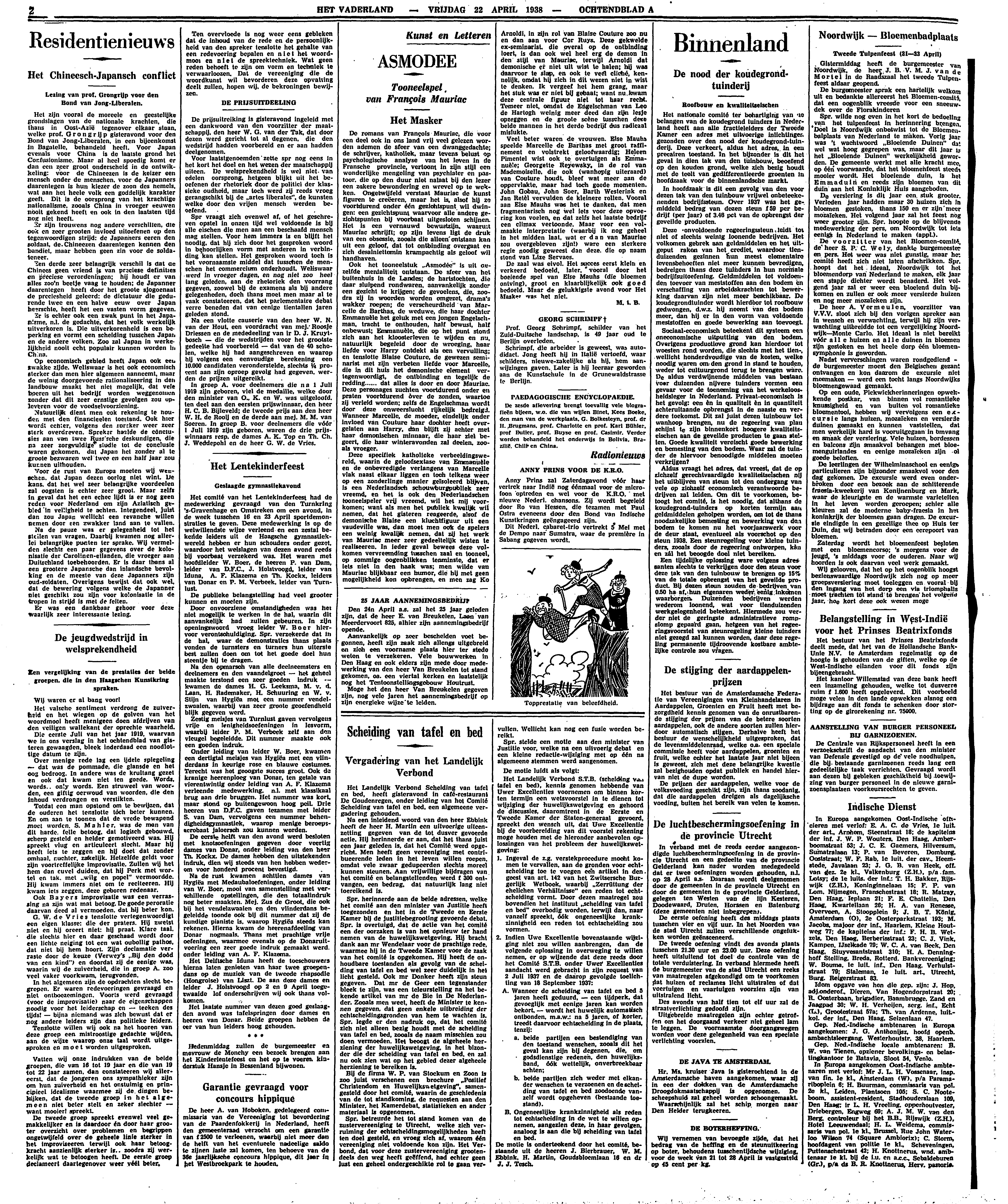 Ook het tooneelstuk ‘Asmodée’ is uit dezelfde mentaliteit ontstaan. De sfeer van het buitenhuis in de Landes; de hartstochten, die daar sluipend rondwaren, aanvankelijk zonder een gezicht te krijgen; de gevoelens, die, zoodra zij in woorden worden omgezet, drama's wakker roepen; de verscheurdheid van Marcelle de Barthas, de weduwe, die haar dochter Emmanuèle het geluk met een jongen Engelschman, tracht te onthouden, half bewust, half onbewust; Emmanuèle, die op het punt stond zich aan het kloosterleven te wijden en nu, natuurlijk begeleid door de wroeging, haar liefde voor Harry ontdekt als een vervulling; en tenslotte Blaise Couture, de gewezen seminarist met zijn verbeten liefde voor Marcelle, die in dit huis het demonische element vertegenwoordigt, de ontbinding en tegelijk de redding...... dat alles is door en door Mauriac. Deze personages zuchten voortdurend onder en praten voortdurend òver de zonden, waartoe zij verleid worden; zelfs de Engelschman wordt door deze onweerslucht rijkelijk bedreigd. Wanneer Marcelle, de moeder, eindelijk onder invloed van Couture haar dochter heeft overgelaten aan Harry, dan blijft zij achter met haar demonischen minnaar, die haar ziel begeert, die haar winteravonden zal deelen, zooals vroeger.