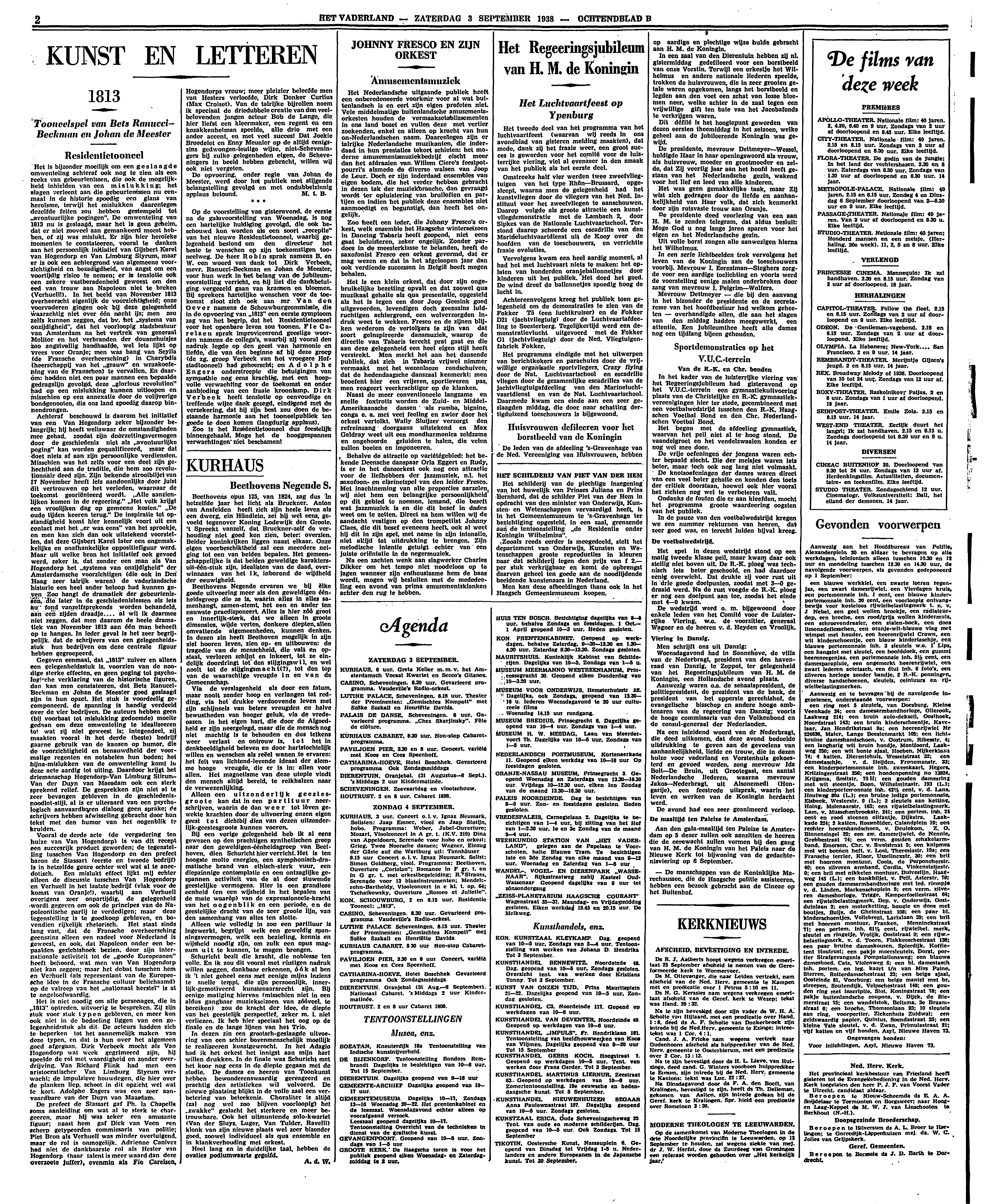 Gegeven eenmaal, dat ‘1813’ zuiver en alleen een gelegenheidsstuk is, voorzien van de noodige sterke effecten, en geen poging tot psychologische verklaring van de historische figuren, dan kan men constateeren, dat Bets Ranucci-Beckman en Johan de Meester goed geslaagd zijn in hun opzet. Het stuk is voordeelig gecomponeerd, de spanning is handig verdeeld over de vier bedrijven. De auteurs hebben geen (bij voorbaat tot mislukking gedoemde) moeite gedaan om deze omwenteling te idealiseeren tot wat zij niet geweest is; integendeel, zij maakten vooral in het derde (beste) bedrijf gaarne gebruik van de kansen op humor, die de voorzichtigheid en benauwdheid der voormalige regenten en notabelen hun boden; het bijna-mislukken van de omwenteling komt in deze acte aardig tot uiting. Daardoor krijgt het driemanschap Hogendorp-Van Limburg Stirum-Van der Duyn van Maesdam ook een sterk sprekend relief. De gesprekken zijn niet al te zeer bevangen gebleven in de geschiedenisnoodlot-stijl, al is er uiteraard van een psychologisch aanvaardbaren dialoog geen sprake; de schrijvers hebben afwisseling gebracht door hun tekst met den humor van het oogenblik te kruiden.