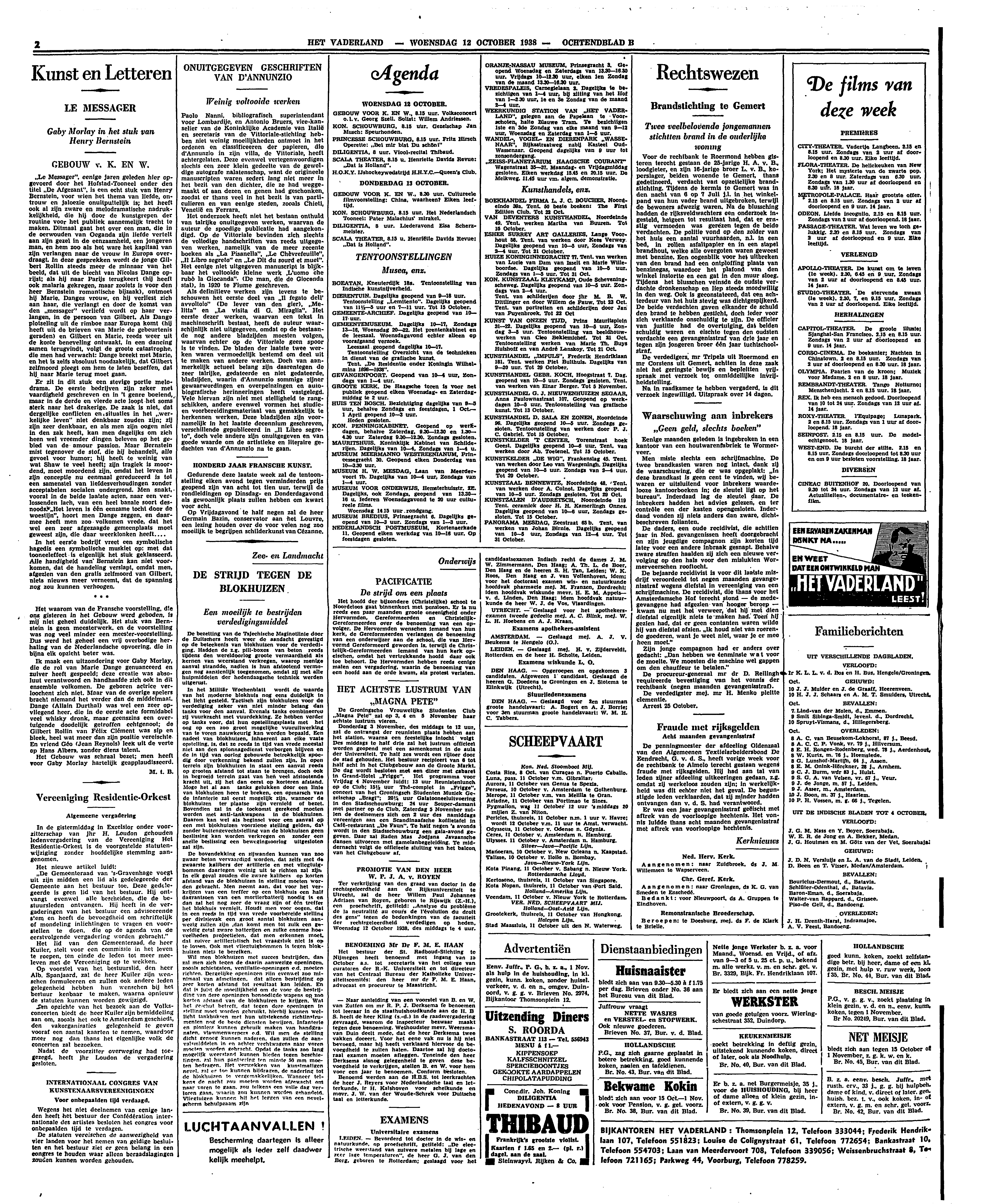 ‘Le Messager’, eenige jaren geleden hier opgevoerd door het Hofstad-Tooneel onder den titel ‘De Afgezant’, is een echt stuk van Henry Bernstein, voor wien het thema van liefde, ontrouw en jaloezie onuitputtelijk is; het heeft ook al zijn zware en melodramatische nadrukkelijkheid, die hij door de kunstgrepen der routine voor het publiek aannemelijk tracht te maken. Ditmaal gaat het over een man, die in de oerwouden van Oeganda zijn liefde vertelt aan zijn gezel in de eenzaamheid, een jongeren man, en hem zoo als het ware het kapitaal van zijn verlangen naar de vrouw in Europa overdraagt. In deze gesprekken wordt de jonge Gilbert Rollin steeds meer de minnaar van het beeld, dat uit de biecht van Nicolas Dange oprijst; als hij naar Parijs terugkeert (hij heeft ook malaria gekregen, maar zooiets is voor den heer Bernstein romantische bijzaak), ontmoet hij Marie, Danges vrouw, en hij verliest zich aan haar, die verlangt en door de komst van den ‘messager’ verliefd wordt op haar verlangen, in de persoon van Gilbert. Als Dange plotseling uit de rimboe naar Europa komt (hij heeft uit de brieven van Marie de gebeurtenis geraden) en Gilbert en Marie, reeds weer uit de korte beneveling ontwaakt, in een dancing samen terugvindt, volgt de groote catastrophe, die men had verwacht: Dange breekt met Marie, en het is zelfs absoluut noodzakelijk, dat Gilbert zelfmoord pleegt om hem te laten beseffen, dat hij naar Marie terug moet gaan.