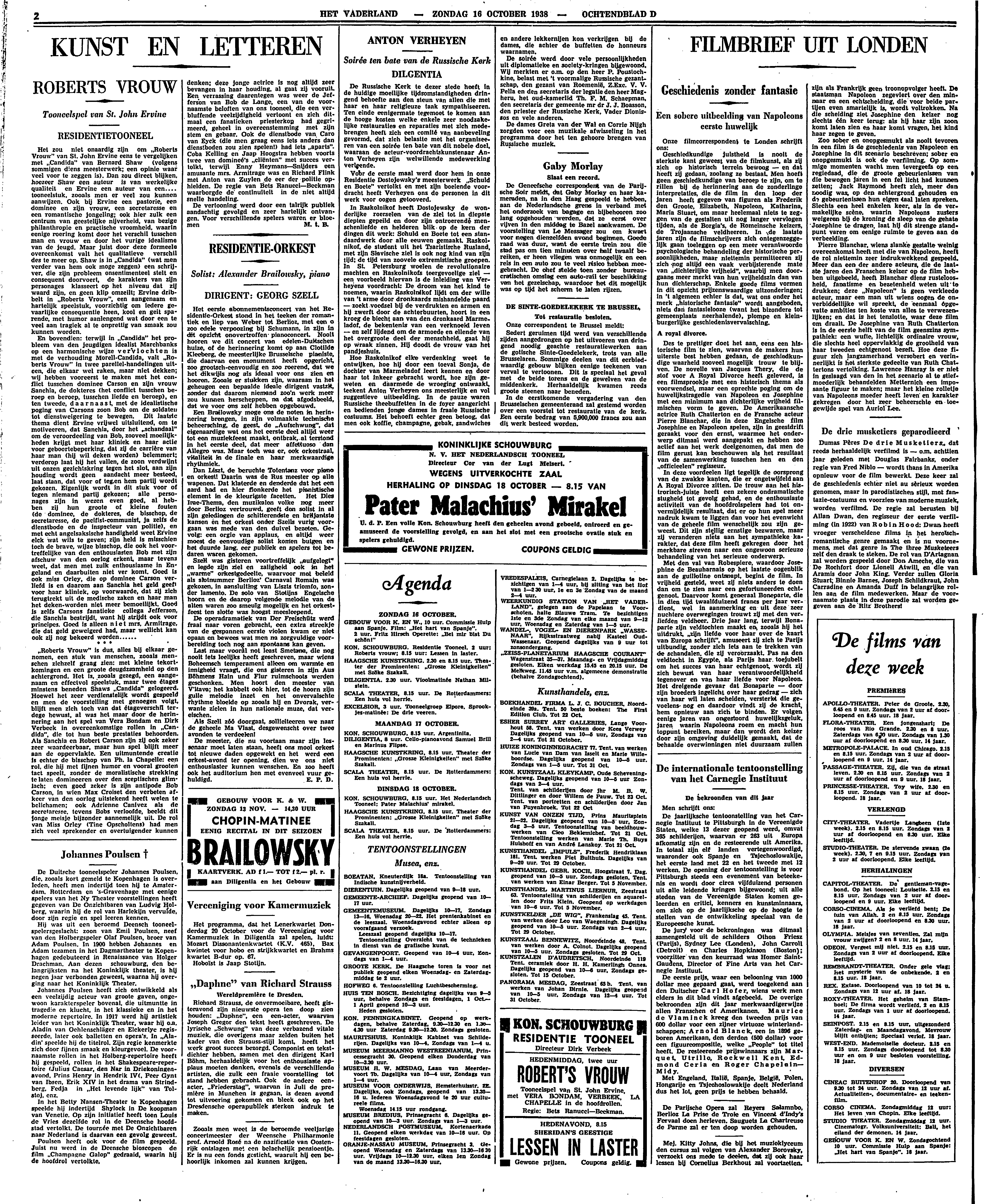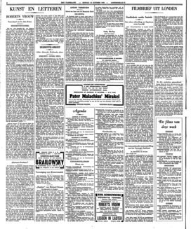 ‘Roberts Vrouw’ is dus, alles bij elkaar genomen, een stuk van menschen, zooals menschen zichzelf graag zien: met kleine tekortkomingen en een groote deugdzaamheid op den achtergrond. Het is, zooals gezegd, een aangenaam en effectvol speelstuk, maar twee étages minstens beneden Shaws ‘Candida’ gelogeerd. Hoewel het zeer verdienstelijk wordt gespeeld en men de voorstelling met genoegen volgt, blijft men zich toch van dat étageverschil terdege bewust, al was het maar door de herinnering aan het spel van Vera Bondam en Dirk Verbeek in overeenkomstige rollen in ‘Candida’, die tot hun beste prestaties behoorden. Als Sanchia en Robert Carson zijn zij ook zeker zeer waardeerbaar, maar hun spel blijft meer aan de oppervlakte. Een uitmuntende creatie is echter de bisschop van Ph. la Chapelle: een rol, die hij met fijnen humor en vooral grooten tact speelt, zonder de moralistische strekking te laten domineeren over den sceptischen glimlach; even goed zeker is zijn antipode Bob Carson, in wien Max Croiset den verbeten afkeer van den oorlog uitstekend heeft weten te belichamen; ook Adrienne Canivez als de secretaresse, tevens Bobs verloofde, beeldt dit jonge meisje bijzonder aannemelijk uit. De rol van Miss Orley (Tine Opscholtens) had men zich veel sprekender en overtuigender kunnen denken; deze jonge actrice is nog altijd zeer bevangen in haar houding, al gaat zij vooruit. Een verrassing daarentegen was weer de Jefferson van Bob de Lange, een van de voornaamste beloften van ons tooneel, die een verbluffende veelzijdigheid vertoont en zich ditmaal een fanatieken priesterkop had gegrimeerd, geheel in overeenstemming met zijn stem en gebaar. Ook de dienstbode van Caro van Eyck (die men graag eens iets anders dan dienstboden zou zien spelen!) had iets ‘aparts’. Coba Kelling en Jaap Hoogstra hebben voorts twee van domineé's ‘cliënten’ met succes vertolkt, terwijl Enny Heymans - Snijders een amusante mrs. Armitrage was en Richard Flink met Anton van Zuylen de eer der politie ophielden. De regie van Bets Ranucci - Beckman waarborgde de continuïteit in de niet altijd snelle handeling.
