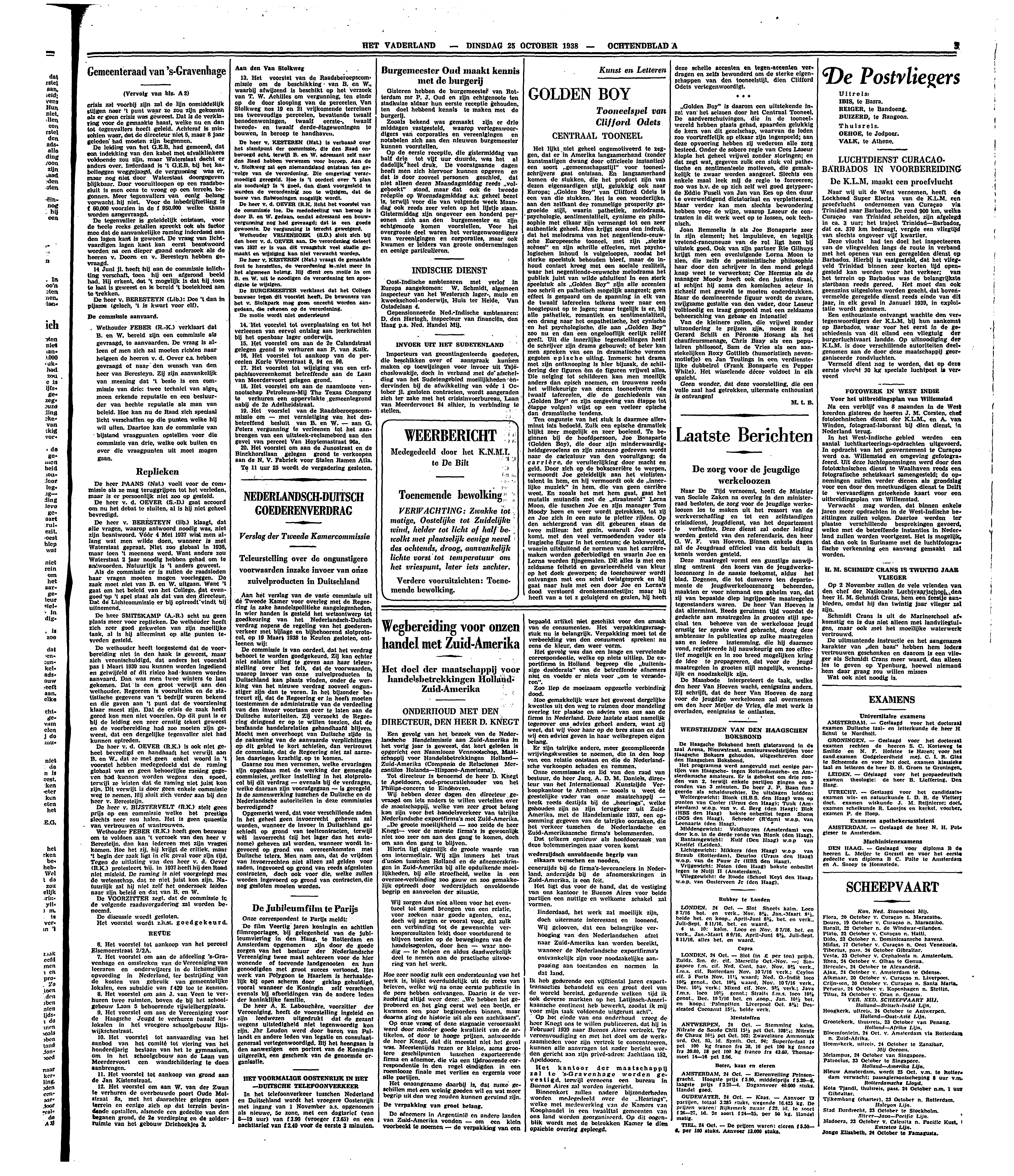 Het lijkt niet geheel ongemotiveerd te zeggen, dat er in Amerika langzamerhand (zonder kunstmatigen dwang door officieele instanties) een soort ‘gemeenschapsstijl’ voor tooneelschrijvers gaat ontstaan. En langzamerhand komen de stukken, die het product zijn van dezen eigenaardigen stijl, gelukkig ook naar Europa; ‘Golden Boy’ van Clifford Odets is een van die stukken. Het is een wonderlijke, aan den zelfkant der rommelige prosperity gegroeide stijl, waarin pathetiek, melodrama, psychologie, sentimentaliteit, cynisme en philosophie met elkaar zijn vermengd tot een zeer authentiek geheel. Men krijgt soms den indruk, dat het melodrama van het negentiende-eeuwsche Europeesche tooneel, met zijn ‘sterke scènes’ en zijn schrille effecten, met psychologischen inhoud is volgeloopen, zoodat het sterke speelstuk behouden bleef, maar de inhoud contact kreeg met een sociale realiteit, waar het negentiende-eeuwsche melodrama het publiek juist van wilde afsluiten! In een sterk speelstuk als ‘Golden Boy’ zijn alle accenten zoo schril en pathetisch mogelijk aangezet; geen effect is gespaard om de spanning in elk van de twaalf tafereelen telkens weer naar een hoogtepunt op te jagen; maar tegelijk is er, bij alle pathetiek, romantiek en sentimentaliteit, een drang naar het onpathetische, het cynische en het psychologische, die aan ‘Golden Boy’ zoo nu en dan een ongelooflijk eerlijk reliëf geeft. Uit die innerlijke tegenstellingen heeft de schrijver zijn drama gebouwd; of beter kan men spreken van een in dramatische vormen gegoten epische uiting. Immers: het drama met zijn ontknooping is hier bijzaak, de schildering der figuren òm de figuren vrijwel alles. Die neiging tot schilderen kan men moeilijk anders dan episch noemen, en trouwens reeds het willekeurige van dezen tooneelvorm (de twaalf tafereelen, die de geschiedenis van ‘Golden Boy’ en zijn omgeving van étappe tot étappe volgen) wijst op een veeleer epische dan dramatische tendens.