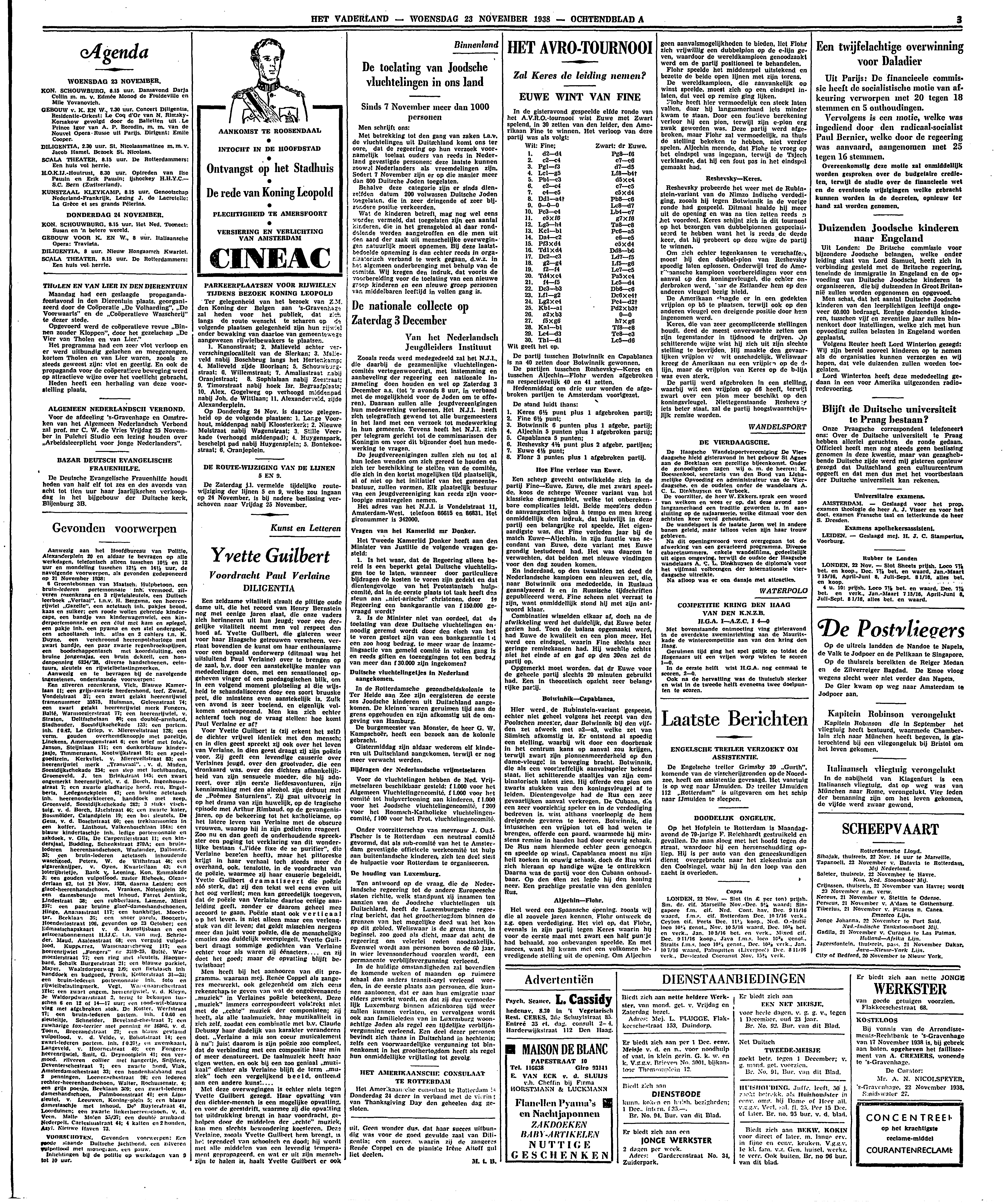 Een zeldzame vitaliteit straalt de pittige oude dame uit, die het record van Henry Bernstein nog met eenige jaren slaat, die onze vaders zich herinneren uit hun jeugd; voor een dergelijke vitaliteit neemt men vol respect den hoed af. Yvette Guilbert, die gisteren weer voor haar Haagsche getrouwen verscheen, verstaat bovendien de kunst om haar enthousiasme voor een bepaald onderwerp (ditmaal was het uitsluitend Paul Verlaine) over te brengen op de zaal, b.v. door een aanstekelijke manier van mededeelingen doen, met een sensationeel opgeheven vinger of een paedagogischen blik, om in een volgend moment plotseling al die wijsheid te schandaliseeren door een soort bruuske pret, die minstens even aanstekelijk is. Zulk een avond is zeer boeiend, en eigenlijk volkomen ontwapenend. Men kan zich echter achteraf toch nog de vraag stellen: hoe komt Paul Verlaine er af?