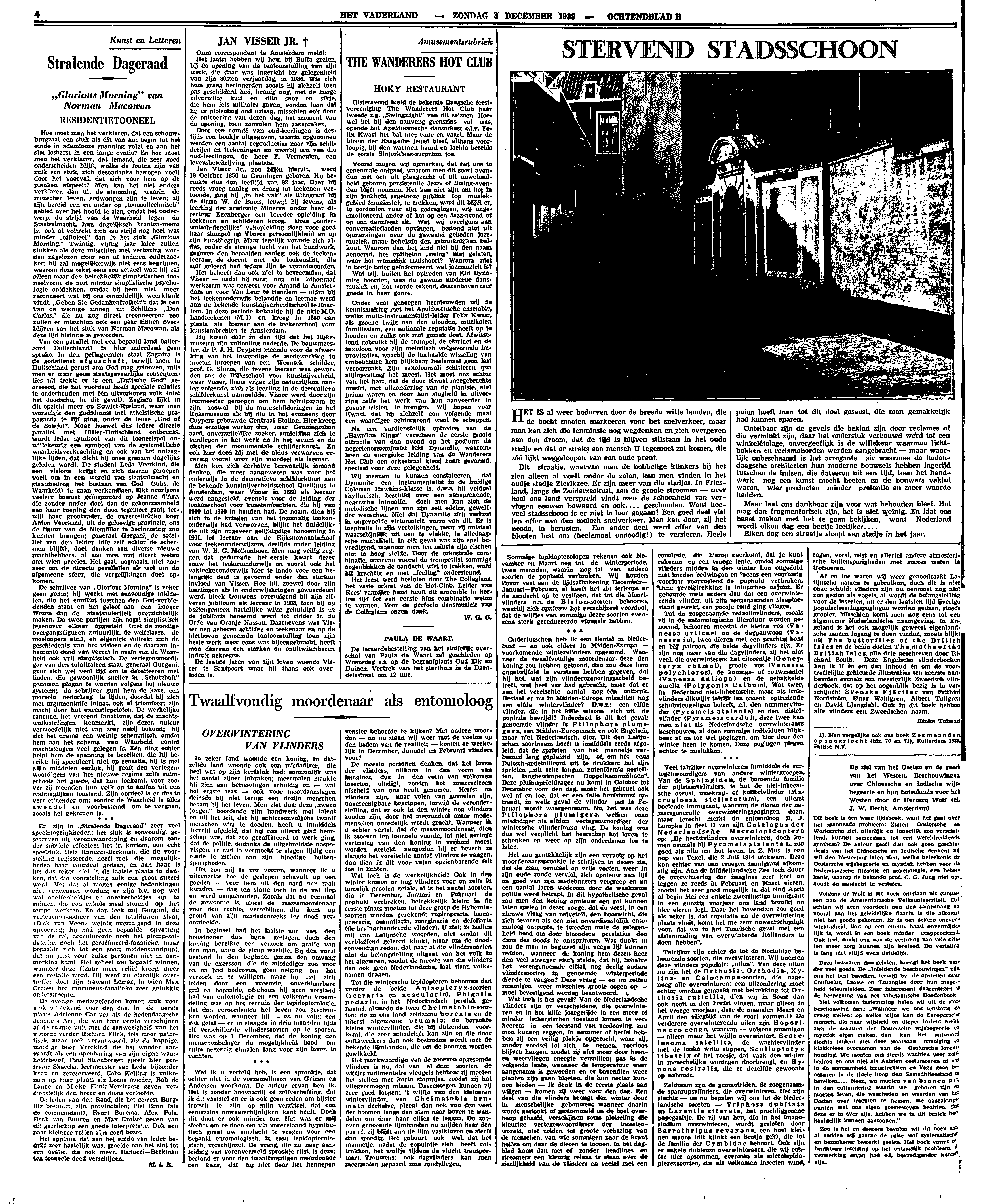 De schrijver van ‘Glorious Morning’ is zeker geen genie; hij werkt met eenvoudige middelen, die het conflict tusschen den God-verbiedenden staat en het geloof aan een hooger Wezen dan de staatsautoriteit overzichtelijk maken. De twee partijen zijn nogal simplistisch tegenover elkaar opgesteld (met de noodige overgangsfiguren natuurlijk, de weifelaars, de meeloopers etc.), en eigenlijk voltrekt zich de geschiedenis van het visioen en de daaraan inhaerente dood van verzet in naam van de Waarheid ook vrij simplistisch. De vertegenwoordiger van den totalitairen staat, generaal Gurgani, gunt zich wel veel tijd om te debatteeren met lieden, die gewoonlijk sneller in ‘Schutzhaft’ genomen plegen te worden volgens het nieuwe systeem; de schrijver gunt hem de kans, een moreele nederlaag te lijden, doordat hij zich met argumentatie inlaat, ook al triomfeert zijn macht door het executiepeloton. De werkelijke rancune, het vretend fanatisme, dat de machtswellustelingen kenmerkt, zijn dezen auteur vermoedelijk niet van zeer nabij bekend; hij ziet het drama een weinig schematisch, omdat hem aan het schema van Waarheid contra machtsleugen veel gelegen is. Eén ding echter helpt hem de spanning te bereiken, die hij bereikt: hij speculeert niet op sensatie, hij is met zijn middelen eerlijk, hij geeft den vertegenwoordigers van het nieuwe regime zelfs ruimschoots het goede, dat hun toekomt, voor zoover zij meenden hun volk op te heffen uit een ondraaglijken toestand. Zijn oordeel is er des te vernietigender om; zonder de Waarheid is alles zwendel en voorbestemd om te vergaan, zooals het gekomen is.