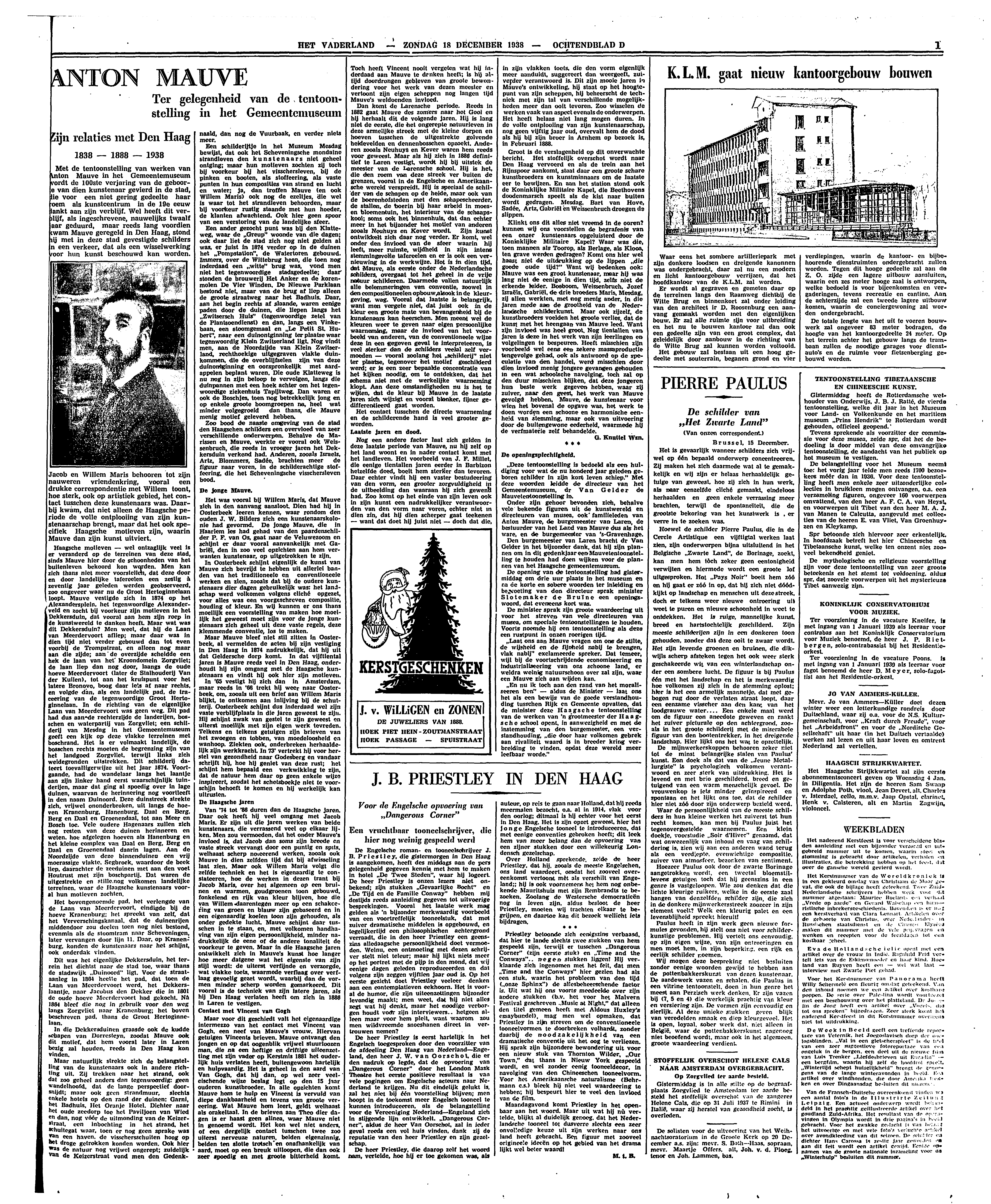 De Engelsche roman- en tooneelschrijver J.B. Priestley, die gistermorgen in Den Haag is aangekomen, heeft des middags aan de pers gelegenheid gegeven kennis met hem te maken in hotel ‘De Twee Steden’, waar hij logeert. De heer Priestley is onzen lezers niet onbekend; zijn stukken ‘Gevaarlijke Bocht’ en ‘De Tijd en de Familie Conway’ hebben mij destijds reeds aanleiding gegeven tot uitvoerige besprekingen. Vooral het laatste werk mag gelden als 'n bijzonder merkwaardig voorbeeld van een voortreffelijk tooneelstuk, dat met zuiver dramatische middelen is opgebouwd, en tegelijkertijd een philosophischen achtergrond verraadt, die in den heer Priestley een geenszins alledaagsche persoonlijkheid doet vermoeden. Welnu, een ontmoeting met dezen schrijver stelt niet teleur; maar hij lijkt niets meer op het portret met de pijp in den mond, dat wij eenige dagen geleden reproduceerden en dat volgens zijn zeggen vijftien jaar oud is. Op het eerste gezicht doet Priestley veeleer denken aan een contemplatieven eekhoorn. Het is vooral de humor, die zijn uiteenzettingen bijzonder levendig maakt; men weet, dat hij niet alles zegt wat hij denkt, maar het noodige verborgen houdt voor zijn interviewers.. hetgeen alleen maar voor hem pleit, want waarom zou men wildvreemde snoeshanen direct in vertrouwen nemen?