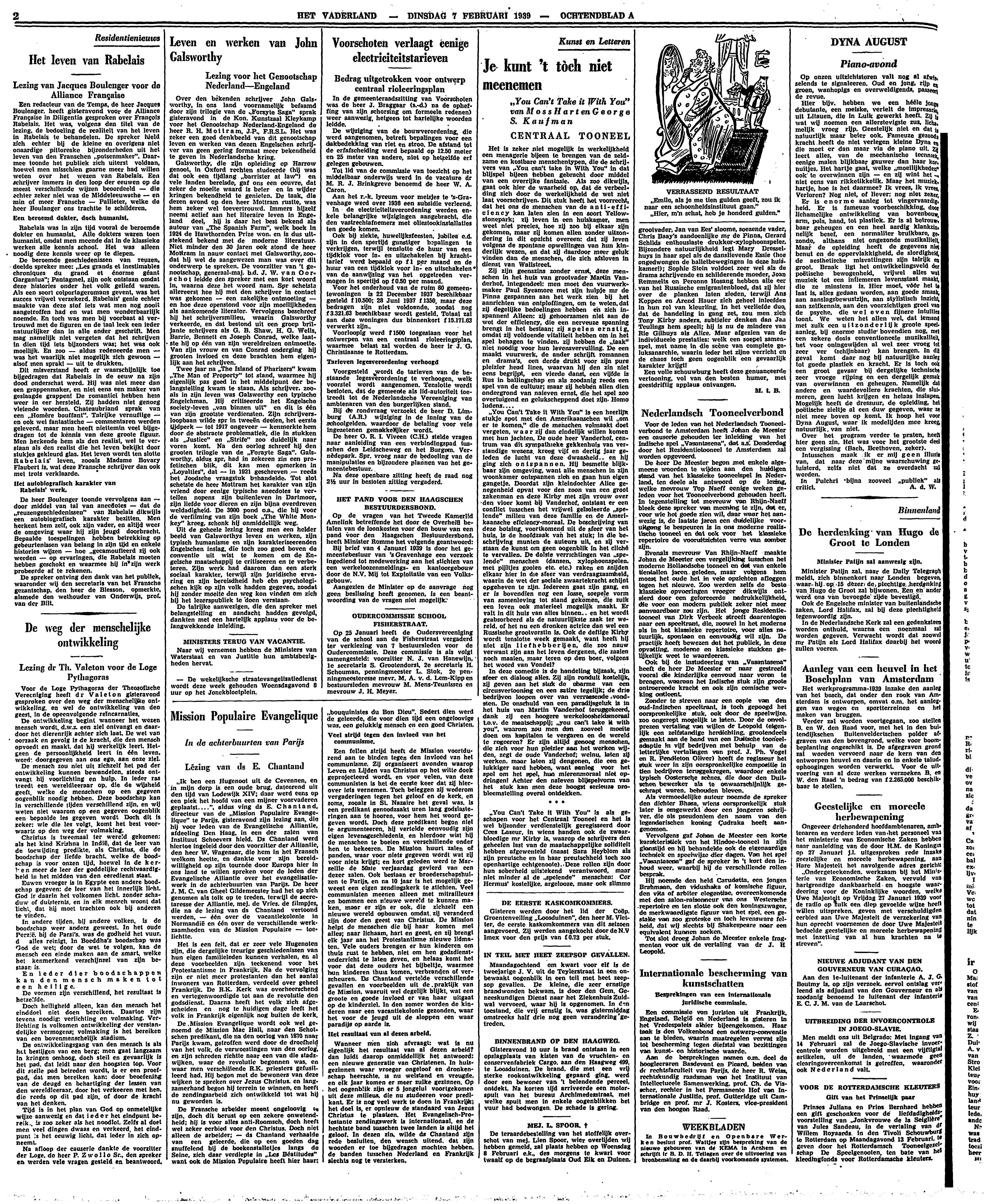 ‘You Can't Take it With You’ is een heerlijk stukje spot met den Amerikaanschen wil ‘om er te komen,’ die de menschen volmaakt doet vergeten, waar zij dan eindelijk willen komen met hun jachten. De oude heer Vanderhof, centrum van dit sympathieke gekkenhuis van verstandige wezens kreeg vijf en dertig jaar geleden de lucht van deze dwaasheid.. en hij ging zich ontspannen. Hij besmette blijkbaar zijn omgeving, want alle menschen in zijn woonkamer ontspannen zich en gaan hun eigen gangetje. Doordat zijn kleindochter Alice genegenheid opvat voor den zoon van een groot zakenman en deze Kirby met zijn vrouw over den vloer komt bij Vanderhof, ontstaat er een conflict tusschen het vrijwel geïsoleerde ‘spelende’ milieu van deze familie en de Amerikaansche eficiency-moraal. De beschrijving van deze botsing, voortkomend uit de sfeer van het huis, is de hoofdzaak van het stuk; in die beschrijving munten de auteurs uit, en zij verstaan de kunst om geen oogenblik in het cliché te vervallen. De dolste verrichtingen van ‘spelende’ menschen (dansen, xylophoonspelen. met pijltjes gooien etc. etc.) raken en snijden elkaar hier in die sfeer van verdraagzaamheid, waarin de wet der sociale zwaartekracht schijnt opgeheven te zijn. Iedereen gaat zijn gang, en er is bovendien nog een losse, soepele vorm van samenleving tot stand gekomen, die zulk een leven ook materieel mogelijk maakt. Er valt in dit huis van alles binnen.. en het wordt geabsorbeerd als de natuurlijkste zaak ter wereld, of het nu een dronken actrice dan wel een Russische grootvorstin is. Ook de deftige Kirby wordt tenslotte week gemaakt, want heeft hij niet zijn liefhebberijen, die zoo nauw verwant zijn aan het leven dergenen, die zaaien noch maalen, maar teren op den boer, volgens het woord van Vondel?