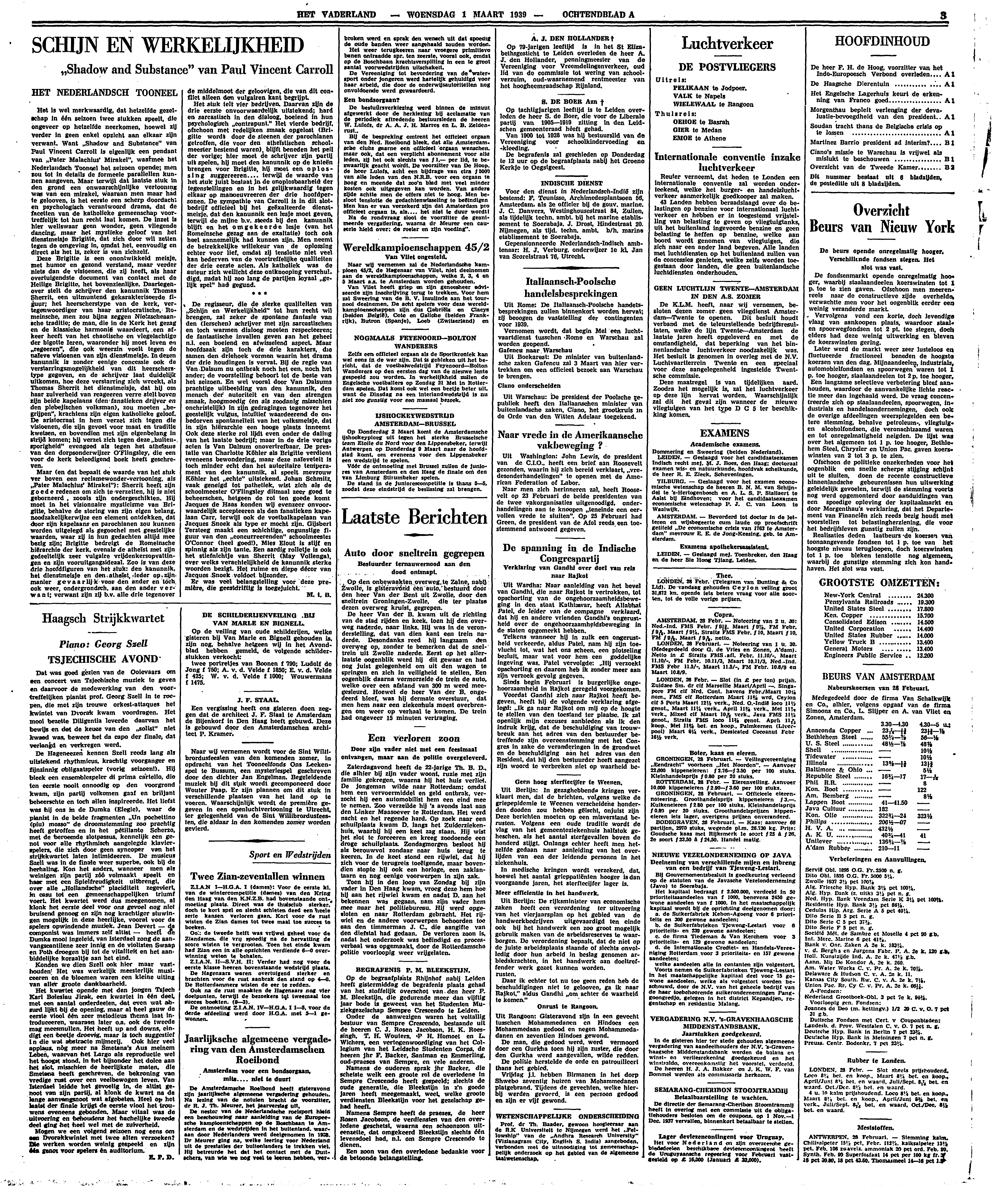 Het is wel merkwaardig, dat hetzelfde gezelschap in één seizoen twee stukken speelt, die ongeveer op hetzelfde neerkomen, hoewel zij verder in geen enkel opzicht aan elkaar zijn verwant. Want ‘Shadow and Substance’ van Paul Vincent Carroll is eigenlijk een pendant van ‘Pater Malachius' Mirakel’, waarmee het Nederlandsch Tooneel het seizoen opende; men zou tot in details de formeele parallellen kunnen aangeven. Maar terwijl dat laatste stuk in den grond een onwaarschijnlijke vertooning was van een mirakel, waaraan men maar had te gelooven, is het eerste een scherp doordacht en psychologisch verantwoord drama, dat de facetten van de katholieke gemeenschap voortreffelijk tot hun recht laat komen. De inzet is hier weliswaar geen wonder, geen vliegende dancing, maar het mystieke geloof van het dienstmeisje Brigitte, dat zich door wil zetten tegen de omgeving in, omdat het, eenvoudig en direct als het is, zeker is van zichzelf.