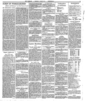 De regisseur, die de sterke qualiteiten van ‘Schijn en Werkelijkheid’ tot hun recht wil brengen, zal zeker de spontane fantasie van den (Ierschen) schrijver met zijn sarcastischen en toch warmen dialoog moeten respecteeren; de fantastische invallen geven aan het geheel n.l. een boeiend en afwisselend aspect. Maar hoofdzaak zijn toch de drie karakters, die samen den driehoek vormen waarin het drama der drie houdingen is vervat. Bij de regie van Van Dalsum nu ontbrak noch het een, noch het ander; de voorstelling behoort tot de beste van het seizoen. En wel vooral door Van Dalsums prachtige uitbeelding van den kanunnik, den mensch der autoriteit en van den strengen smaak, hoogmoedig (en als zoodanig misschien onchristelijk) in zijn gedragingen tegenover het geestelijk vulgus, intuïtief waardeerend de onbedorven spontaneïteit van het volksmeisje, dat in zijn hiërarchie een hooge plaats inneemt. Ook deze sterke rol lijdt even onder de daling van het laatste bedrijf; maar in de drie vorige acten is Van Dalsum onovertrefbaar. De prestatie van Charlotte Köhler als Brigitte verdient eveneens bewondering, maar deze naïeveteit is toch minder echt dan het autoritaire temperament van den kanunnik, al speelt mevrouw Köhler het ‘echte’ uitstekend. Johan Schmitz, vaak geneigd tot pathetiek, wist zich als de schoolmeester O'Flingsley ditmaal zeer goed te beheerschen, hetgeen de rol ten goede komt. Jacques de Haas konden wij evenzeer onvoorwaardelijk accepteeren als den fanatieken kapelaan Carr, terwijl ook de voetbalkapelaan van Jacques Snoek als type er mocht zijn. Gijsbert Tersteeg maakt een schichtige, ongunstige figuur van den ‘concurreerenden’ schoolmeester O'Connor (heel goed!), Mies Elout is stijf en spinnig als zijn tante. Een aardig rolletje is ook het stiefnichtje van Sherrit (May Vollenga), over welks verachtelijkheid de kanunnik sterke woorden bezigt. Het ruime en diepe décor van Jacques Snoek voldoet bijzonder.
