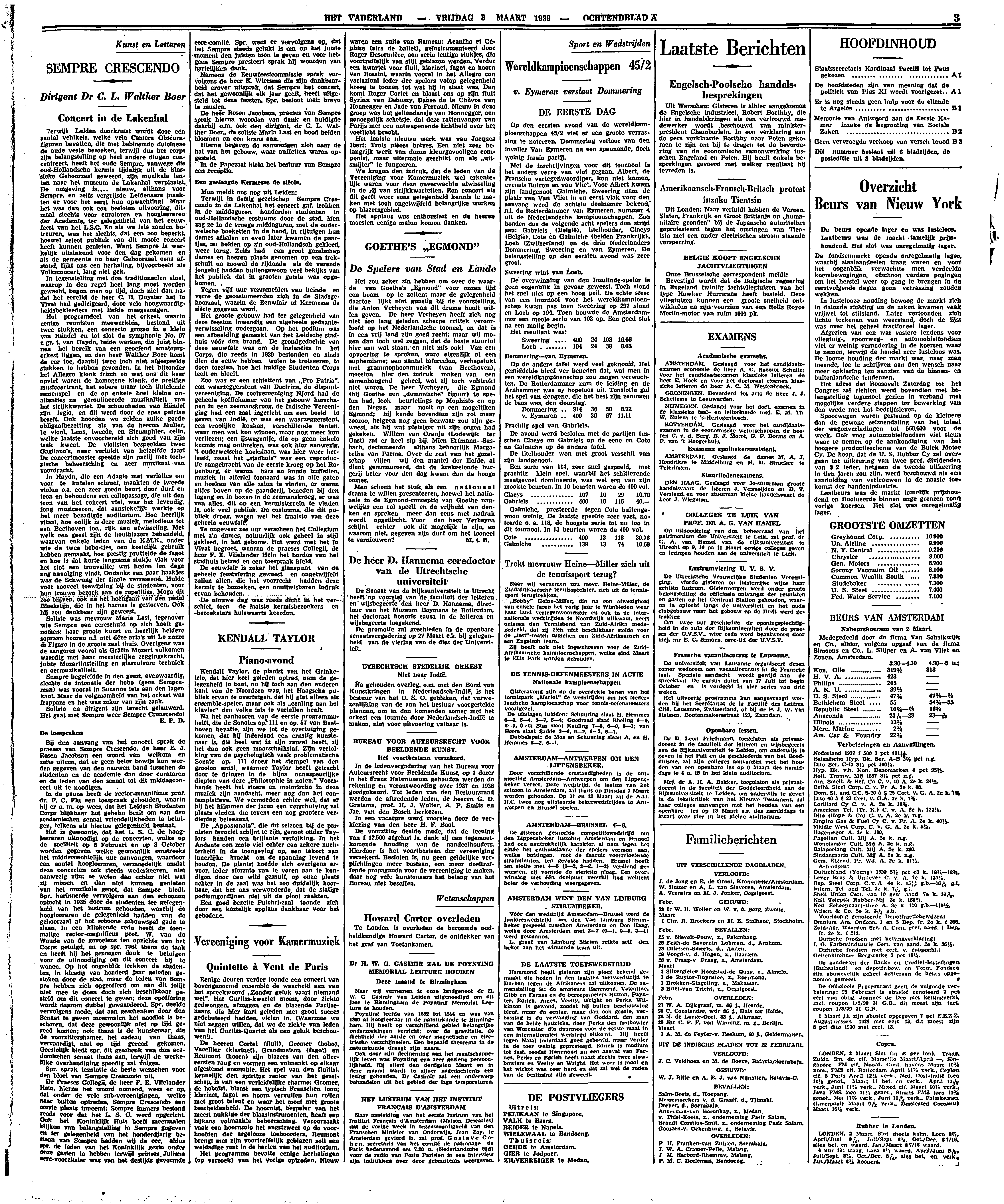 Het zou zeker zin hebben om over de waarde van Goethe's ‘Egmond’ voor onzen tijd een boom op te zetten; maar de gelegenheid daartoe lijkt niet gunstig bij de voorstelling, die Anton Verheyen van dit drama heeft willen geven. De heer Verheyen heeft zich nog niet zoo lang geleden scherpe critiek veroorloofd op het Nederlandsche tooneel, en dat is in een vrij land zijn goed recht; maar wij mogen dan toch wel zeggen, dat de beste stuurlui hier aan wal staan, en niet mis ook! Van een opvoering te spreken, ware eigenlijk al een euphemisme; een aantal tafereelen, verhapstukt met grammophoonmuziek (van Beethoven), moesten hier den indruk maken van een samenhangend geheel, wat zij toch volstrekt niet waren. De heer Verheyen, die Egmond (bij Goethe een ‘demonische’ figuur) te spelen had, leek beurtelings op Mephisto en op den Negus, maar nooit op een mogelijken Egmond; hij kende bovendien zijn rol maar zoozoo, hetgeen nog geen bezwaar zou zijn geweest, als hij wat pleiziger uit zijn oogen had gekeken. Willem van Oranje (Lodewijk ter Gast) zat er heel sip bij. Mien Erfmann-Sasbach, declameerde althans behoorlijk Margaretha van Parma. Over de rest van het gezelschap vlijen wij den mantel der liefde, al dient gememoreerd, dat de krakeelende burgerij beter voor den dag kwam dan de hooge oomes.