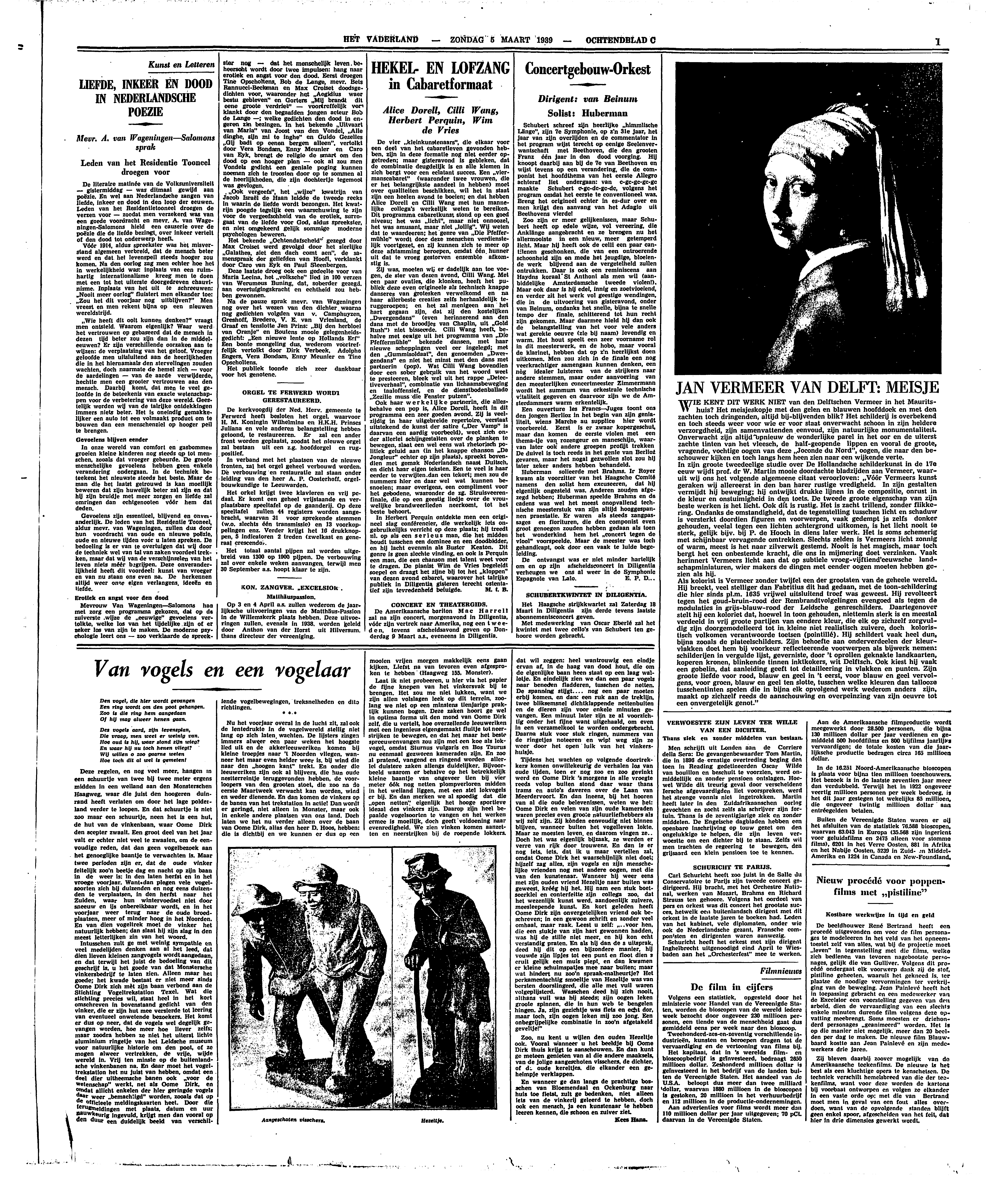 Ook haar werkelijke partnerin, die allesbehalve een pop is, Alice Dorell, heeft in dit programma een zeer goeden avond. Zij is veelzijdig in haar uitgebreide repertoire, verstaat uitstekend de kunst der satire (‘Der Vamp’ is daarvan een aardig voorbeeld), weet zich onder allerlei schijngestalten over de planken te bewegen, slaat een wel eens wat rhetorisch politiek geluid aan (in het knappe chanson ‘De Jongleur’ echter op zijn plaats), spreekt bovendien met gemak Nederlandsch naast Duitsch, en dicht haar eigen teksten. Een te veel is haar eerder te verwijten dan een tekort; men zou de nummers hier en daar wel wat kunnen besnoeien; maar overigens, een compliment voor het gebodene, waaronder de zg. Struisveerenfinale, die op een geestig liedje over de vrouwelijke brandweerlieden neerkomt, tot het beste behoort.