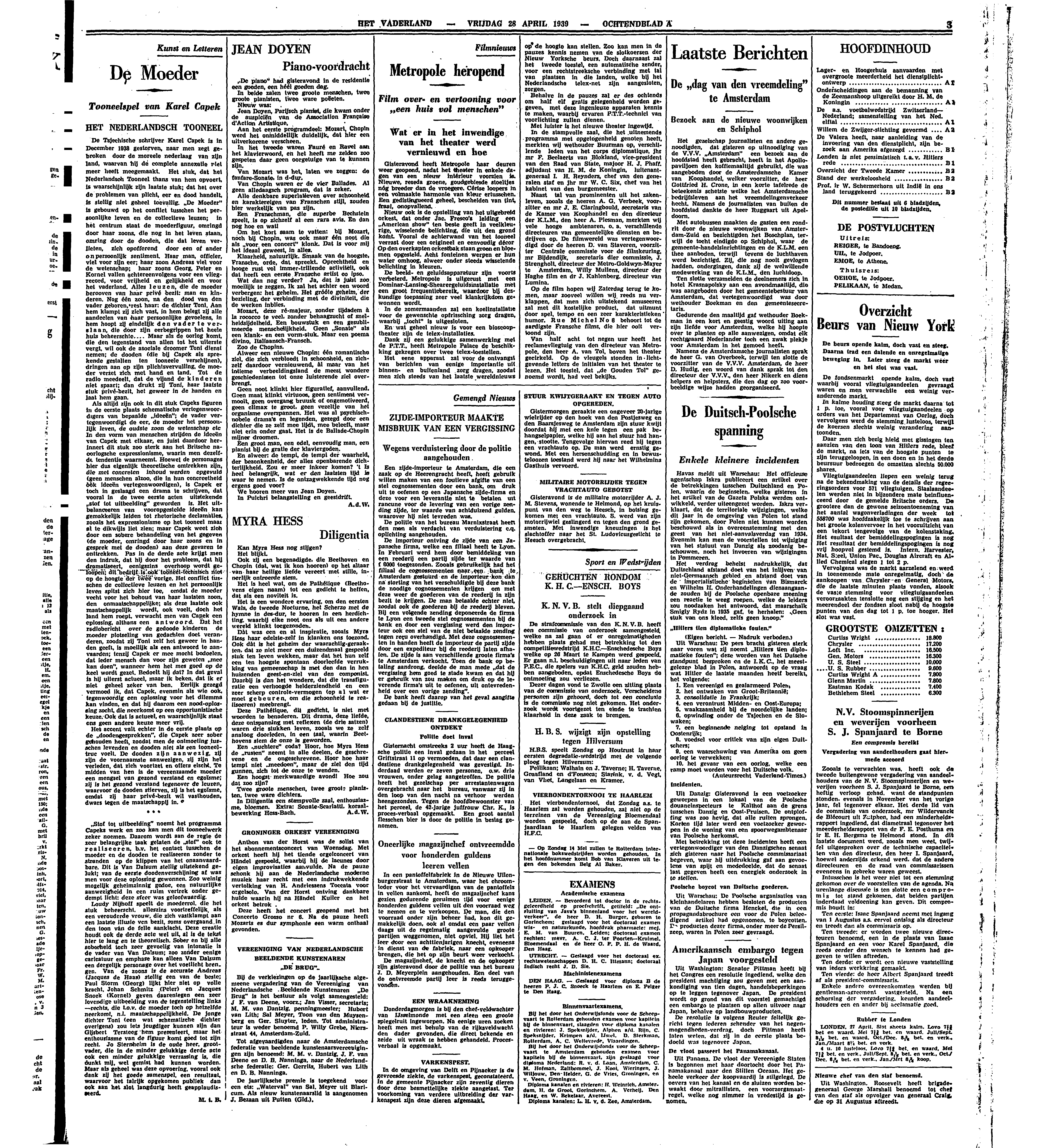 De Tsjechische schrijver Karel Capek is in December 1938 gestoven, naar men zegt gebroken door de moreele nederlaag van zijn land, waarvan hij de complete annexatie niet meer heeft meegemaakt. Het stuk, dat het Nederlandsch Tooneel thans van hem opvoert, is waarschijnlijk zijn laatste stuk; dat het over de problemen van plicht, eer en dood handelt, is stellig niet geheel toevallig. ‘De Moeder’ is gebouwd op het conflict tusschen het persoonlijke leven en de collectieve leuzen; in het centrum staat de moederfiguur, omringd door haar zoons, die nog in het leven staan, omring door de dooden, die dat leven verlieten, zich opofferend door een of ander on persoonlijk sentiment. Haar man, officier, viel voor zijn eer; haar zoon Andreas viel voor de wetenschap; haar zoons Georg, Peter en Kornel vallen achtereenvolgens voor een vliegrecord, voor vrijheid en gelijkheid en voor het vaderland. Alles leuzen, die de moeder berooven van haar privé bezit: man en kinderen. Nog één zoon, na den dood van den vader geboren, rest haar: de dichter Toni. Aan hem klampt zij zich vast, in hem belegt zij alle aandeelen van haar persoonlijke gevoelens, in hem hoopt zij eindelijk den vader te verslaan, die door zijn eerbegrippen het heele huis beheerschte.... Maar als de oorlog komt, die den tegenstand van allen tot het uiterste vergt, wil ook de asociale droomer Toni dienst nemen; de dooden (die bij Capek als sprekende gestallen ten tooneele verschijnen), dringen aan op zijn plichtsvervulling, de moeder verzet zich met hand en tand. Tot de radio meedeelt, dat de vijand de kinderen niet spaart; dan drukt zij Toni, haar laatste stuk privé-bezit, het geweer in de handen en laat hem gaan.