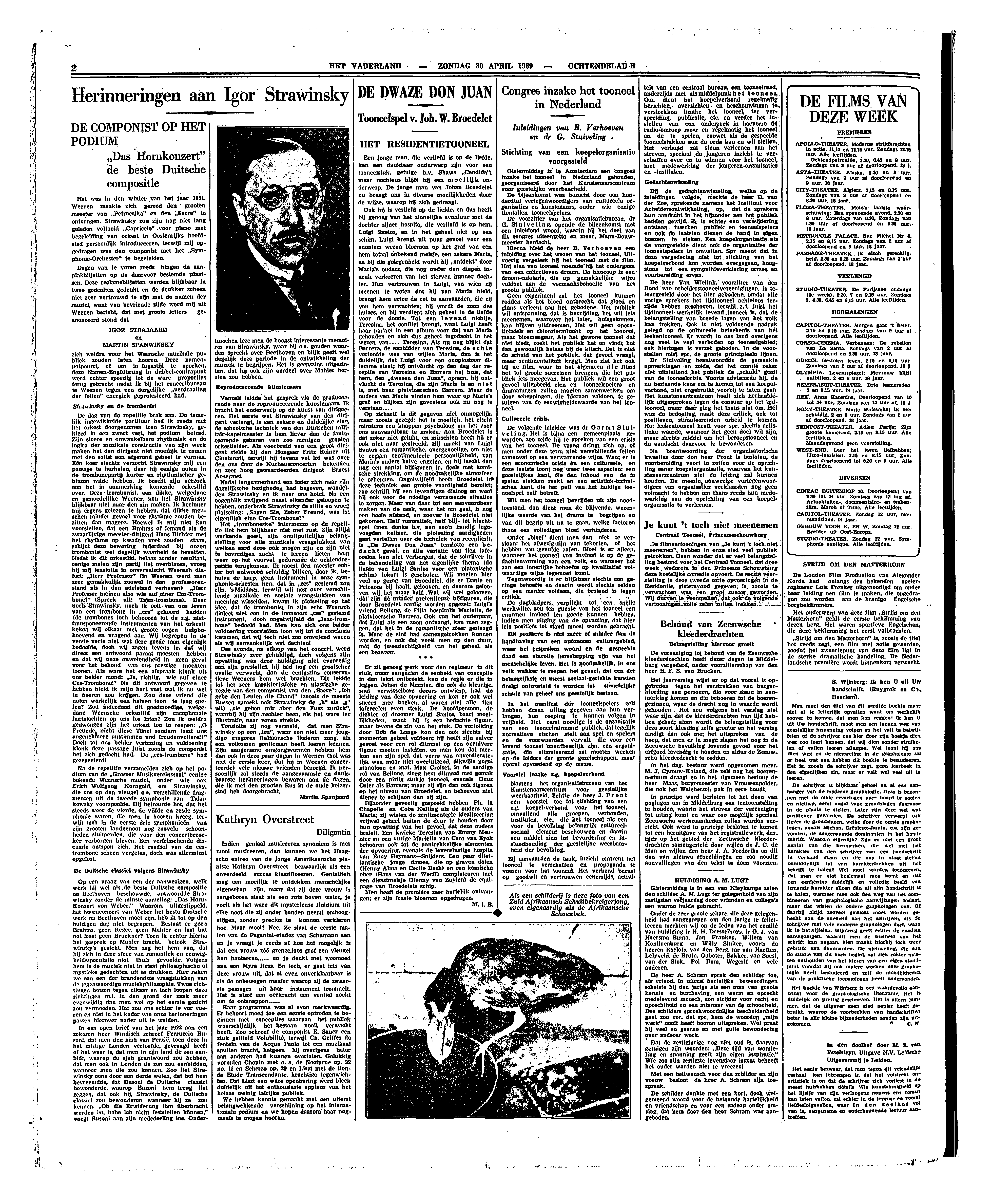 Op zichzelf is dit gegeven niet onmogelijk, maar zooals gezegd: het is moeilijk, het eischt minstens een knappen psycholoog om het voor ons aanvaardbaar te maken. Aan Broedelet is dat zeker niet gelukt, en misschien heeft hij er ook niet naar gestreefd. Hij maakt van Luigi Santos een romantische, overgevoelige, om niet te zeggen sentimenteele persoonlijkheid, van Maria's ouders halve engelen, en hij lascht dan nog een aantal bijfiguren in, deels met komische strekking, om de noodzakelijke atmosfeer te scheppen. Ongetwijfeld heeft Broedelet in deze techniek een groote vaardigheid bereikt; zoo schrijft hij een levendigen dialoog en weet hij ook voor de noodige verrassende situaties te zorgen. Maar van daar tot een aanvaardbaar maken van de zaak, waar het om gaat, is nog een heele afstand, en zoover is Broedelet niet gekomen. Half romantiek, half blij- tot kluchtspel (men denke b.v. aan zoo'n handig ingevoegden kellner, die plotseling aardigheden gaat vertellen over de techniek van recepties!), is ‘De Dwaze Don Juan’ tenslotte een bedacht geval, en alle variatie van tien tafereelen kan niet verbergen, dat de schrijver in de behandeling van het eigenlijke thema (de liefde van Luigi Santos voor een platonische schim) tekort is geschoten. Wij moeten hier veel op gezag van Broedelet, die er Dante en Petrarca bij haalt, gelooven, en daarom gelooven wij het maar half. Wat wij wel gelooven, dat zijn de minder pretentieuze bijfiguren, die door Broedelet aardig worden opgezet: Luigi's vriend Bellone, de Filia hospitalis Marietta, de platvloersche Barrera. Ook van het ouderpaar, dat Luigi als een zoon ontvangt, kan men zeggen, dat het in de romantische sfeer geslaagd is. Maar de stof had samengetrokken kunnen worden, en ook dat voelt men op den duur, mèt de tweeslachtigheid van het geheel, als een bezwaar.