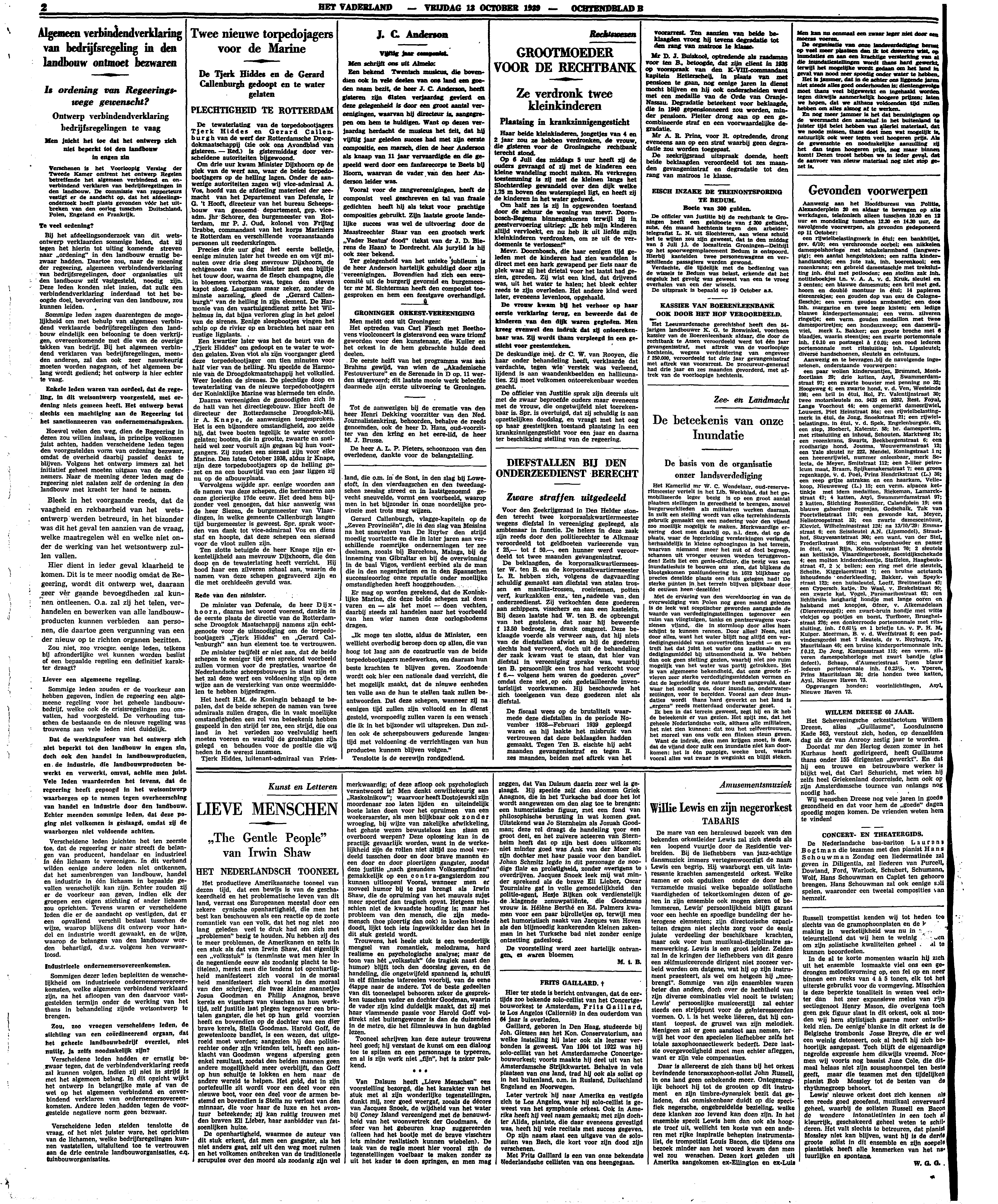 Het productieve Amerikaansche tooneel van dezen tijd, dat een bewijs is van de geschakeerdheid en het problematische leven van dit land, verrast ons Europeanen meestal door een zekere cynische openhartigheid, die men het best kan beschouwen als een reactie op de zoete romantiek van een volk, dat het nog niet zoo lang geleden veel te druk had om zich met ‘problemen’ bezig te houden. Nu hebben zij des te meer problemen, de Amerikanen en zelfs in een stuk als dat van Irwin Shaw, dat eigenlijk een ‘volksstuk’ is (tenminste wat men hier in de negentiende eeuw als zoodanig placht te betitelen), merkt men die tendens tot openhartigheid. Die manifesteert zich vooral in den moraal van den schrijver, die twee kleine mannetjes Josua Goodman en Philip Anagnos, brave kerels en visschers van visschen na hun werktijd, zelf justitie laat plegen tegenover een brutalen gangster, die het op hun geld voorzien heeft en bovendien op de dochter van een dier brave kerels, Stella Goodman. Harold Goff, de gewetenlooze bandiet, is een wezen, dat uitgeroeid moet worden; aangezien hij den politierechter onder zijn vrienden telt, heeft een aanklacht van Goodman wegens afpersing geen enkel resultaat, zoodat den beiden mannen geen andere mogelijkheid meer overblijft, dan Goff op hun schuitje te lokken en hem naar de andere wereld te helpen. Het geld, dat in zijn portefeuille zit, wordt voor een deel voor een nieuwe boot, voor een deel voor de armen bestemd en bovendien is Stella nu verlost van den minnaar, die voor haar de luxe en het avontuur beteekende; zij kan rustig trouwen met den braven Eli Lieber, haar aanbidder van fatsoenlijken huize.