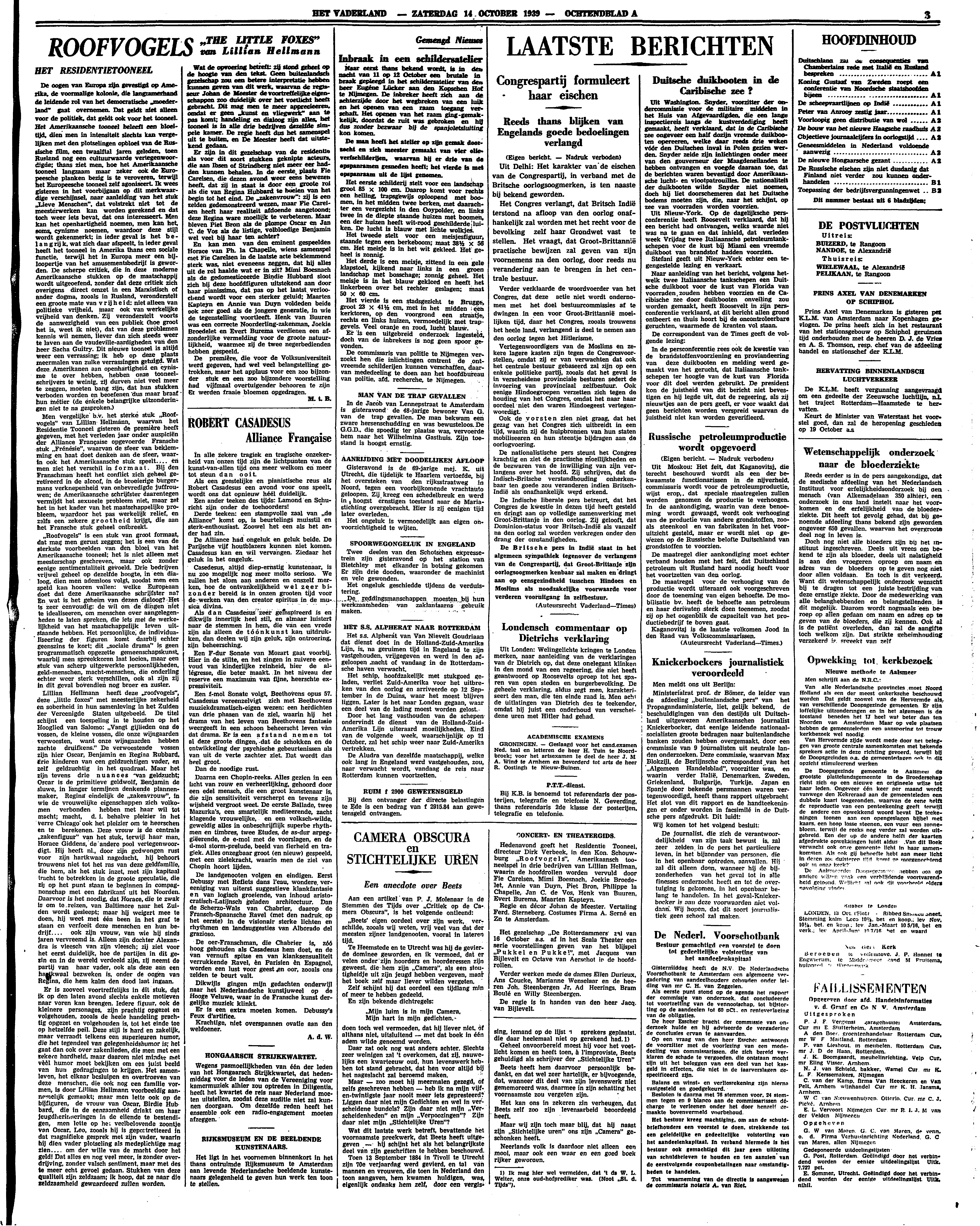 Men vergelijke b.v. het sterke stuk ‘Roofvogels’ van Lillian Hellmann, waarvan het Residentie Tooneel gisteren de première heeft gegeven, met het verleden jaar onder auspiciën der Alliance Française opgevoerde Fransche stuk ‘Frénésie’, waarvan de sfeer van beklemming en haat doet denken aan de sfeer, waarin ook het Amerikaansche stuk speelt.... en men ziet het verschil in formaat. Bij den Franschman heeft het conflict zich geheel geretireerd in de alcoof, in de broeierige burgermans verknepenheid van onbevredigde juffrouwen; de Amerikaansche schrijfster daarentegen vermijdt het sexueele probleem niet, maar zet het in het kader van het maatschappelijke probleem, waardoor het pas werkelijk relief, en zelfs een zekere grootheid krijgt, die aan het Fransche stuk geheel ontbreekt.