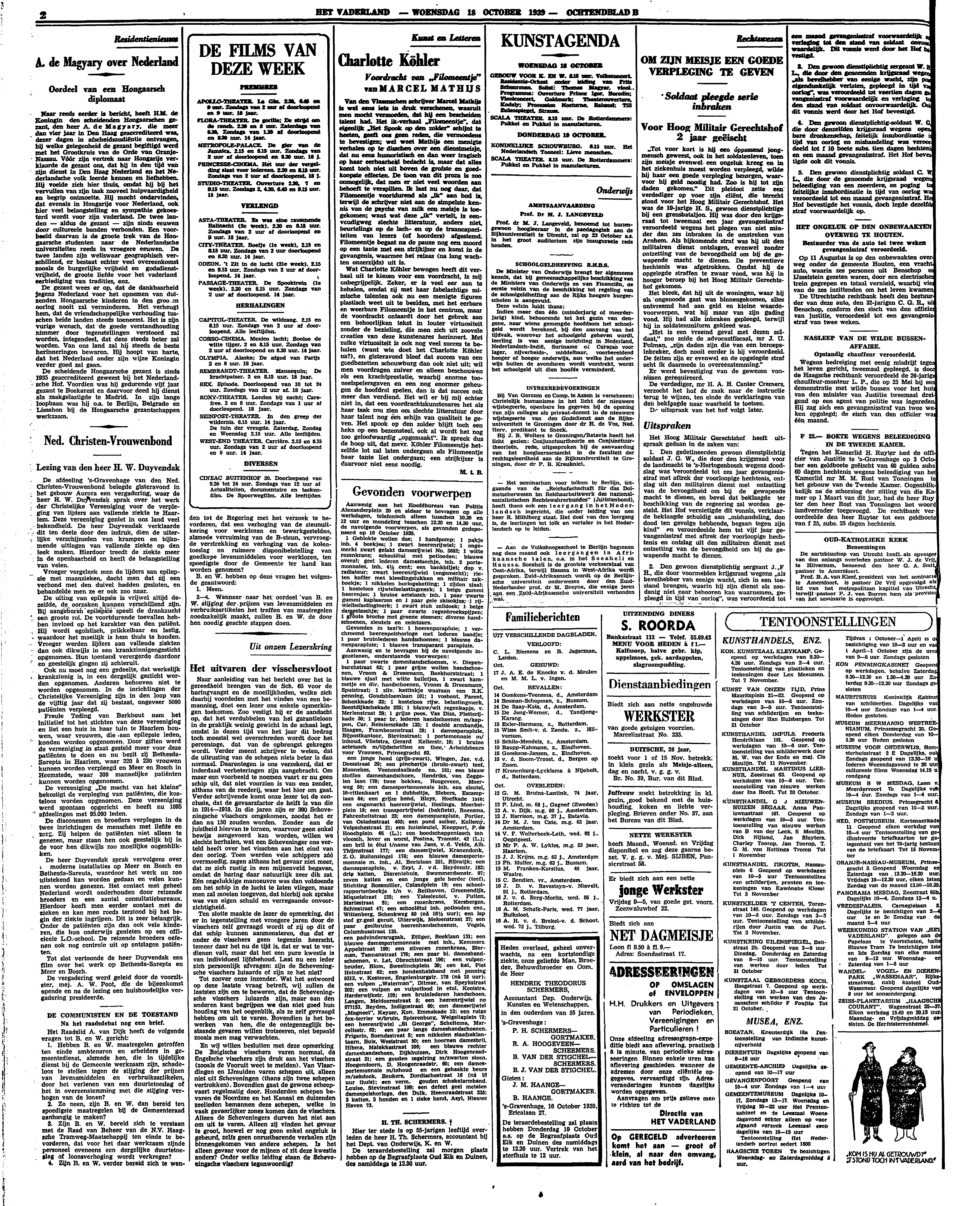Wat Charlotte Köhler bewogen heeft dit verhaal uit te kiezen voor een voordracht, is mij onbegrijpelijk. Zeker, er is veel eer aan te behalen, omdat zij met haar fabelachtige mimische talenten ook nu een menigte figuren plastisch weet uit te beelden, met het eerbare en weerbare Filomeentje in het centrum, maar de voordracht ontaardt door het gebrek aan een behoorlijken tekst in louter virtuositeit zonder de bezieling, die men zich uit zoovele creaties van deze kunstenares herinnert. Met zulke virtuositeit is ook nog veel succes te behalen (want wie doet het Charlotte Köhler na?), en gisteravond bleef dat succes van een goedbezetten schouwburg dan ook niet uit; wil men voordragen zuiver en alleen beschouwen als een krachtprestatie, waarbij enorme tooneelspelersgaven en een nog enormer geheugen de hoofdrol spelen, dan is dat succes ook meer dan verdiend. Het wil er bij mij echter niet in, dat een voordrachtskunstenares het als haar taak zou zien om slechte litteratuur door haar talent nog een schijn van qualiteit te geven. Het spook op den zolder blijft toch een heks op een bezemsteel, ook al wordt het nog zoo geloofwaardig ‘opgemaakt’. Ik spreek dus de hoop uit, dat mevr. Köhler Filomeentje hetzelfde lot zal laten ondergaan als Filomeentje haar tante liet ondergaan; een strijkijzer is daarvoor niet eens noodig.