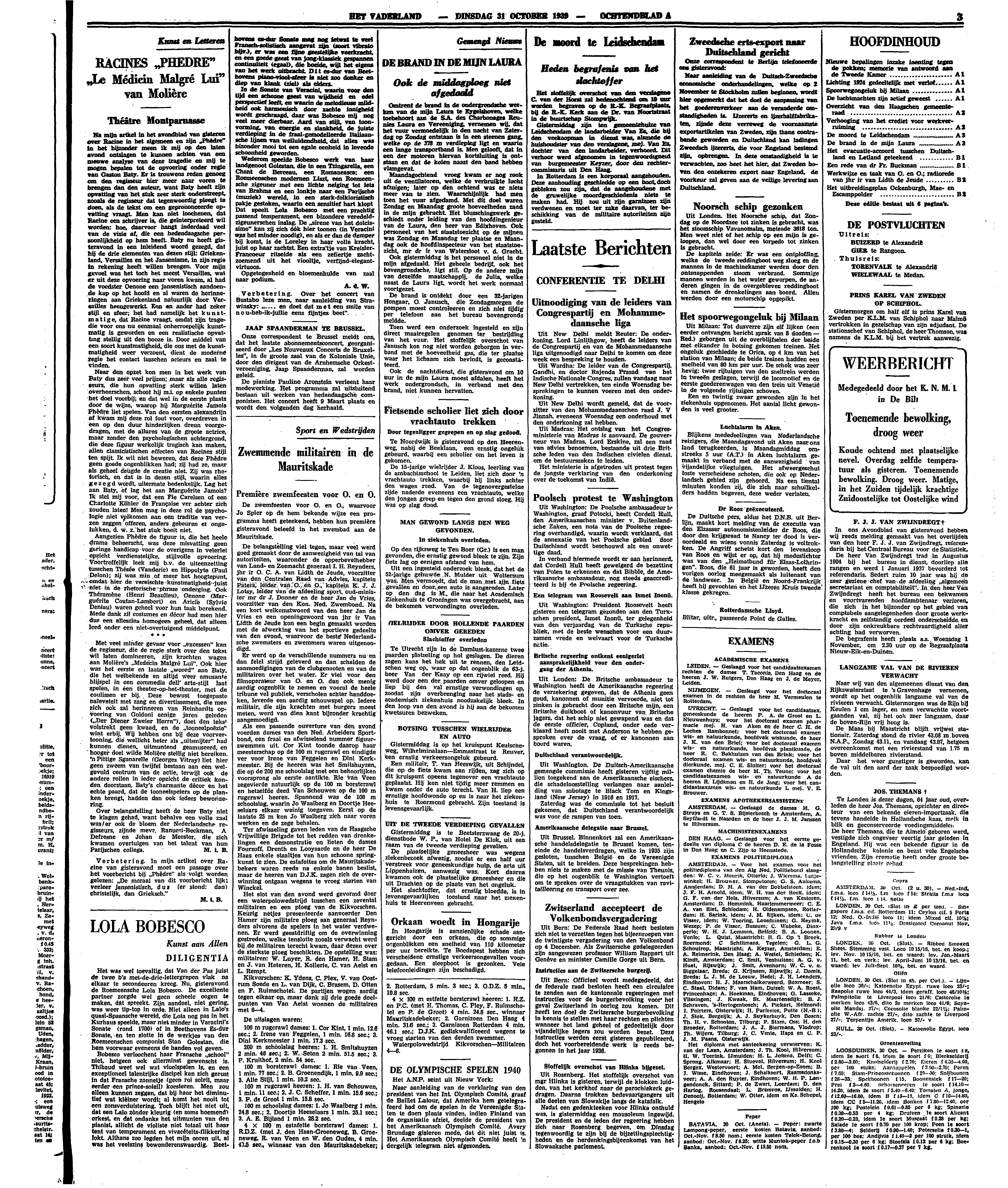 Na mijn artikel in het avondblad van gisteren over Racine in het algemeen en zijn ‘Phèdre’ in het bijzonder meen ik mij op den laten avond ontslagen te kunnen achten van een nieuwe analyse van deze tragedie en mij te mogen bepalen tot de opvoering onder regie van Gaston Baty. Er is trouwens reden genoeg om den regisseur hier meer naar voren te brengen dan den auteur, want Baty heeft zijn opvatting van het stuk zeer sterk onderstreept, zooals de regisseur dat tegenwoordig pleegt te doen, als de tekst om een geprononceerde opvatting vraagt. Men kan niet loochenen, dat Racine een schrijver is, die geïnterpreteerd wil worden: hoe, daarvoor hangt inderdaad veel van de visie af, die een hedendaagsche persoonlijkheid op hem heeft. Baty nu heeft gisteravond in een inleidend woord gezegd, dat hij de drie elementen van dezen stijl: Griekenland, Versailles en het Jansenisme, in zijn regie in rekening heeft willen brengen. Voor mijn gevoel was het toch het meest Versailles, wat er uit deze opvoering naar voren kwam, al had de voedster Oenone een jansenistisch aandoende kap op het hoofd en al waren de herinneringen aan Griekenland natuurlijk door Versailles heengewerkt. Een en ander had zeker stijl en sfeer; het had namelijk het kunstmatige, dat Racine vraagt, omdat zijn tragedie voor ons nu eenmaal onherroepelijk kunstmatig is geworden en een realistische opvatting stellig uit den booze is. Door middel van een soort kunstmatigheid, die ons met de kunstmatigheid weer verzoent, dient de moderne regie het contact tusschen acteurs en zaal te vinden.