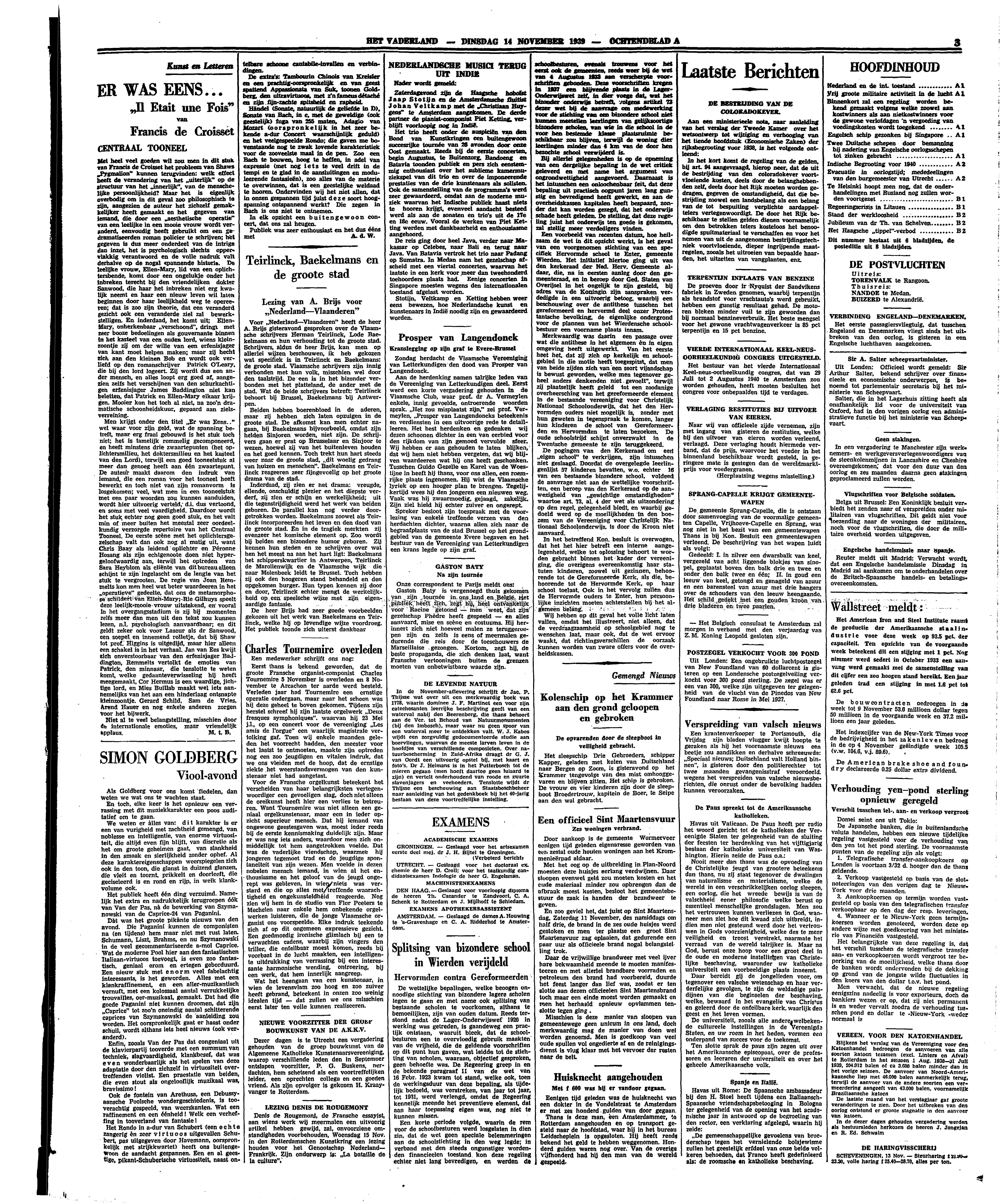Men krijgt onder den titel ‘Er was Eens..’ wel waar voor zijn geld, wat de spanning betreft, maar erg fraai gebouwd is het stuk toch niet; het is tamelijk rommelig gecomponeerd, en heeft minstens drie zwaartepunten (het oplichtersmilieu, het doktersmilieu en het kasteel van den Lord), terwijl een goed tooneelstuk al meer dan genoeg heeft aan één zwaartepunt. De auteur maakt daarom den indruk van iemand, die een roman voor het tooneel heeft bewerkt en toch niet van zijn romanvorm is losgekomen; veel, wat men in een tooneelstuk met een paar woorden zou kunnen aanduiden, wordt hier uitvoerig verteld, d.i. dus vertoond, en soms met veel vaardigheid. Daardoor wordt het stuk echter nog geen goed stuk, en het valt min of meer buiten het meestal zeer oordeelkundig verzorgde repertoire van het Centraal Tooneel. De eerste scène met het oplichtersgezelschap valt dan ook nog al matig uit, want Chris Baay als leidend oplichter en Péronne Hosang als zijn echtgenoote doen niet hypergeloofwaardig aan, terwijl het optreden van Sara Heyblom als cliënte van dit bureau alleen schijnt te zijn ingelascht om de lengte van het stuk te vergrooten. De regie van Joan Remmelts kon men heel wat beter waardeeren in het ‘operatieve’ gedeelte, dat ons de metamorphose schildert van Ellen-Mary; Rie Gilhuys speelt deze leelijk-mooie vrouw uitstekend, en vooral in het overgangsstadium is zij bij momenten zelfs meer dan men uit den tekst zou kunnen lezen, n.l. psychologisch aanvaardbaar; en dit geldt zeker ook voor Laseur als dr Sanwood, een soepel en innemend rolletje, dat bij Shaw tot prof. Higgins is uitgedijd, maar hier alleen een schakel is in het verhaal. Jan van Ees kwijt zich onverstoorbaar van den erfenisjager Baddington, Remmelts vertolkt de emoties van Patrick, den minnaar, die tenslotte te weten komt, welke gedaanteverwisseling hij heeft meegemaakt, Cor Hermus is een waardige, jichtige lord, en Mies Buillab maakt wel iets aannemelijks van het aan een hinderlaag ontsnapte kleinzoontje. Gerard Schild, Sam de Vries, Arend Hauer en nog enkele anderen zorgen voor het bijwerk.