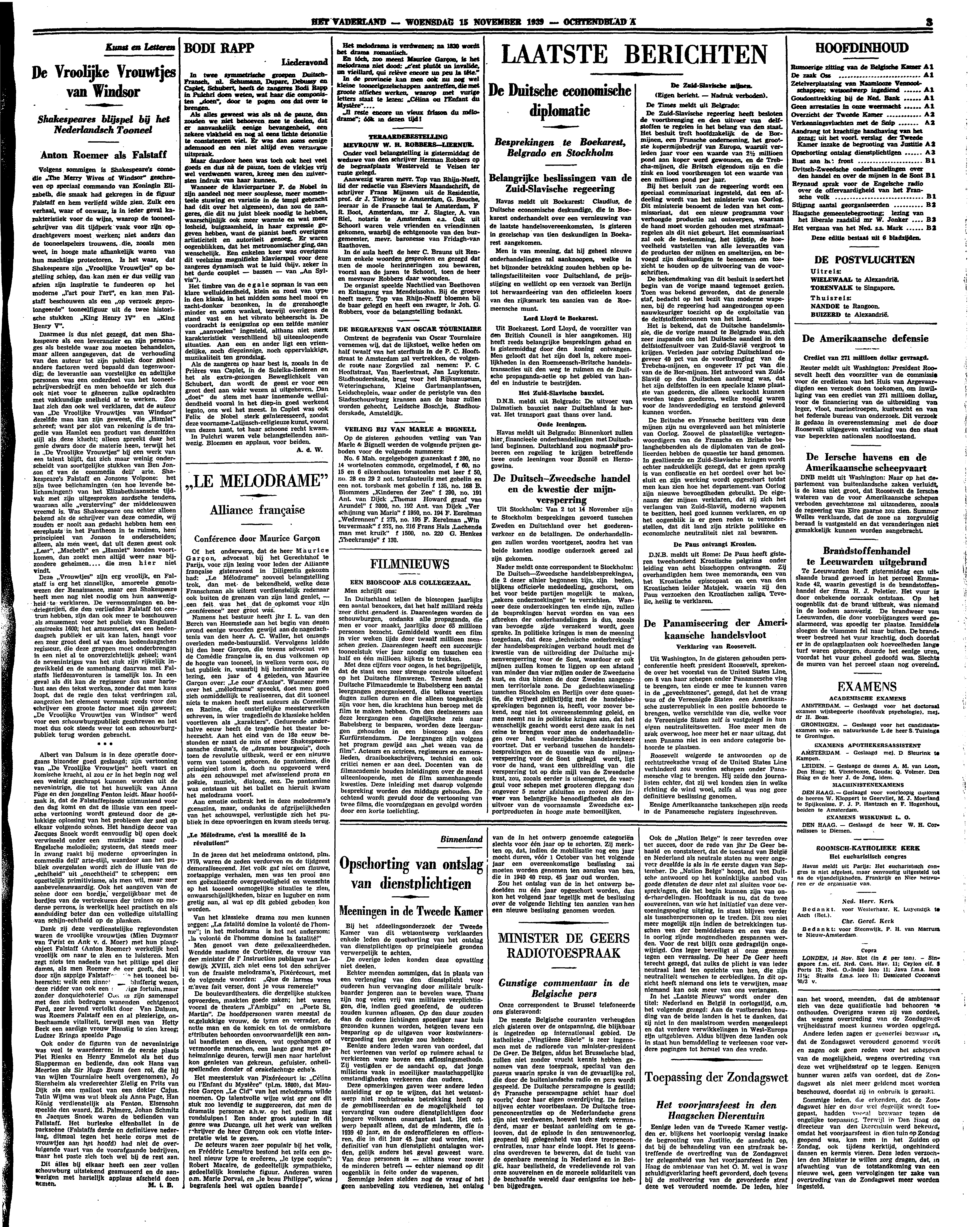 Albert van Dalsum is in deze operatie doorgaans bizonder goed geslaagd; zijn vertooning van ‘De Vroolijke Vrouwtjes’ heeft vaart en komische kracht, al zou er in het begin nog wel een weinig geschrapt kunnen worden uit de nevenintrige, die tot het huwelijk van Anna Page en den jongeling Fenton leidt. Maar hoofdzaak is, dat de Falstaffepisode uitmuntend voor den dag komt en dat de illusie van een speelsche vertooning wordt gesteund door de gelukkige oplossing van het probleem der snel op elkaar volgende scènes. Het handige decor van Jacques Snoek wordt eenvoudig bij open doek verwisseld onder een muziekje naar oud-Engelsche melodieën; systeem, dat steeds meer in zwang raakt bij moderne opvoeringen in commedia dell' arte-stijl, waardoor aan het publiek overgelaten wordt zich de illusie van de ‘echtheid’ uit ‘onechtheid’ te scheppen; een opzettelijk primitivisme, als men wil, maar zeer aanbevelenswaardig. Ook het aangeven van de scène door een bordje, vergelijkbaar met de bordjes van de vertrekuren der treinen op moderne perrons, is werkelijk heel practisch en als aanduiding beter dan een volledige uitstalling van schijn-echtheid op de planken.