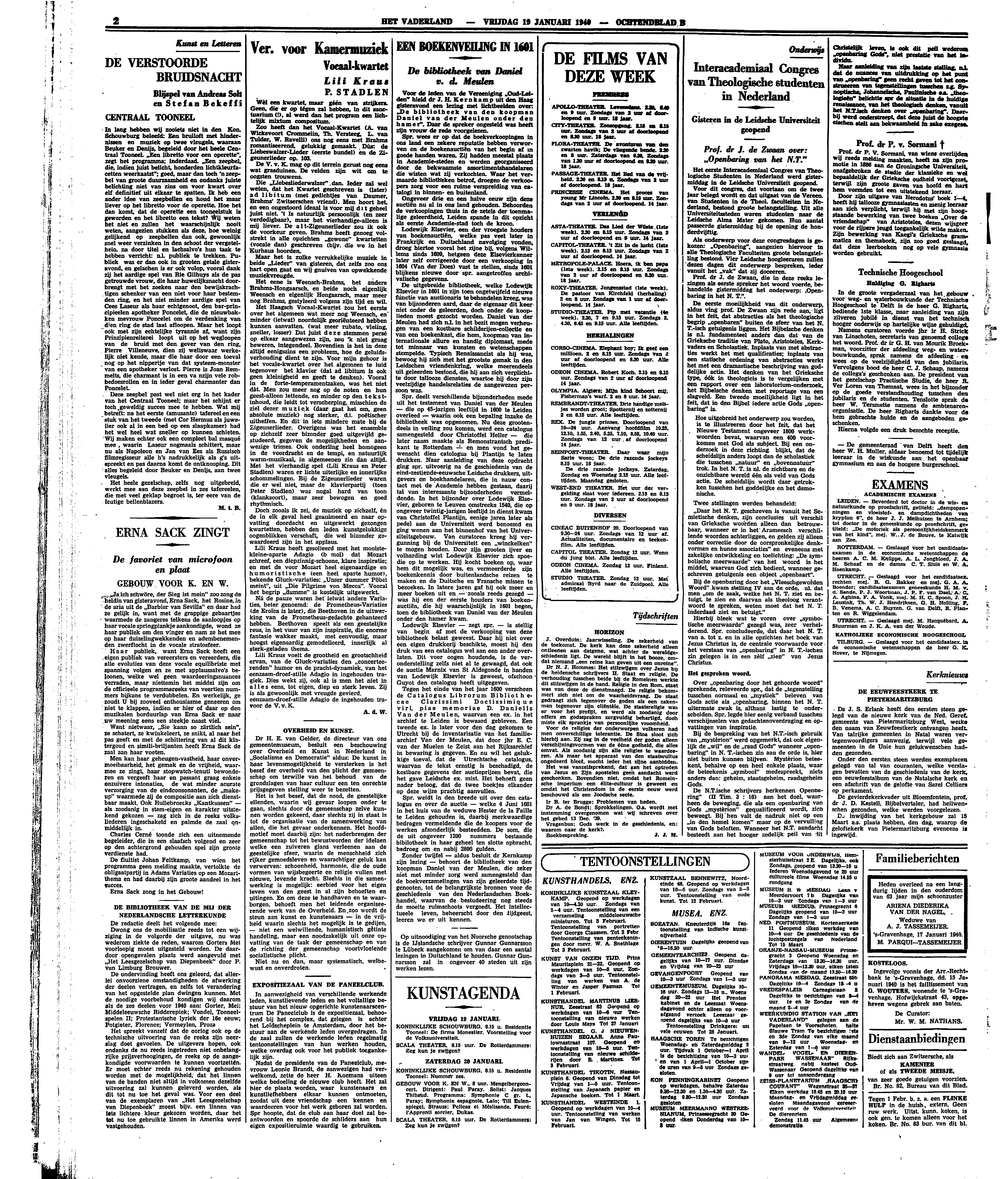 In lang hebben wij zooiets niet in den Kon. Schouwburg beleefd: Een bruiloft met hindernissen en muziek op twee vleugels, waaraan Beuker en Denijs, begeleid door het heele Centraal Tooneel. ‘Een libretto voor een operette’, zegt het programma; inderdaad. ‘Een zeepbel, die, indien juist belicht, honderden lichtkleurfacetten weerkaatst’; goed, maar dan toch 'n zeepbel van groote duurzaamheid en ondanks juiste belichting niet van zins om voor kwart over elf definitief uit elkaar te spatten. Ik heb een ander idee van zeepbellen en houd het maar liever op het libretto voor de operette. Hoe het dan komt, dat de operette een tooneelstuk is geworden en het libretto een tekst? Wij weten het niet en zullen het waarschijnlijk nooit weten, aangezien stukken als deze, hoe weinig gelijkend op zeepbellen dan ook, gewoonlijk snel weer verzinken in den schoot der vergetelheid na door titel en lachsalvo's hun taak te hebben verricht: n.l. publiek te trekken. Publiek was er dan ook in grooten getale gisteravond, en gelachen is er ook volop, vooral dank zij het aardige spel van Rie Gilhuys als de pas getrouwde vrouw, die haar huwelijksnacht doorbrengt met het zoeken naar den bewijskrachtigen schenker van een niet voor haar bestemden den ring, en het niet minder aardige spel van Cees Laseur als haar echtgenoot, den bar-principieelen apotheker Poncelet, die de nieuwbakken mevrouw Poncelet om de verdenking van dien ring de stad laat afloopen. Maar het loopt ook met zijn echtelijke tyrannie af, want zijn Prinzipienreiterei loopt uit op het wegloopen van de bruid met den gever van den ring, Pierre Villeneuve, dien zij weliswaar werkelijk niet kende, maar die haar door een toeval nog op het nippertje van dat systeem-monster van een apotheker verlost. Pierre is Joan Remmelts, die charmant is in een van zijn vele robbedoesrollen en in ieder geval charmanter dan Poncelet.