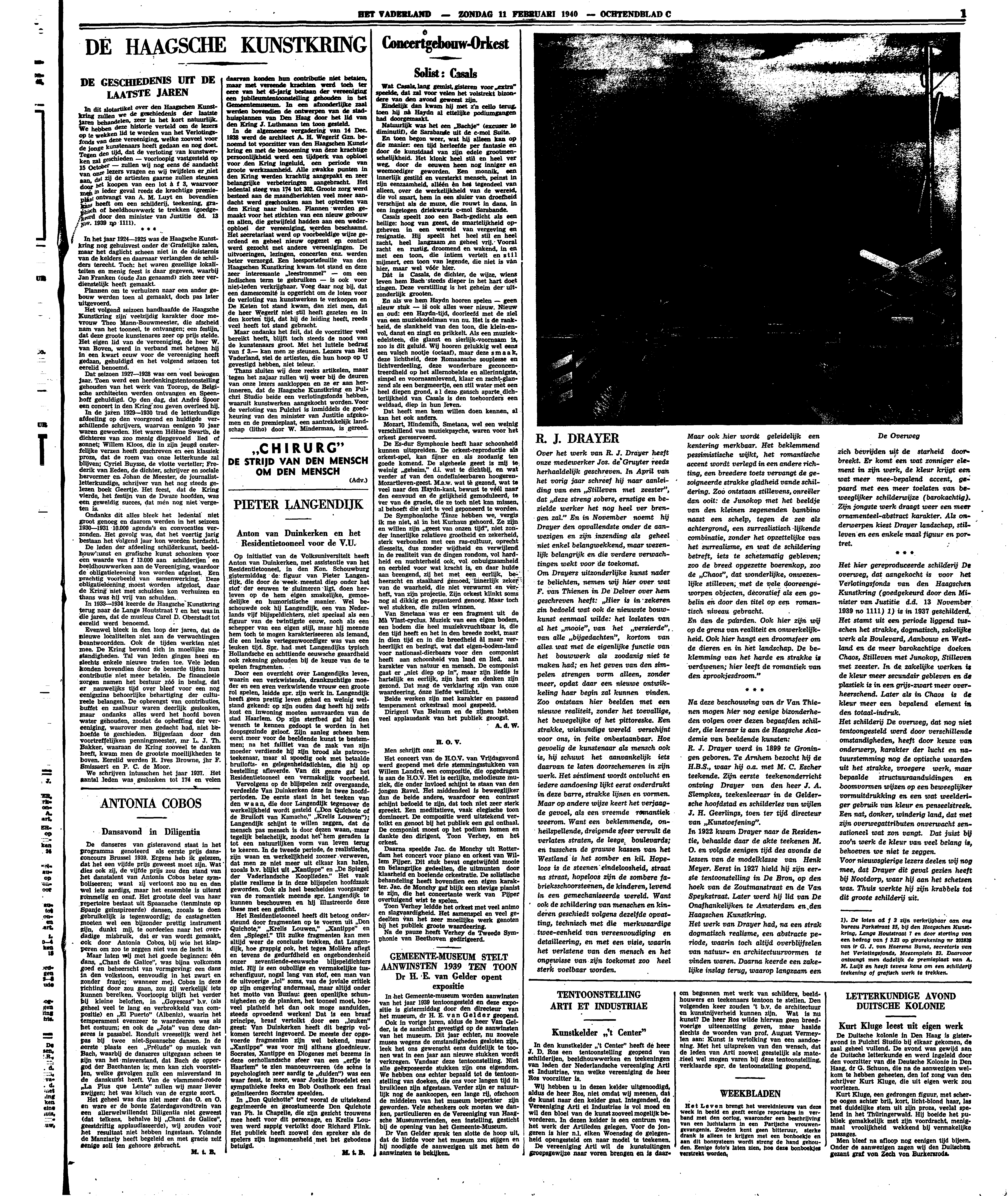 Op initiatief van de Volksuniversiteit heeft Anton van Duinkerken, met assistentie van het Residentietooneel, in den Kon. Schouwburg gistermiddag de figuur van Pieter Langendijk, die door de week meestal diep onder het stof der eeuwen te sluimeren ligt, doen herleven op de hem eigen smakelijke, gemoedelijke en humoristische manier. Wel beschouwde ook hij Langendijk, een van Nederlands vijf blijspeldichters, niet speciaal als een figuur van de twintigste eeuw, noch als een schepper van een eigen stijl, maar hij meende hem toch te mogen karakteriseeren als iemand, die een leuke vertegenwoordiger was van een leuken tijd. Spr. had met Langendijks typisch Hollandsche en achttiende eeuwsche geaardheid ook rekening gehouden bij de keuze van de te spelen fragmenten.