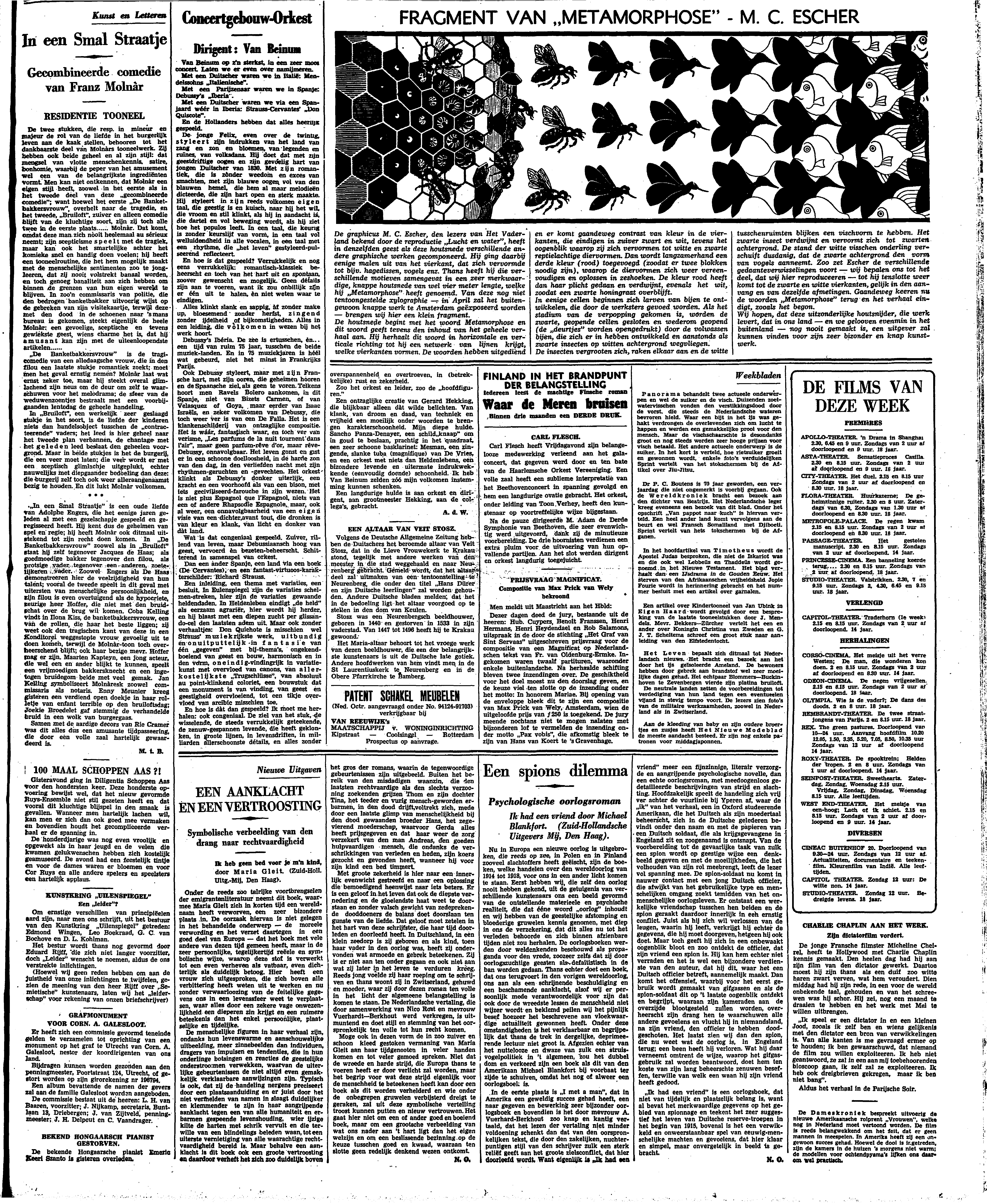 ‘In een Smal Straatje’ is een oude liefde van Adolphe Engers, die het eenige jaren geleden al met een gezelschapje gespeeld en geregisseerd heeft. Hij kent dus de geheimen van spel en regie; hij heeft Molnàr ook ditmaal uitstekend tot zijn recht doen komen. In ‘De Banketbakkersvrouw’ zoowel als in ‘Bruiloft’ staat hij zelf tegenover Jacques de Haas; als goedmoedige bakker tegenover den filou, als protsige vader tegenover een anderen, zoetelijkeren vader. Zoowel Engers als De Haas demonstreeren hier de veelzijdigheid van hun talent; vooral de tweede speelt in dit geval met uitersten van menschelijke persoonlijkheid, en zijn filou is even overtuigend als de hypocriete, zeurige heer Hoffer, die niet met den bruidschat over de brug wil komen. Coba Kelling vindt in Ilona Kiss, de banketbakkersvrouw, een van de rollen, die haar het beste liggen; zij weet ook den tragischen kant van deze in een Konditorei weggestopte vrouw gevoelig uit te doen komen, terwijl de Molnár-toon toch overheerschend blijft; ook haar bezige mevr. Hoffer mag er zijn. Maarten Kapteyn, een jong acteur, die wel een en ander blijkt te kunnen, speelt een vrijmoedigen bakkersknecht en een ingetogen bruidegom beide met veel gemak. Jan Kelling symboliseert Molnàresk zoowel commissaris als notaris. Enny Meunier kreeg gisteren een verdiend open doekje in haar rolletje van enfant terrible op den bruiloftsdag; Joekie Broedelet gaf stemmig de verhandelde bruid in een wolk van burgergaas.