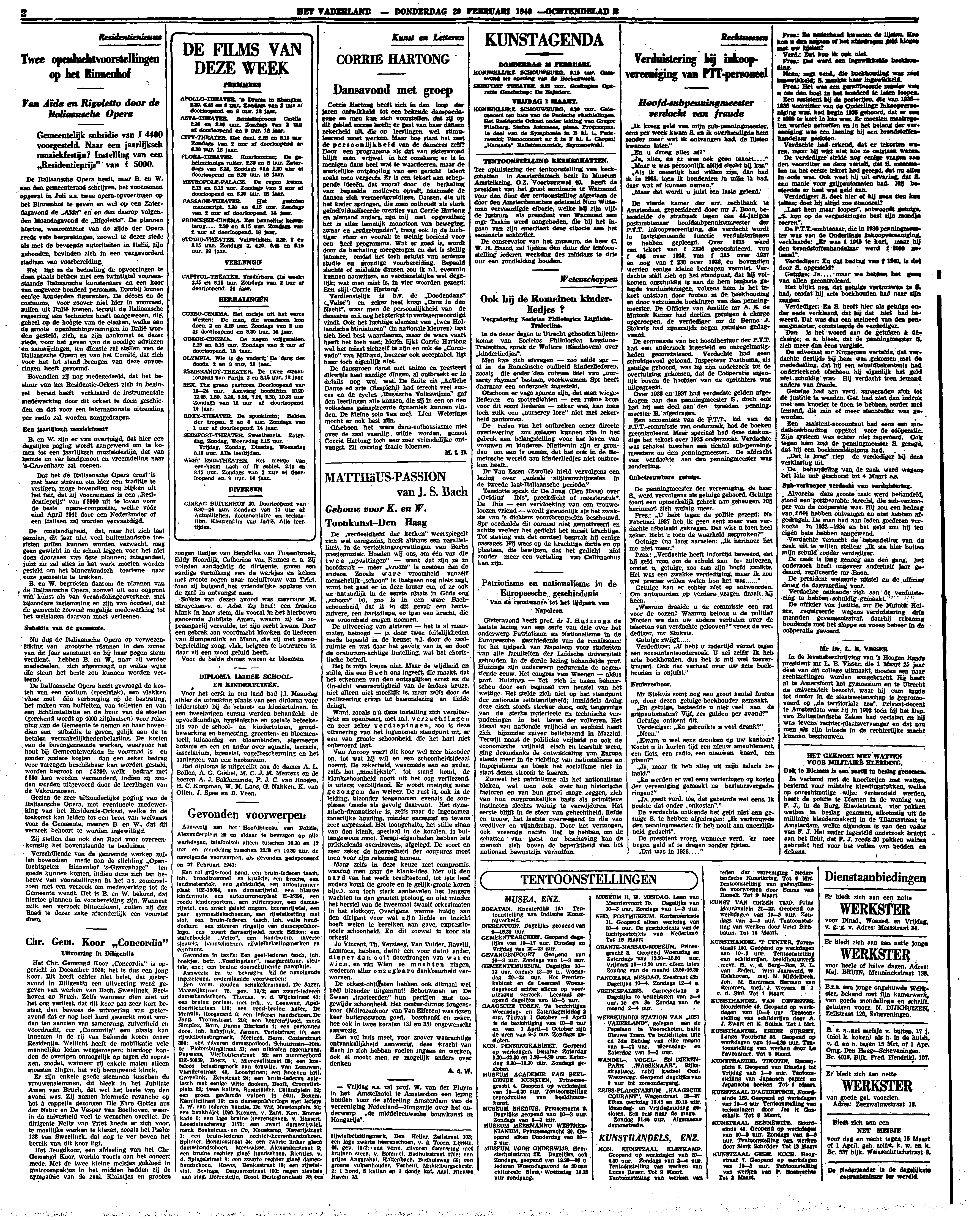 Verdienstelijk is b.v. de ‘Doodendans’ (‘Valse’) en zeker heel knap ‘Dans in den Nacht’, waar men de persoonlijkheid van de danseres m.i. nog het sterkst in vertegenwoordigd vindt. Ook het luchtige element van ‘twee Hollandsche Miniaturen’ (in nationale kleuren) laat zich heel best waardeeren, maar de ware vaart heeft het toch niet; hierin lijkt Corrie Hartong wel het minst zichzelf te zijn en ook de ‘Corcovado’ van Milhaud, hoezeer ook acceptabel, ligt haar toch eigenlijk niet.