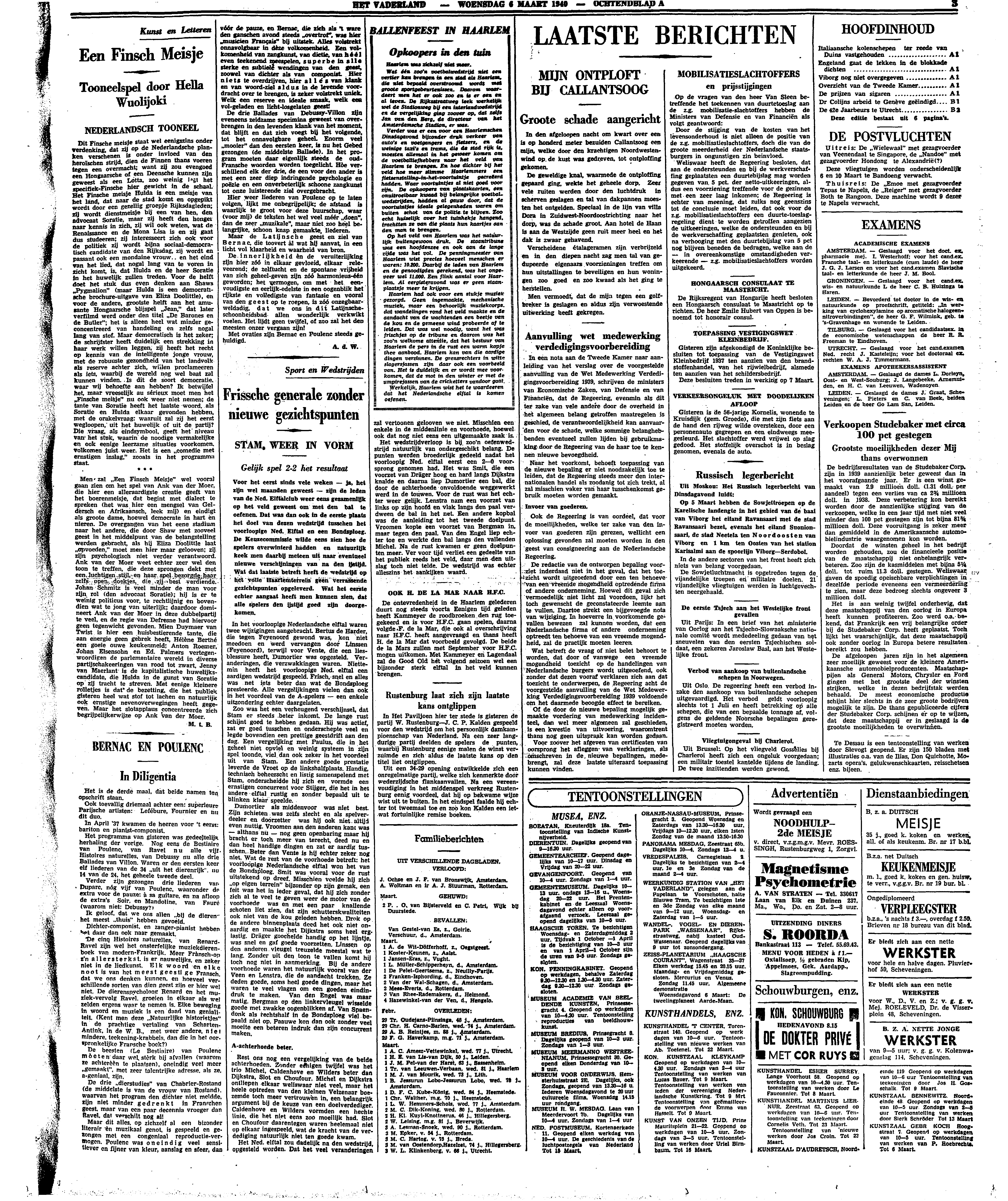 Men zal ‘Een Finsch Meisje’ wel vooral gaan zien om het spel van Ank van der Moer, die hier een alleraardigste creatie geeft van het boerenmeisje, dat begint met dialect te spreken (het was hier een mengsel van Geldersch en Afrikaansch, leek mij) en eindigt als groote dame, hoewel democrate in hart en nieren. De overgangen van het eene stadium naar het andere, die door Shaw met zooveel geest in het middelpunt van de belangstelling werden gebracht, als hij Eliza Doolittle laat ‘opvoeden,’ moet men hier maar gelooven; zij zijn psychologisch niet verder verantwoord. Ank van der Moer weet echter zeer wel den toon te treffen, die deze sprongen dekt met een luchtigen stijl, en haar spel bezorgde haar zelfs open doekjes, die zij best verdiende. Johan Schmitz is veel minder de man voor zijn rol (den advocaat Soratie); hij is er te weinig politicus voor, te rechtlijnig en bovendien wat te jong van uiterlijk; daardoor domineert Ank van der Moer in deze dubbelpartij te veel, en de regie van Defresne had hiervoor geen tegenwicht gevonden. Mien Duymaer van Twist is hier een huisbestierende tante, die aan energie geen gebrek heeft, Hélène Berthé een goeie ouwe keukenmeid; Anton Roemer, Johan Elsensohn en Ed. Palmers vertegenwoordigen de parlementaire wereld in diverse partijschakeeringen van rood tot zwart, Jenny van Maerlant is de kapitalistische huwelijkscandidate, die Hulda in de gunst van Soratie op zij tracht te streven. Met eenige kleinere rolletjes is dat de bezetting, die het publiek gisteren heel wat stof tot lachen en natuurlijk ook ernstige nevenoverwegingen heeft gegeven. Maar het slotapplaus concentreerde zich begrijpelijkerwijze op Ank van der Moer.