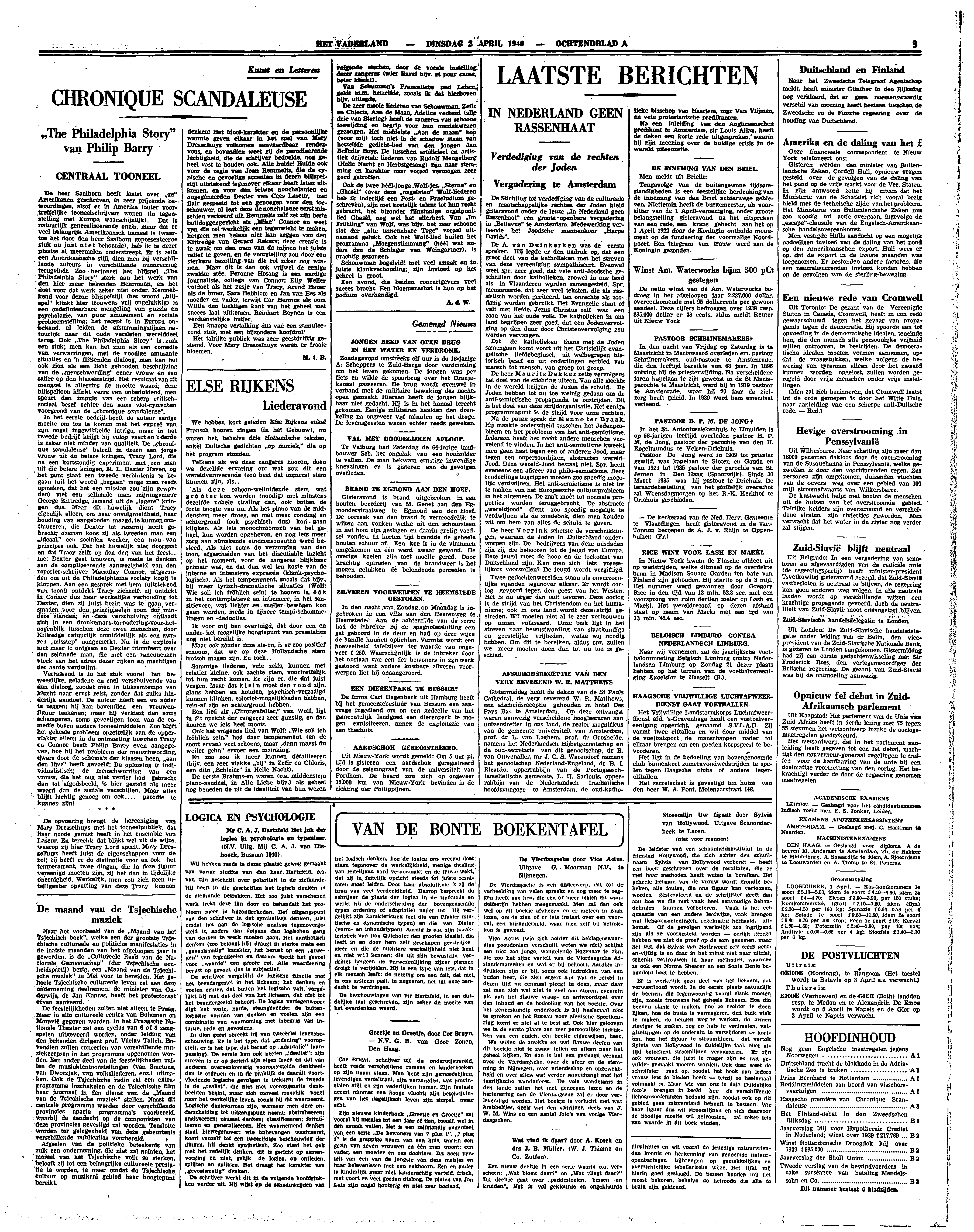 De heer Saalborn heeft laatst over ‘de’ Amerikanen geschreven, in zeer prijzende bewoordingen, alsof er in Amerika louter voortreffelijke tooneelschrijvers wonen (in tegenstelling met Europa waarschijnlijk). Dat is natuurlijk generaliseerende onzin, maar dat er veel belangrijk Amerikaansch tooneel is (waartoe het door den heer Saalborn gepresenteerde stuk nu juist niet behoorde), heb ik te dezer plaatse al meermalen onderstreept. Er is zelfs een Amerikaansche stijl, dien men bij verschillende auteurs in verschillende nuanceering terugvindt. Zoo herinnert het blijspel ‘The Philadelphia Story’ sterk aan het werk van den hier meer bekenden Behrmann, en het doet voor dat werk zeker niet onder. Kenmerkend voor dezen blijspelstijl (het woord ‘blijspel’ klinkt hier trouwens vrij ongelukkig) is een ondefinieerbare mengeling van puzzle en psychologie, van puur amusement en sociale probleemstelling; het recept is in Europa onbekend, al leiden de afstammingslijnen natuurlijk naar dit oude versleten werelddeel terug. Ook ‘The Philadelphia Story’ is zulk een stuk; men kan het zien als een comedie van verwarringen, met de noodige amusante situaties en 'n flitsenden dialoog, men kan het ook zien als een licht gehouden beschrijving van de ‘menschwording’ eener vrouw en een satire op den klassenstrijd. Het resultaat van dit mengsel is alleszins de moeite waard; deze blijspeltoon klinkt verre van onbeduidend, men speurt den impuls van een scherp critischsociaal besef achter den soms vlot-cynischen voorgrond van de ‘chronique scandaleuse’.