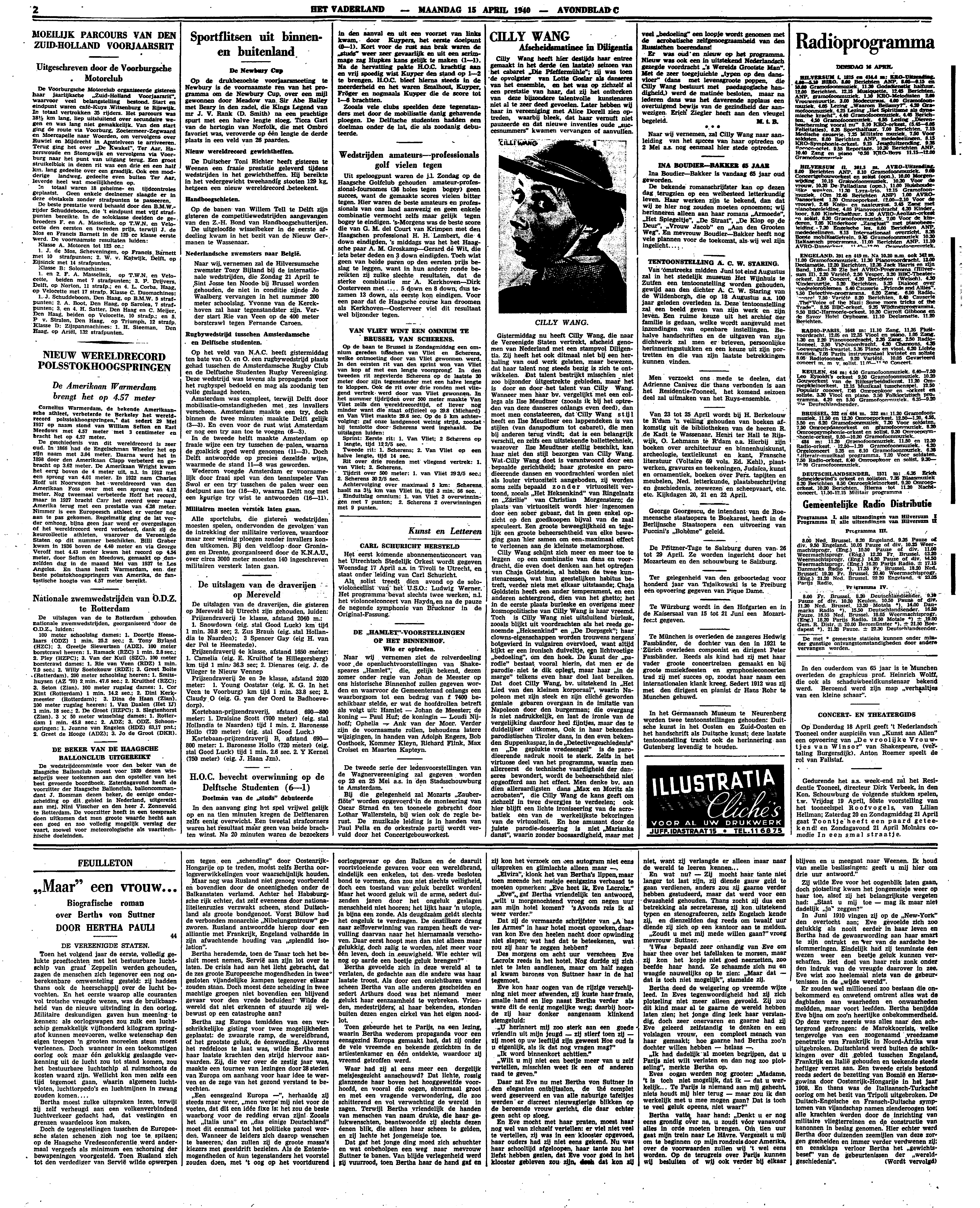 Er was oud en nieuw op het programma. Nieuw was ook een in uitstekend Nederlandsch gezegde voordracht ‘'s Werelds Grootste Man’. Met de zeer toegejuichte ‘typen op den dansvloer’ (dans met levensgroote poppen, die Cilly Wang bestuurt met paedagogische handigheid,) werd de matinée besloten, maar na iederen dans was het daverende applaus een overtuigend bewijs van de gezindheid der aanwezigen. Erich Ziegler heeft aan den vleugel begeleid.