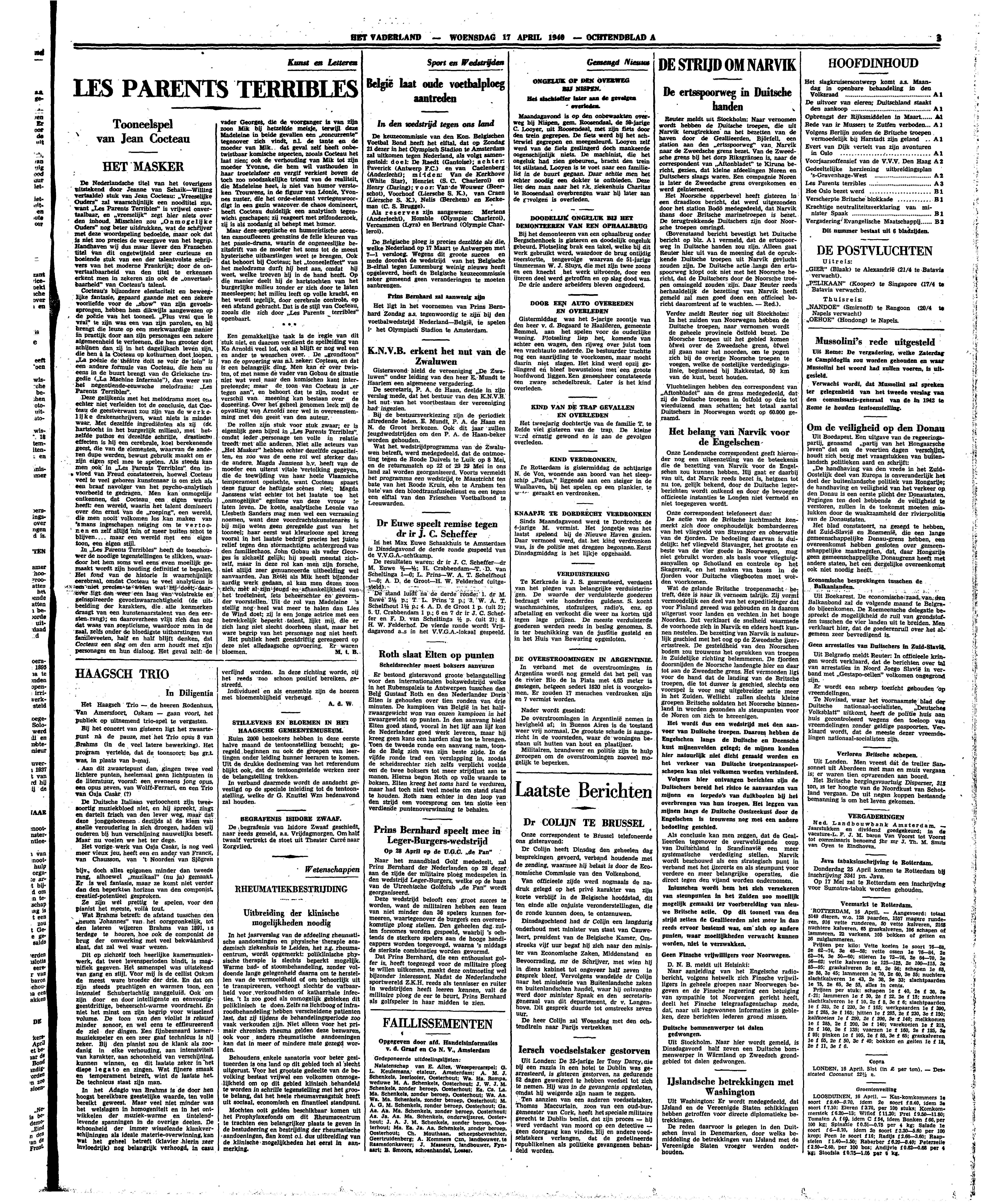 De Nederlandsche titel van het (overigens uitstekend door Jeanne van Schaik-Willing vertaalde) stuk van Jean Cocteau: ‘Vreeselijke Ouders’ zal waarschijnlijk een noodtitel zijn, want ‘Les Parents Terribles’ is vrijwel onvertaalbaar, en ‘vreeselijk’ zegt hier niets over den inhoud. Misschien zou ‘Onmogelijke Ouders’ nog beter uitdrukken, wat de schrijver met deze woordspeling bedoelde, maar ook dat is niet zoo precies de weergave van het begrip. Handhaven wij dus maar liever den Franschen titel van dit ongetwijfeld zeer curieuze en boeiende stuk van een der talentvolste schrijvers van het moderne Frankrijk; door de onvertaalbaarheid van den titel te erkennen erkent men in zekeren zin ook de ‘onvertaalbaarheid’ van Cocteau's talent.