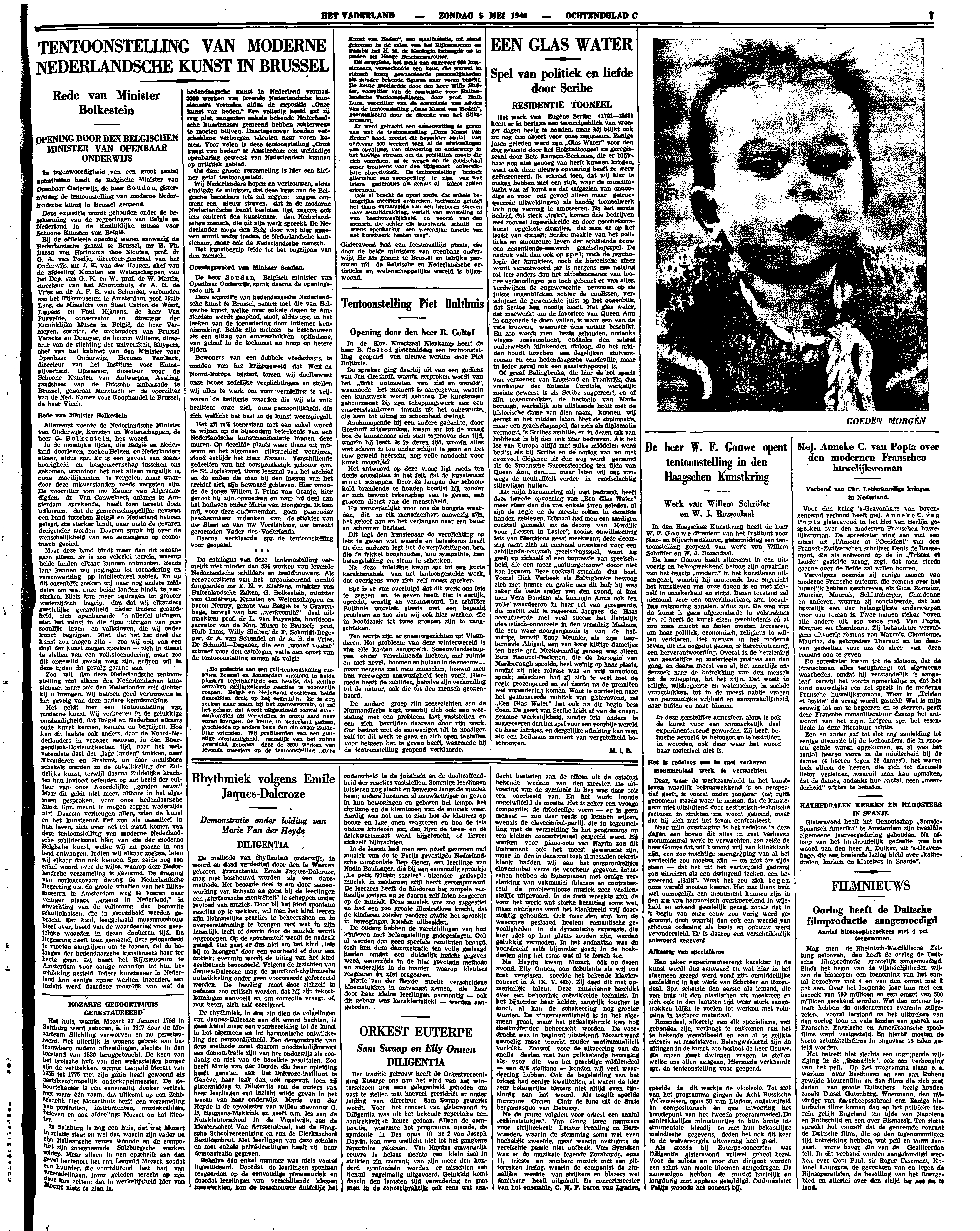 Als mijn herinnering mij niet bedriegt, heeft deze tweede opvoering van ‘Een Glas Water’ meer sfeer dan die van enkele jaren geleden, al zijn de regie en de meeste rollen in dezelfde handen gebleven. Ditmaal had men een aardigen cocktail gemaakt uit de decors van Hordijk voor ‘Lessen in Laster’, zoodat onwillekeurig iets van Sheridans geest meekwam; deze decorstijl leent zich nu eenmaal uitstekend voor een achttiende-eeuwsch gezelschapsspel, want hij geeft op zichzelf al een impressie van speelschheid, die een meer ‘natuurgetrouw’ decor niet kan leveren. Deze cocktail smaakte dus best. Vooral Dirk Verbeek als Balingbroke bewoog zich met humor en gratie aan dit hof; hij was zeker de beste speler van den avond, al kon men Vera Bondam als koningin Anna ook ten volle waardeeren in haar rol van geregeerde, die meent zelf te regeeren. Jacques de Haas accentueerde met veel succes het lichtelijk idealistisch-onnoozele in den vaandrig Masham, die een waar doorgangshuis is van de hofintrige, terwijl Enny Meunier, als zijn teerbeminde Abigail, een van haar kittige dametjes ten beste gaf. Merkwaardig genoeg was alleen Bets Ranucci-Beckman, die de hertogin van Marlborough speelde, heel weinig op haar plaats, omdat zij niet rolvast was en vrij monotoon sprak; misschien had zij zich te veel met de regie geoccupeerd en zal daarin na de première wel verandering komen. Want te oordeelen naar het geamuseerde publiek van gisteravond, zal ‘Een Glas Water’ het ook na dit begin best doen. De geest van Scribe leidt af van de onaangename werkelijkheid, zonder iets anders te suggereeren dan het spel voor een voorbije wereld en haar intriges, en dergelijke afleiding kan men als een heilzaam moment van vergetelheid beschouwen.