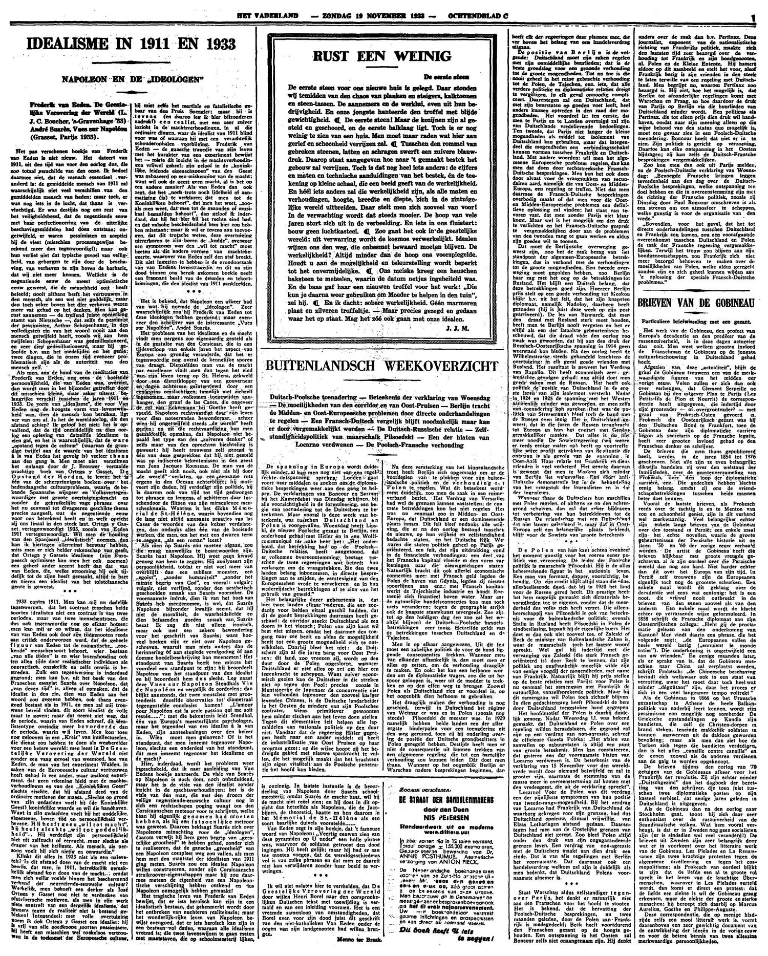 Van Eeden zegt in zijn boekje, dat 't fameuze woord van Napoleon: ‘Veertig eeuwen zien van deze pyramiden op U neder’ een holle phrase was, waarvoor de soldaten getroost den dood ingingen. Hij heeft gelijk; maar hij had er aan toe moeten voegen, dat de wereldgeschiedenis vol is van zulke phrasen en dat men ze daaruit niet kan verwijderen zonder haar beeld te verwringen.