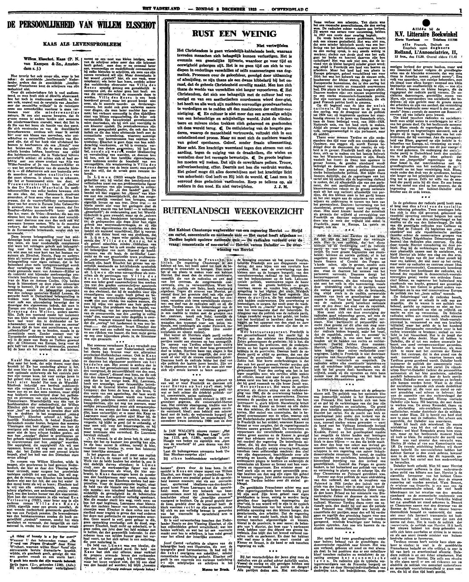 Kaas! Hoe ongezocht stroomt deze inleiding naar het boek, dat mijn thema voor deze kroniek is! En hoe zonderling alweer is het, dat men hier te lande den man, die dit bij uitstek nationale onderwerp als het centrale punt van zijn roman koos, tot voor eenige jaren in het geheel niet, maar dan ook in het geheel niet kende! Pas toen de Wereldbibliotheek indertijd een herdruk publiceerde van zijn vergeten Lijmen, hoorde men zijn naam zoo nu en dan eens noemen, maar altijd nog luidkeels overschetterd door het pallieteren en pirroenen van zijn medevlaming Felix Timmermans. Waarschijnlijk was één van de hoofdoorzaken dier onbekendheid, dat Willem Elsschot zich niet verwaardigd had, onze zin voor ‘leut’ en jovialiteit te streelen door zich uit te drukken in het zogenaamd ‘sappig Vlaamsch’: Elsschot schreef n.l. bijna behoorlijk Nederlandsch, ik bedoel Noord-Nederlandsch zonder fouten, hetgeen den meesten Vlamingen niet best afgaat; men zou hun dit overigens ook weer niet kwalijk nemen, als zij maar niet de kans schoon hadden gezien, om van hun ‘sappige’ dialect te profiteeren en het geheele taalgebied benoorden den Moerdijk te overstroomen met hun ‘sappige’ woorden. Die sappigheid, die sappigheid! Als wij niet oppassen, komen wij nog eens om in al het sap, dat het Zuiden ons met zooveel kracht inspuit, alsof het heil van den Dietschen stam ervan afhing!