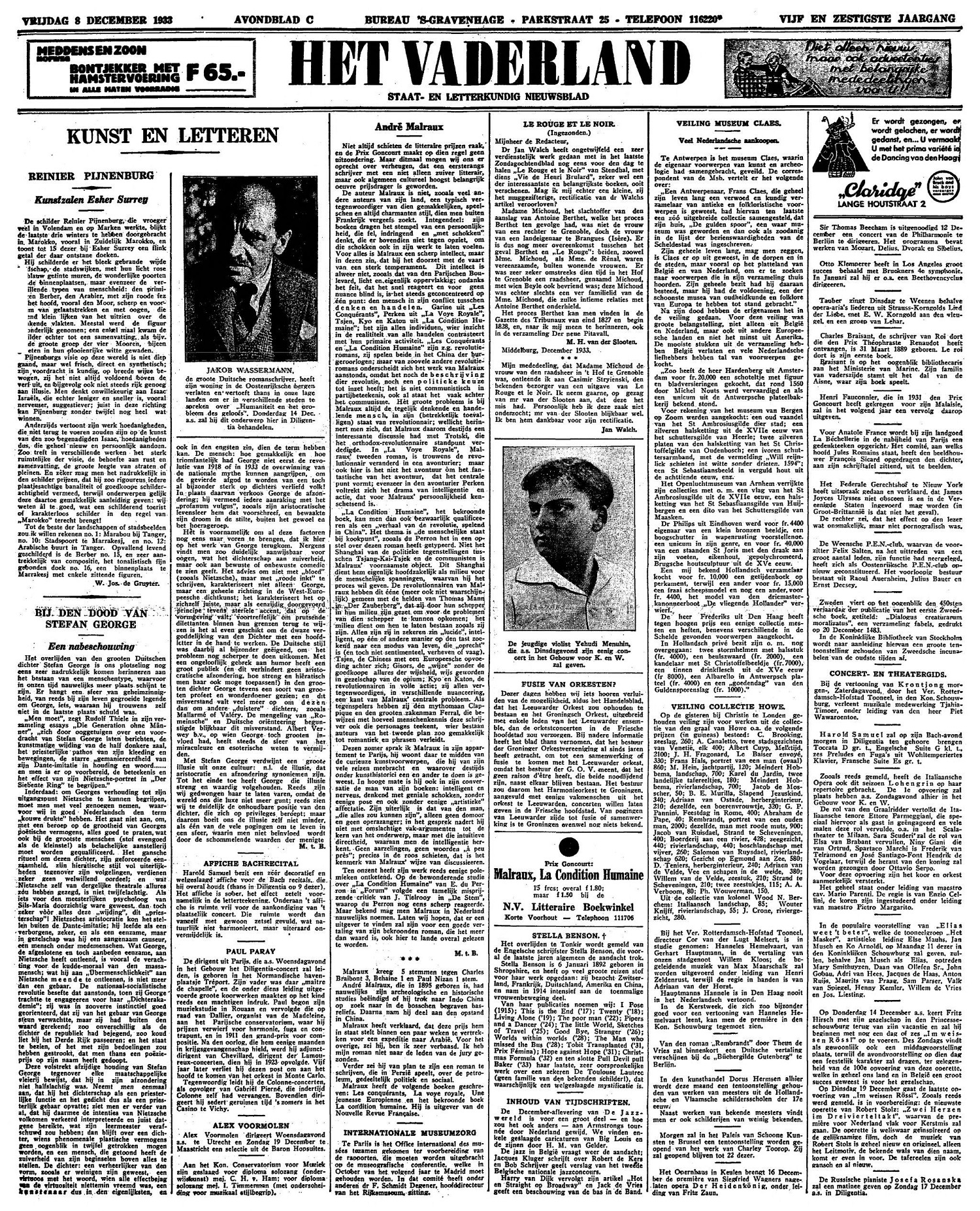 Met Stefan George verdwijnt een groote illusie uit onze cultuur: nl. de illusie, dat aristocratie en afzondering synoniemen zijn. Tot het einde toe heeft George die illusie streng en waardig volgehouden. Reeds zijn wij gedwongen haar te laten varen, omdat de wereld ons die luxe niet meer gunt; reeds zien wij te duidelijk de onhoudbare positie van den dichter, die zich op privileges beroept; maar daarom boeit ons de illusie zelf niet minder, als één van de vele pogingen om te leven in een sfeer, waarin men niet beïnvloed wordt door de schommelende waarden der menigte.