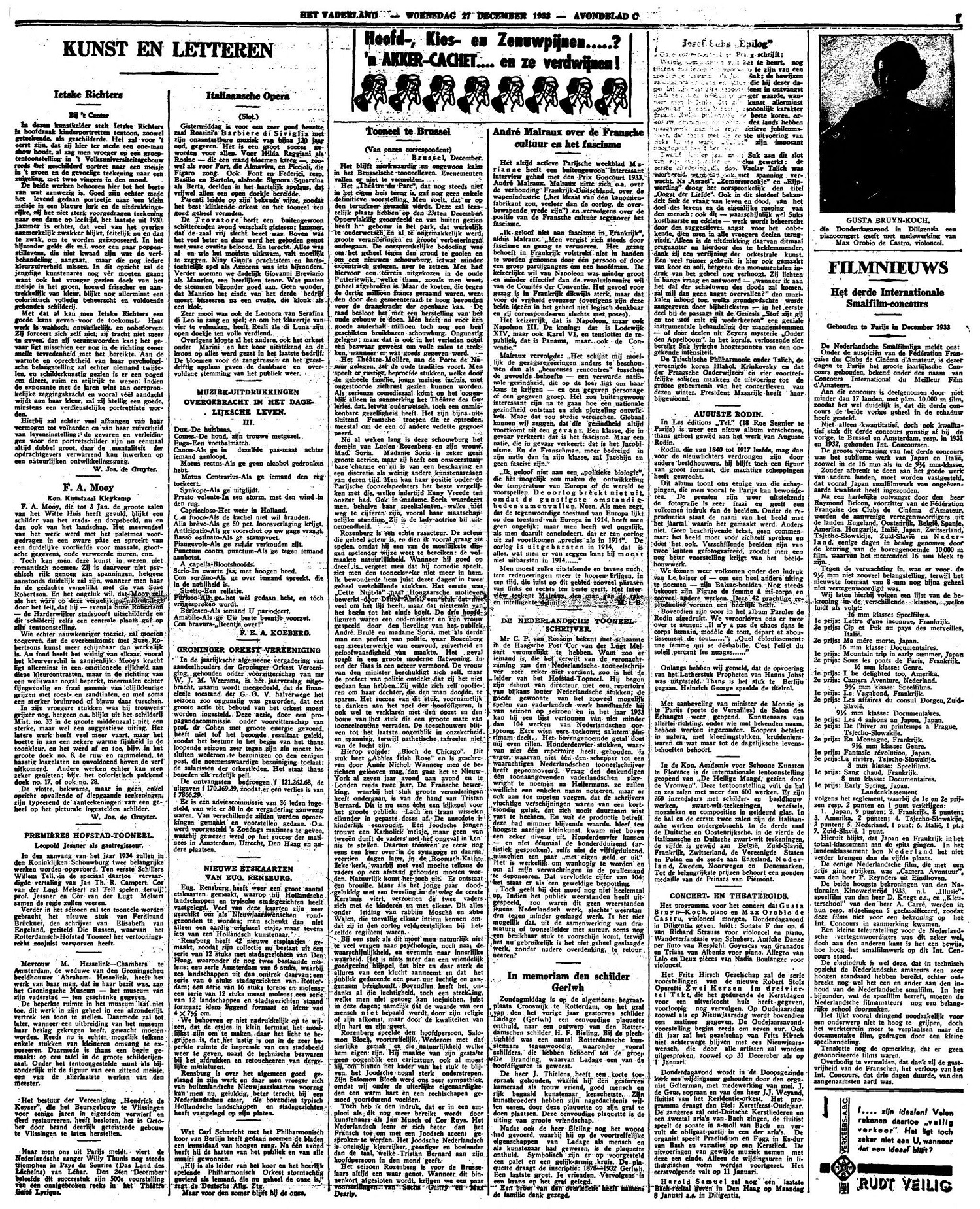 Het altijd actieve Parijsche weekblad Marianne heeft een buitengewoon interessant interview gehad met den Prix Goncourt 1933, André Malraux. Malraux uitte zich o.a. over de verhouding Frankrijk-Duitschland, over de wapenindustrie (‘het ideaal van den kanonnenfabrikant zou, veeleer dan de oorlog, de overbewapende vrede zijn’) en vervolgens over de positie van de Fransche cultuur tegenover het fascisme.