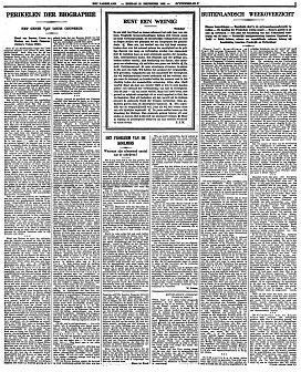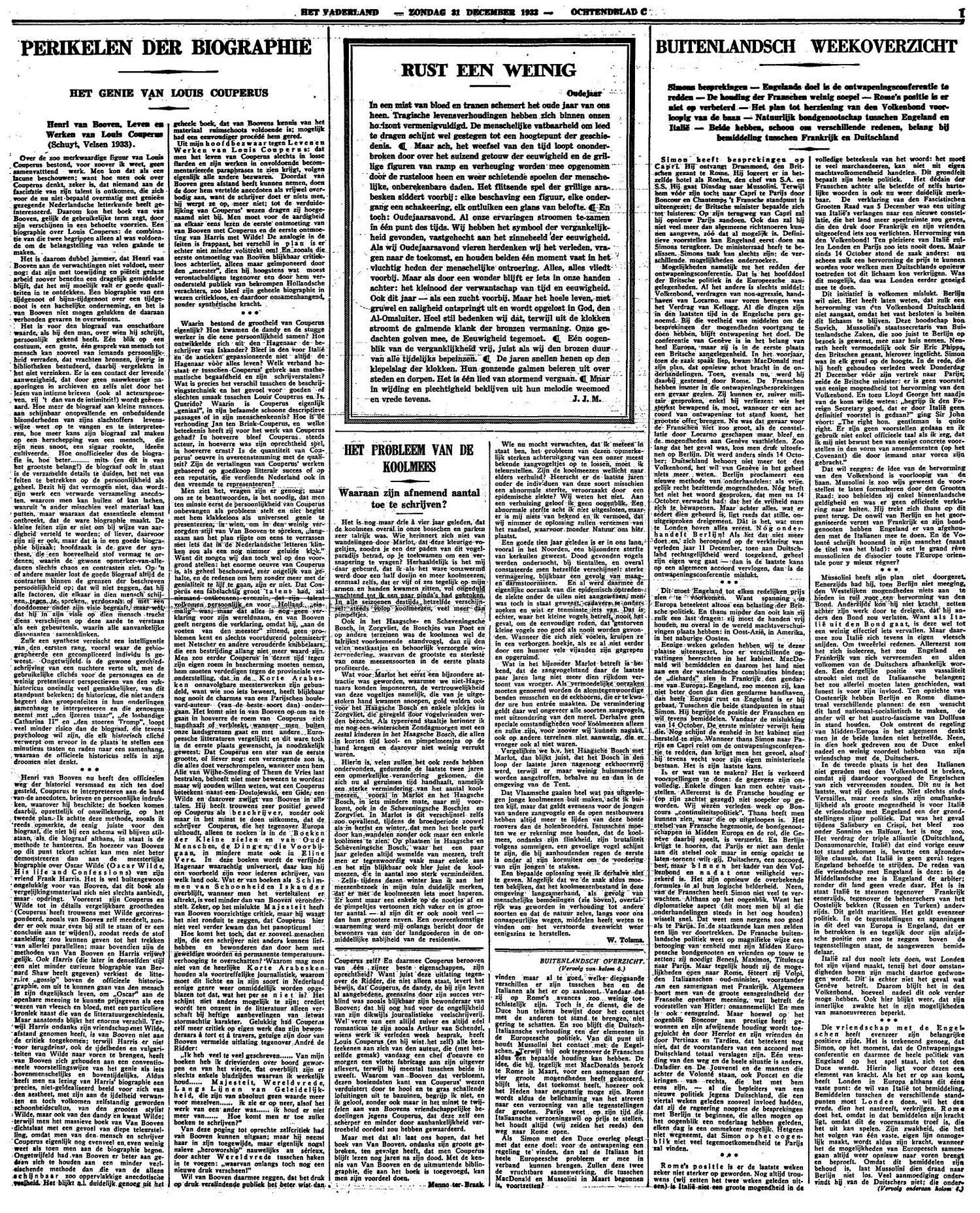 Het is daarom dubbel jammer, dat Henri van Booven aan de verwachtingen niet voldoet, meer nog: dat zijn met toewijding en piëteit gedane arbeid zoover beneden een dragelijk gemiddelde blijft, dat het mij moeilijk valt er goede qualiteiten in te ontdekken. Een biographie van een tijdgenoot of bijna-tijdgenoot over een tijdgenoot is een hachelijke onderneming, en het is Van Booven niet mogen gelukken de daaraan verbonden gevaren te overwinnen.
