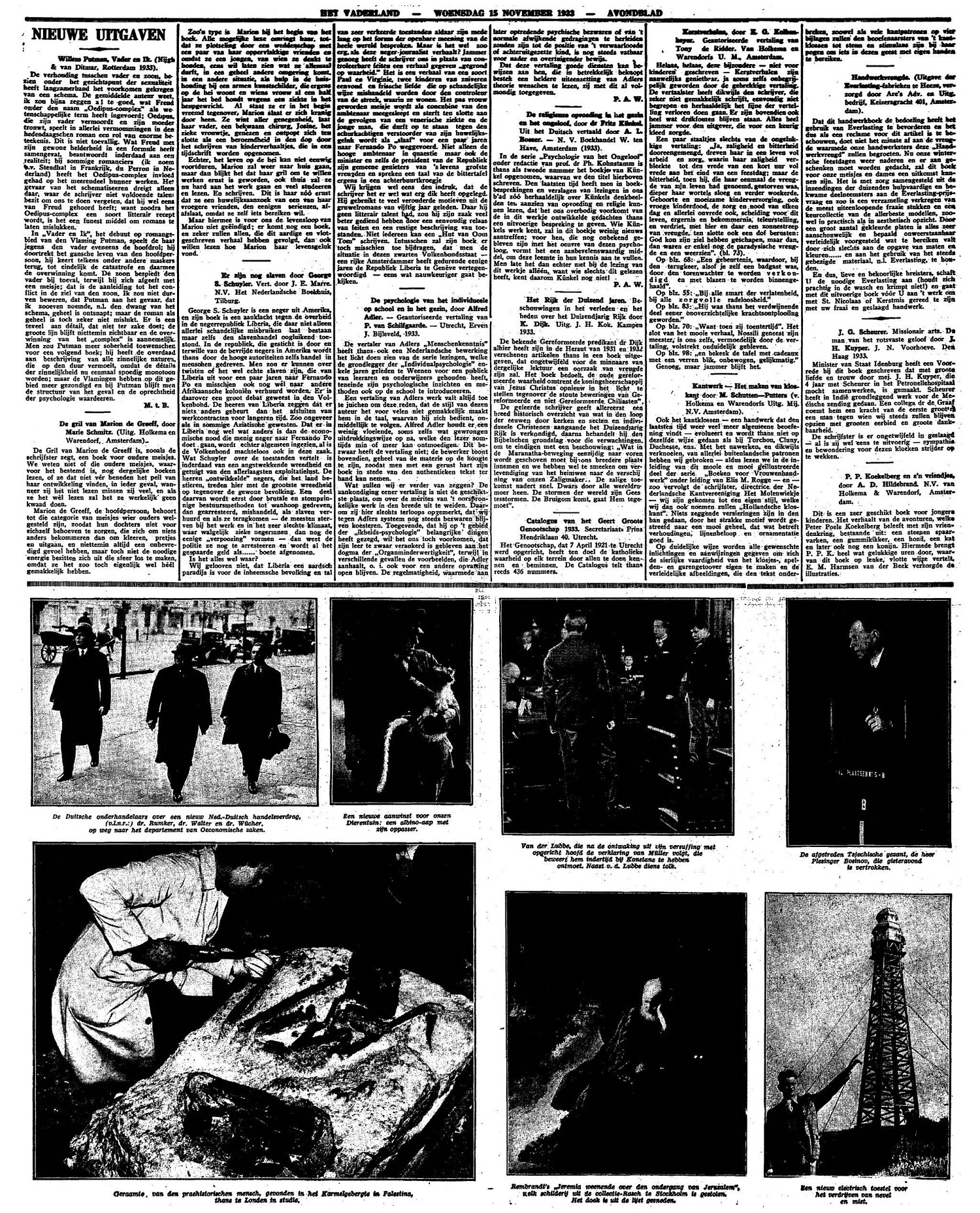 In ‘Vader en Ik’, het debuut op romangebied van den Vlaming Putman, speelt de haat jegens den vader eveneens de hoofdrol; hij doortrekt het gansche leven van den hoofdpersoon, hij keert telkens onder andere maskers terug, tot eindelijk de catastrofe en daarmee de overwinning komt. De zoon bespiedt den vader bij toeval, terwijl hij zich afgeeft met een meisje; dat is de aanleiding tot het conflict in de ziel van den zoon. Ik zou niet durven beweren, dat Putman aan het gevaar, dat ik zooeven noemde, n.l. de dwang van het schema, geheel is ontsnapt; maar de roman als geheel is toch zeker niet mislukt. Er is een teveel aan détail, dat niet ter zake doet; de groote lijn blijf niettemin zichtbaar en de overwinning van het ‘complex’ is aannemelijk. Men zou Putman meer soberheid toewenschen voor een volgend boek; hij heeft de overdaad van beschrijving van alle zinnelijke naturen die op den duur vermoeit, omdat de détails der zinnelijkheid nu eenmaal spoedig monotoon worden; maar de Vlamingen hebben op dit gebied meer gezondigd en bij Putman blijft men de structuur van het geval en de oprechtheid der psychologie waardeeren.