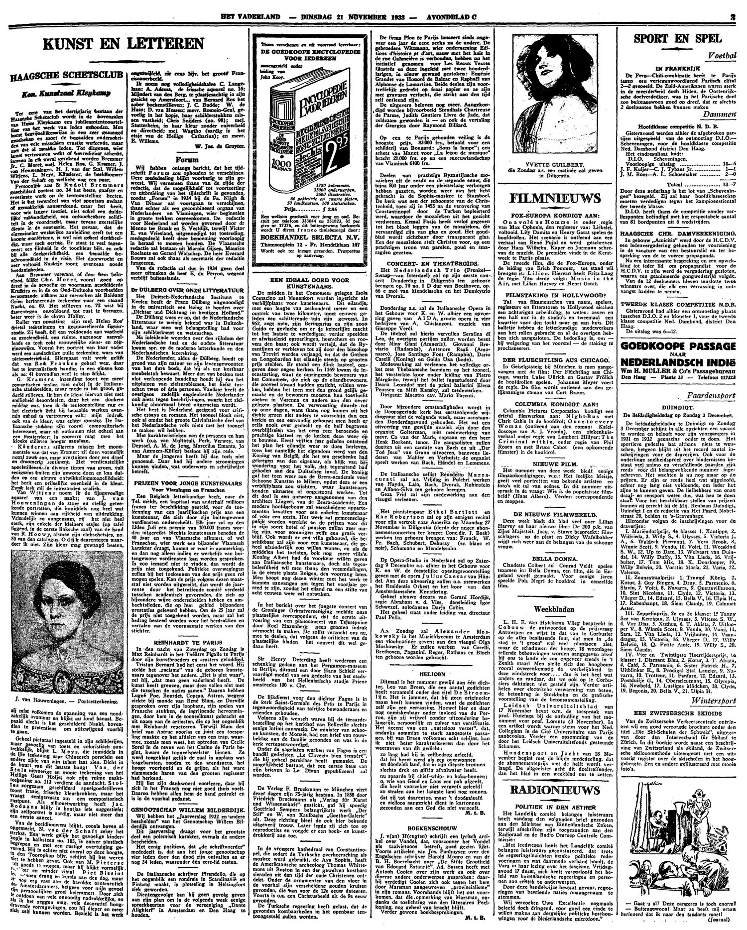 J. v(an) H(eugten) schrijft een lyrisch artikel over Vondel, dat, voorzoover het Vondel als taalvirtuoos betreft, goed gezien lijkt. Voorts artikelen van Jos. Panhuysen over den Engelschen schrijver Harold Monro en van dr B.H. Boerebacht over ‘De Stille Grootheid van Edouard Estannié’. Ad. Sassen heeft met Antoon Coolen over zijn werk en ook over diverse andere onderwerpen gesproken: daarbij verdedigt Coolen zich ook tegen het hem door Marsman aangewreven ‘provincialisme’ in zijn romans. Voorshands blijft het ons voorkomen, dat die opmerking van Marsman, ondanks de toelichting van den litterairen Peelkoning, nog geheel van kracht blijft.