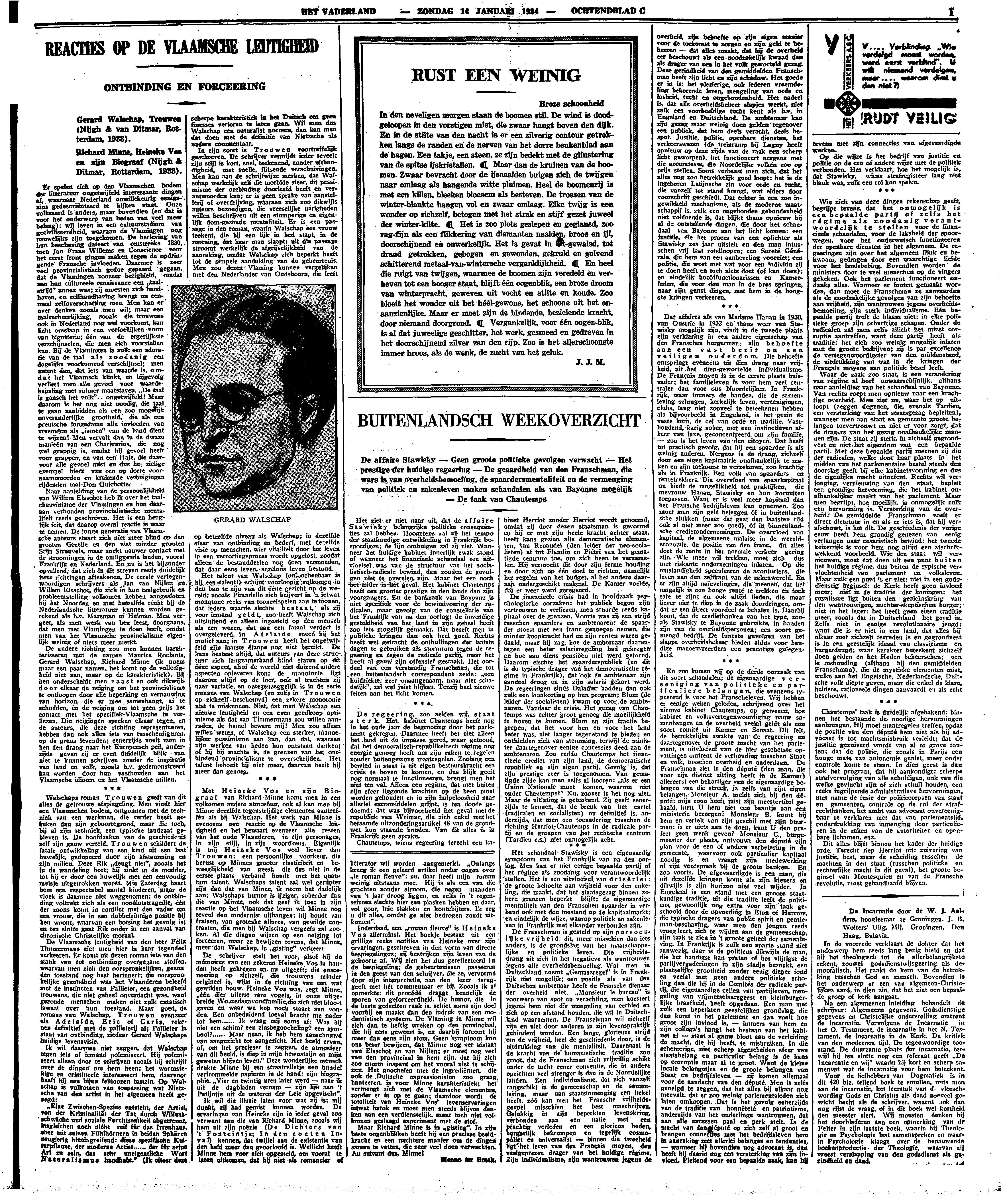Ik wil daarmee niet zeggen, dat Walschap tegen iets of iemand polemiseert. Hij polemiseert alleen door te schrijven zooals hij schrijft over de dingen om hem heen; het wormstekige en crimineele interesseert hem, daarvoor heeft hij een bijna feilloozen tastzin. Op Walschap is volkomen van toepassing wat Nietzsche van den artist in het algemeen heeft gezegd: