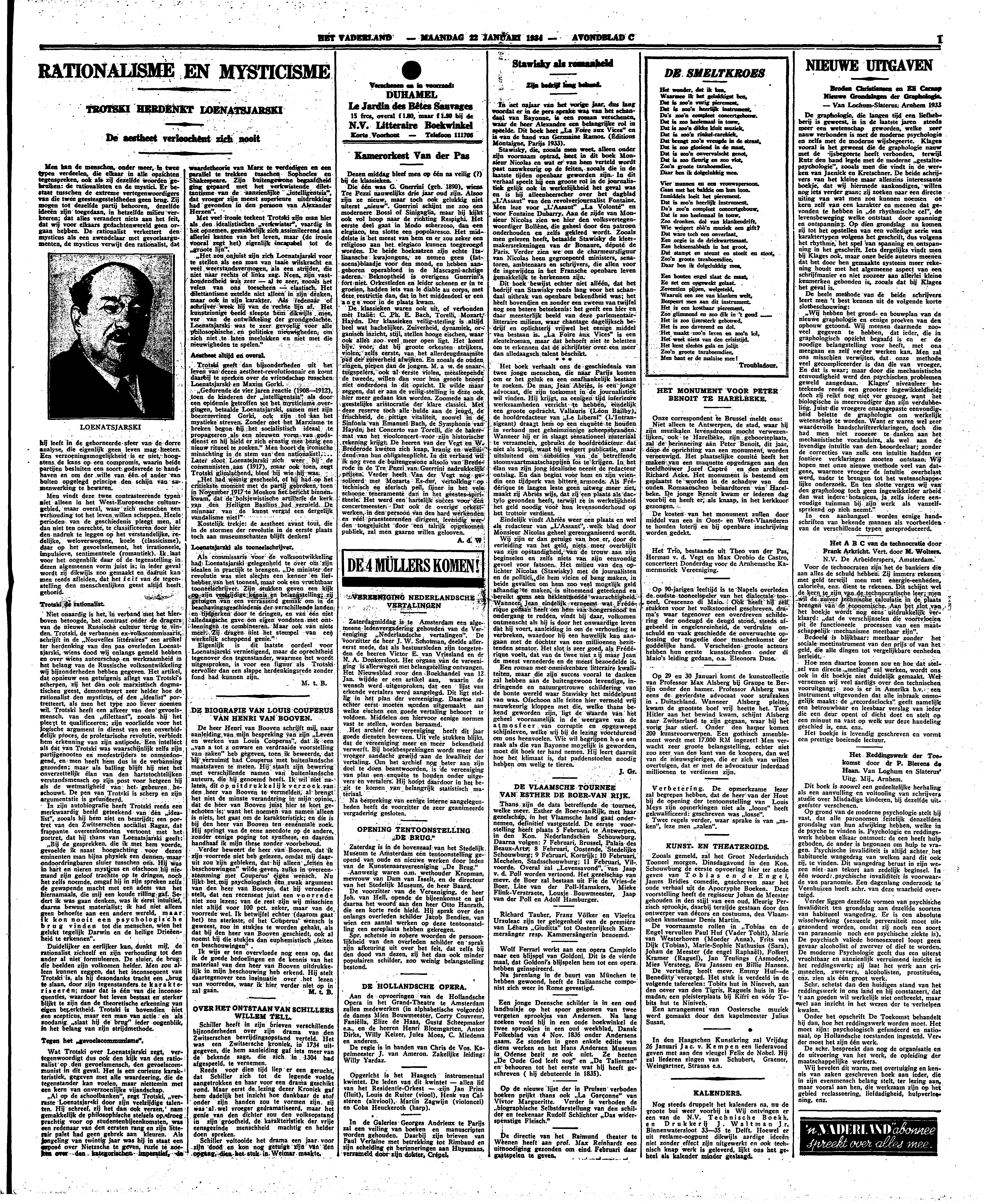 Niet onaardig is het, in verband met het hierboven betoogde, het contrast onder de dragers van de nieuwe Russische cultuur terug te vinden. Trotski, de verbannen ex-volkscommissaris, schrijft in de Nouvelles littéraires een artikel ter herdenking van den pas overleden Loenatsjarski, wiens dood wij onlangs gemeld hebben en over wiens auteurschap en werkzaamheid in het belang van de Russische volksontwikkeling wij bijzonderheden hebben gegeven. Het artikel, dat opnieuw een getuigenis aflegt van Trotski's scherpen, zij het dan ook marxistisch dogmatischen geest, demonstreert zeer helder hoe de rationalist den mysticus, of den ‘idealist’ portretteert, als men het type zoo liever noemen wil. Trotski heeft een afkeer van den gevoelsmensch, van den ‘dilettant’, zooals hij het pleegt te qualificeeren; zijn voorliefde voor het logische argument in dienst van een onverbiddelijk proces, de proletarische revolutie, verbiedt hem erkenning van zijn antipode. Een intellect als dat van Trotski was waarschijnlijk zelfs zijn partijgenooten en medestrijders te onmeedoogend, en men heeft hem dus in de verbanning gezonden; maar als balling blijft hij met het onverzettelijk élan van den hartstochtelijken verstandsmensch op zijn post voor hetgeen hij als de wetmatigheid van het gebeuren beschouwt. De pen van Trotski is scherp en zijn argumentatie is gefundeerd.