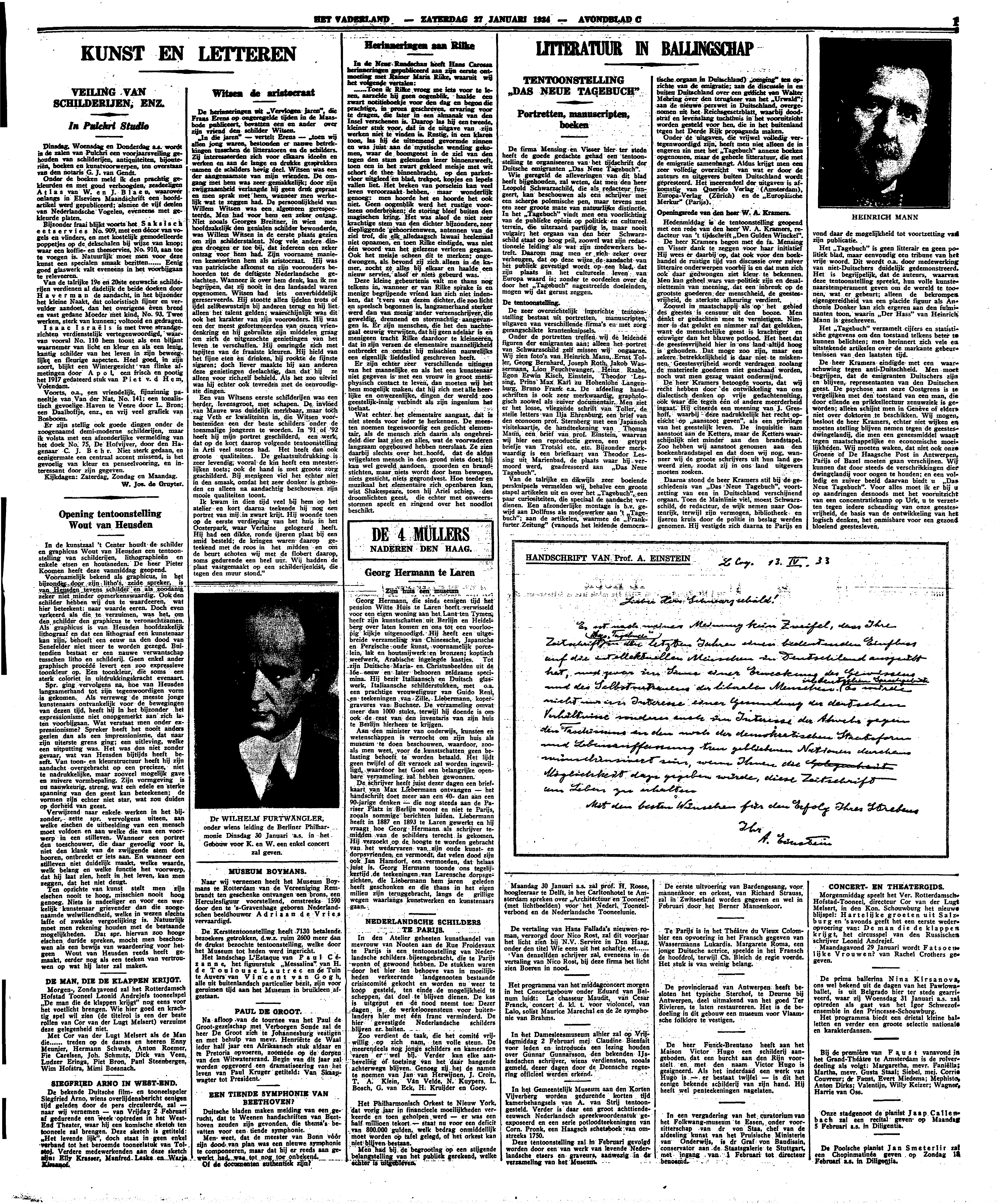Onder de portretten treffen wij de leidende figuren der emigranten aan; alleen het portret van Schwarzschild zelf missen wij ongaarne. Wij zien foto's van Heinrich Mann, Ernst Toller, Georg Bernhard, Joseph Roth, Jakob Wasserman, Lion Feuchtwanger, Heinz Raabe, Egon Erwin Kisch, Einstein, Theodor Lessing, Prins Max Karl zu Hohenlohe Langenburg, Bruno Frank e.a. De afdeeling handschriften is ook zeer merkwaardig, graphologisch zoowel als zuiver documentair. Men ziet er het losse, vliegende schrift van Toller, de steile letters van Ilja Ehrenburg, een brief van den econoom prof. Sternberg met een Japansch visitekaartje, de handteekening van Thomas Mann, een brief van prof. Einstein, waarvan wij hier een reproductie geven, een getypt briefje van Trotski etc. etc. Bijzonder merkwaardig is een briefkaart van Theodor Lessing uit Marienbad, de plaats waar hij vermoord werd, geadresseerd aan Das Neue Tagebuch.